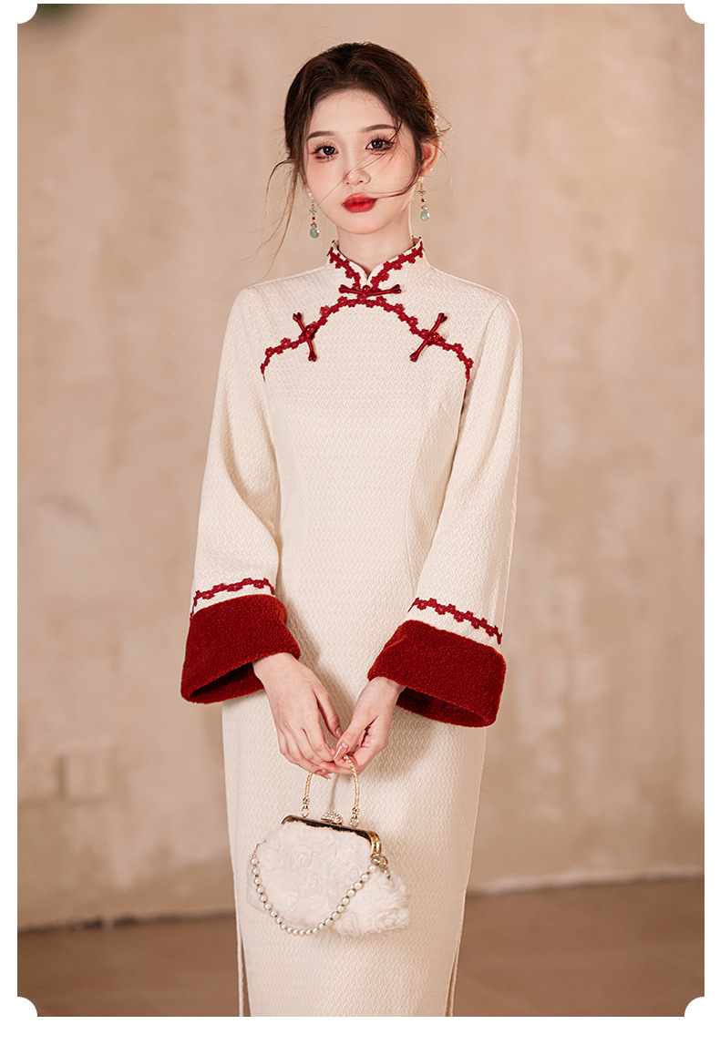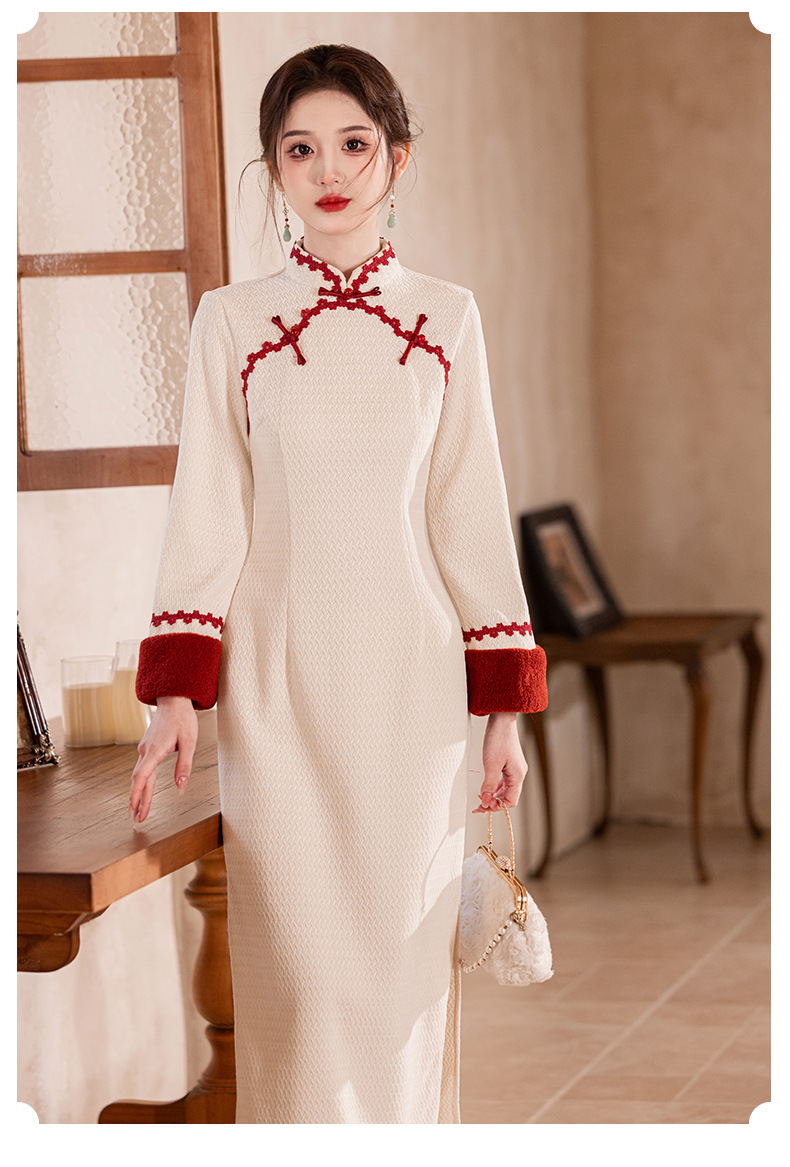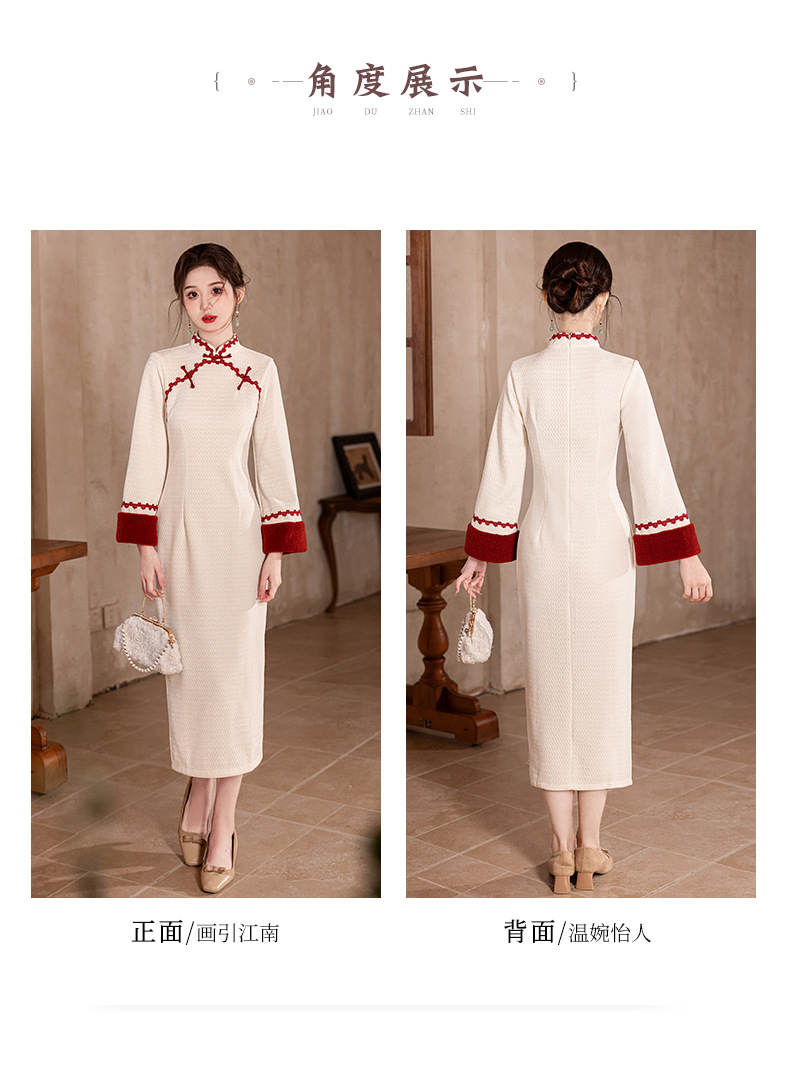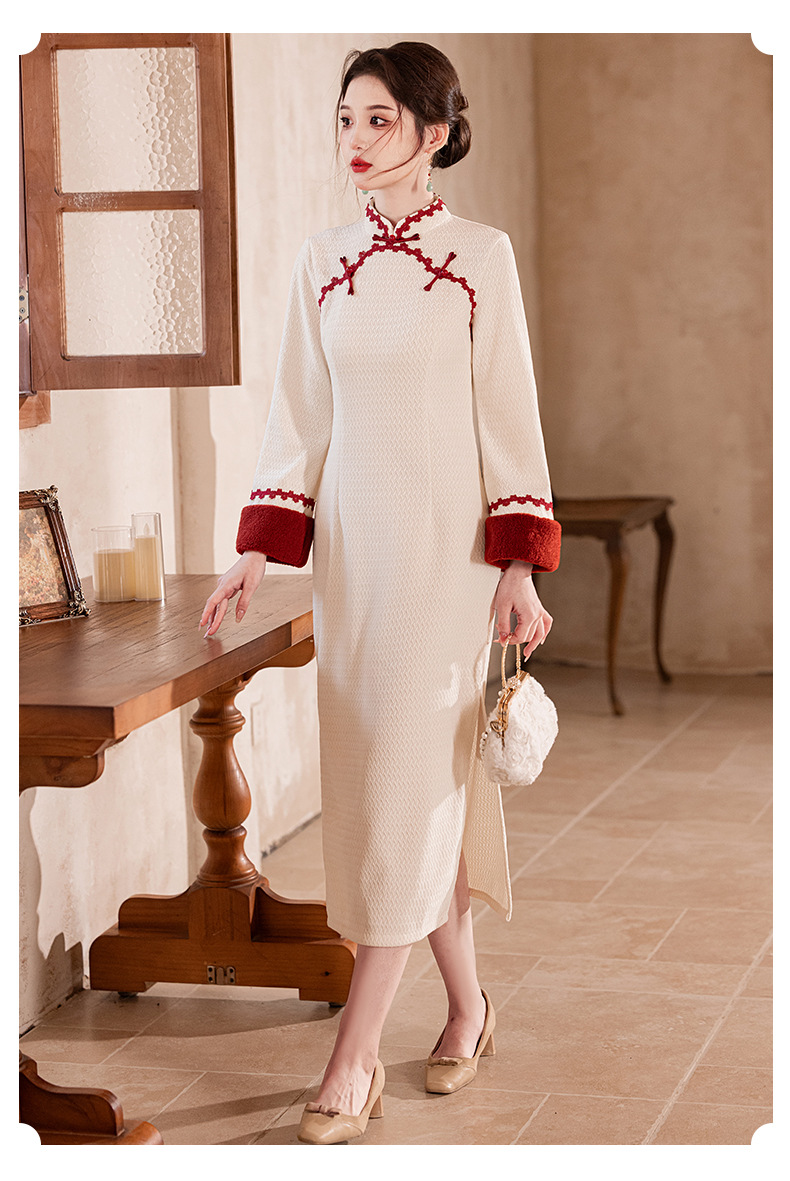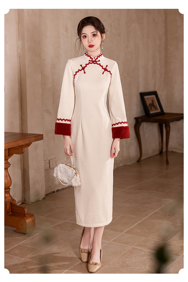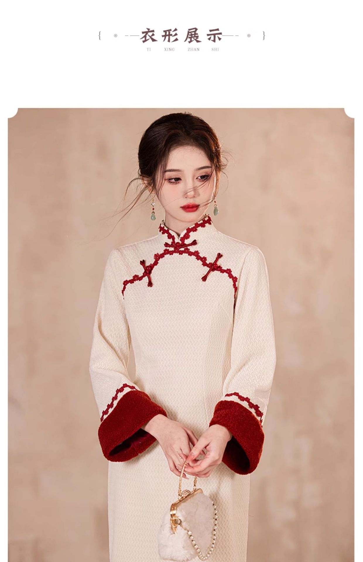 LSB3232 复古白色旗袍年轻款2024新款改良新中式素雅减龄加绒冬季修身长袖 商品图2