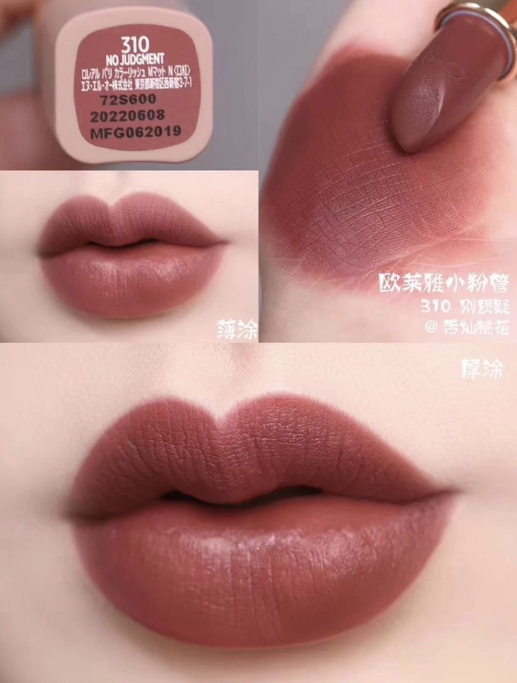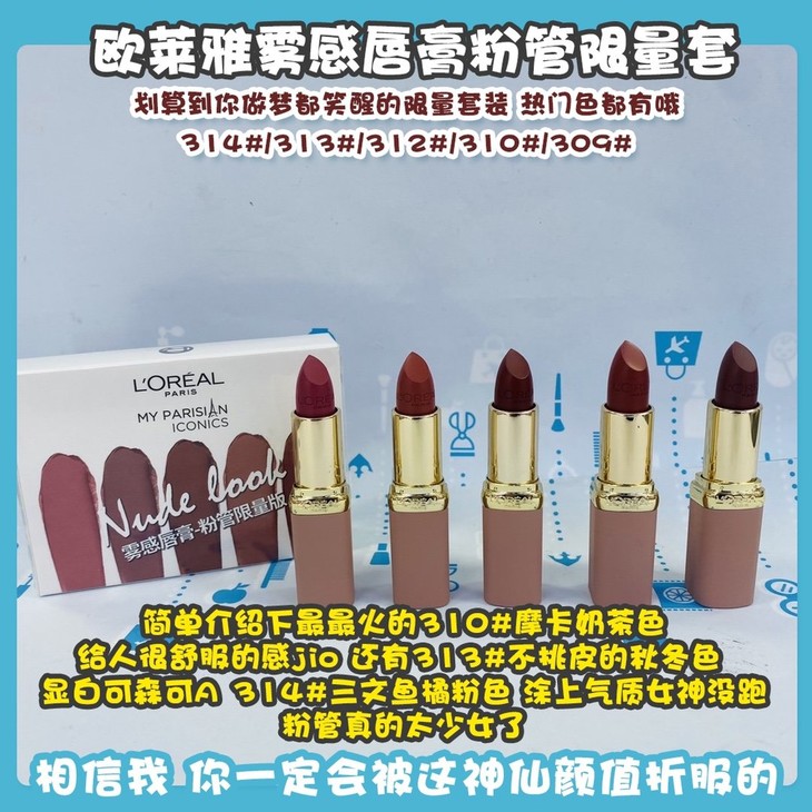 欧莱雅雾感唇膏粉管限量套👍划算到你做梦都笑醒的限量套装,热门色都有哦🔥。上嘴哑光但是不干,滋润度很可的💦。简单介绍下最最火的310#摩卡奶茶色☕,给人很舒服的感jio,还有313#不挑皮的秋冬色,显白可森可A👄,314#三文鱼橘粉色,涂上气质女神没跑。粉管真的太少女了💗,精致的猪猪女孩怎么能不入,每个颜色都能轻松hold住,相信我,你一定会被这神仙颜值折服的。送礼绝佳🥰,太美啦反正我是舍不得送出去~套装口红色号:314#/313#/312#/310#/309#