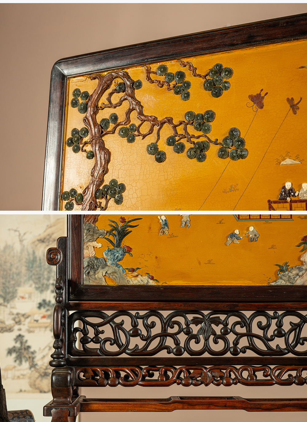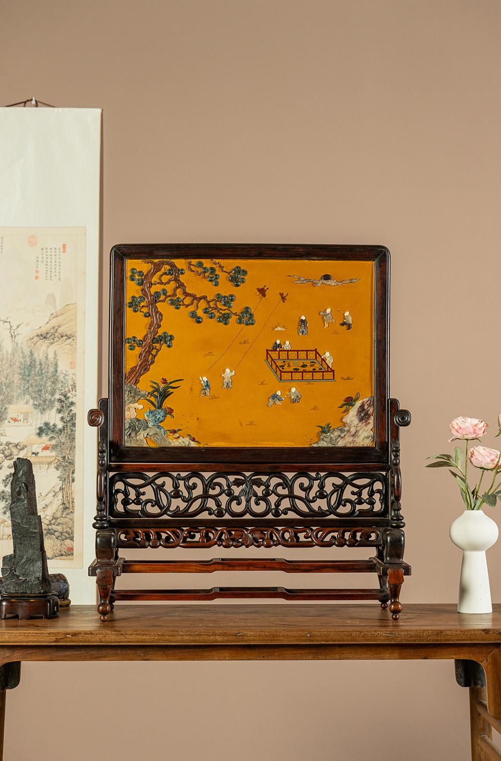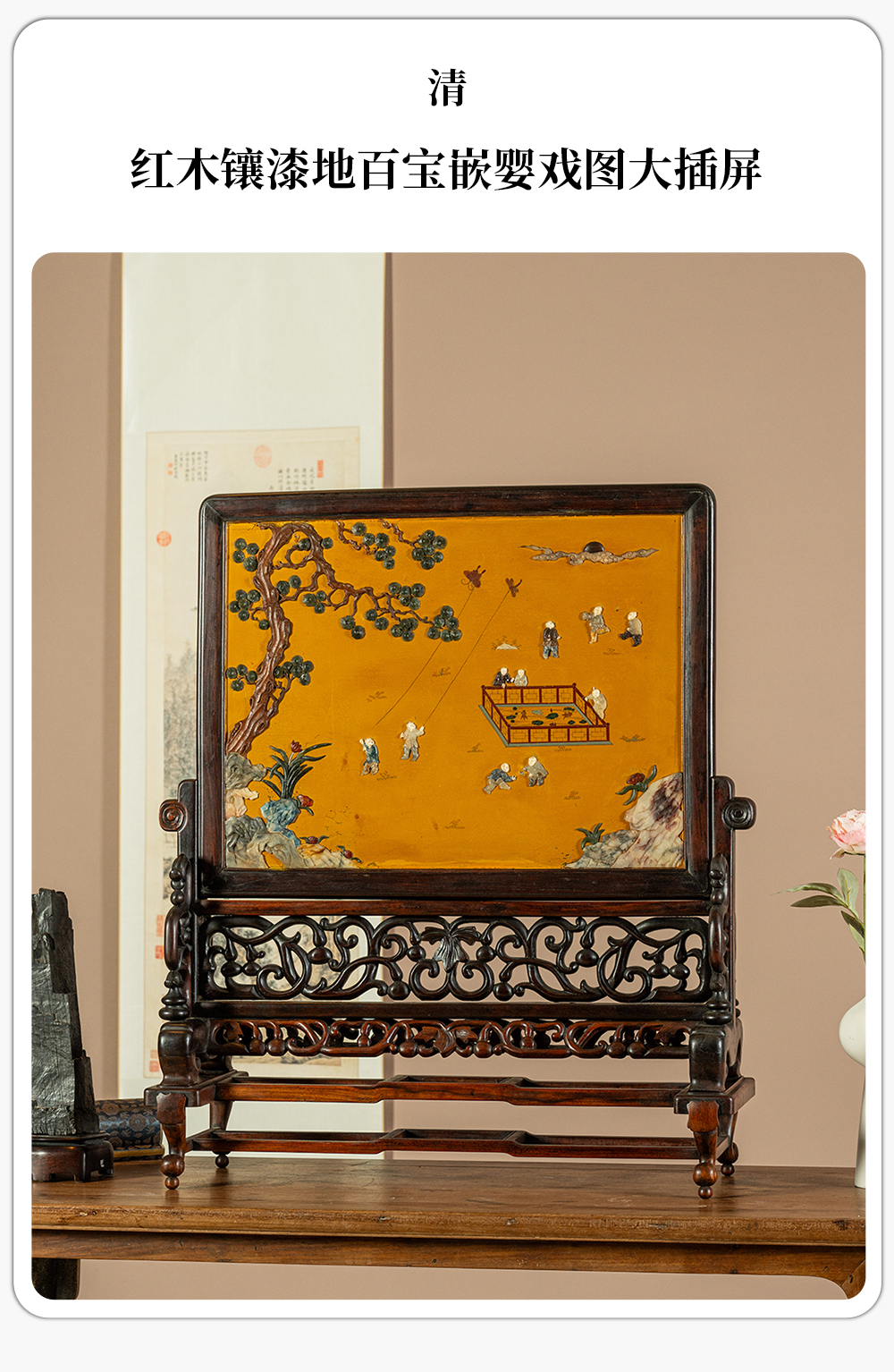 清 红木镶漆地百宝嵌婴戏图大插屏