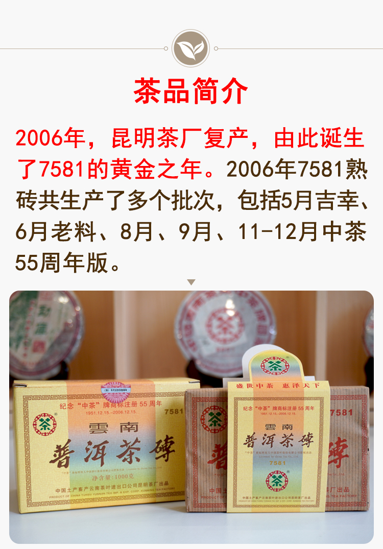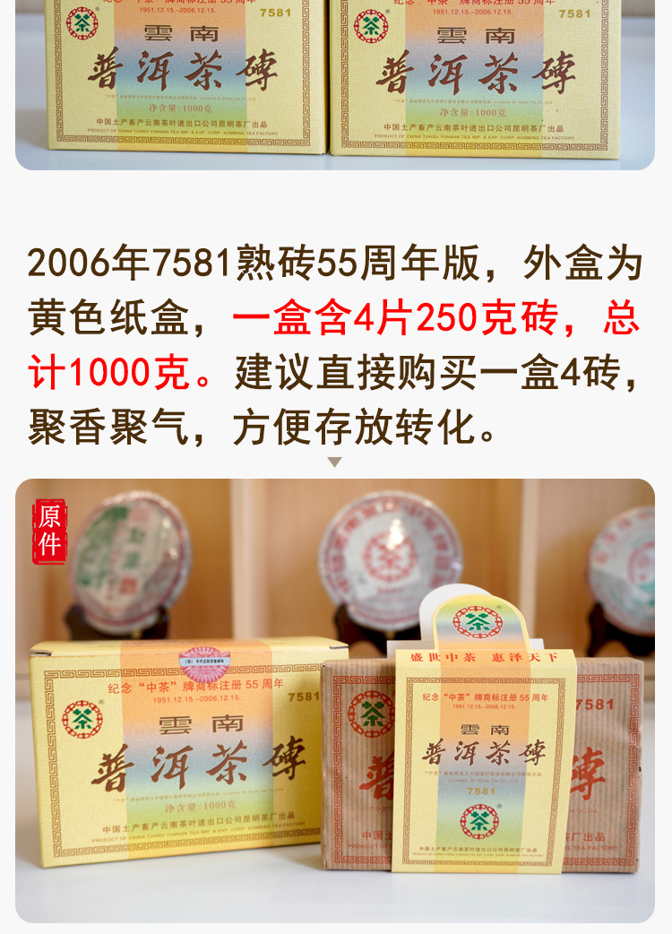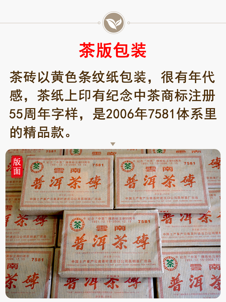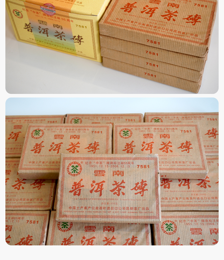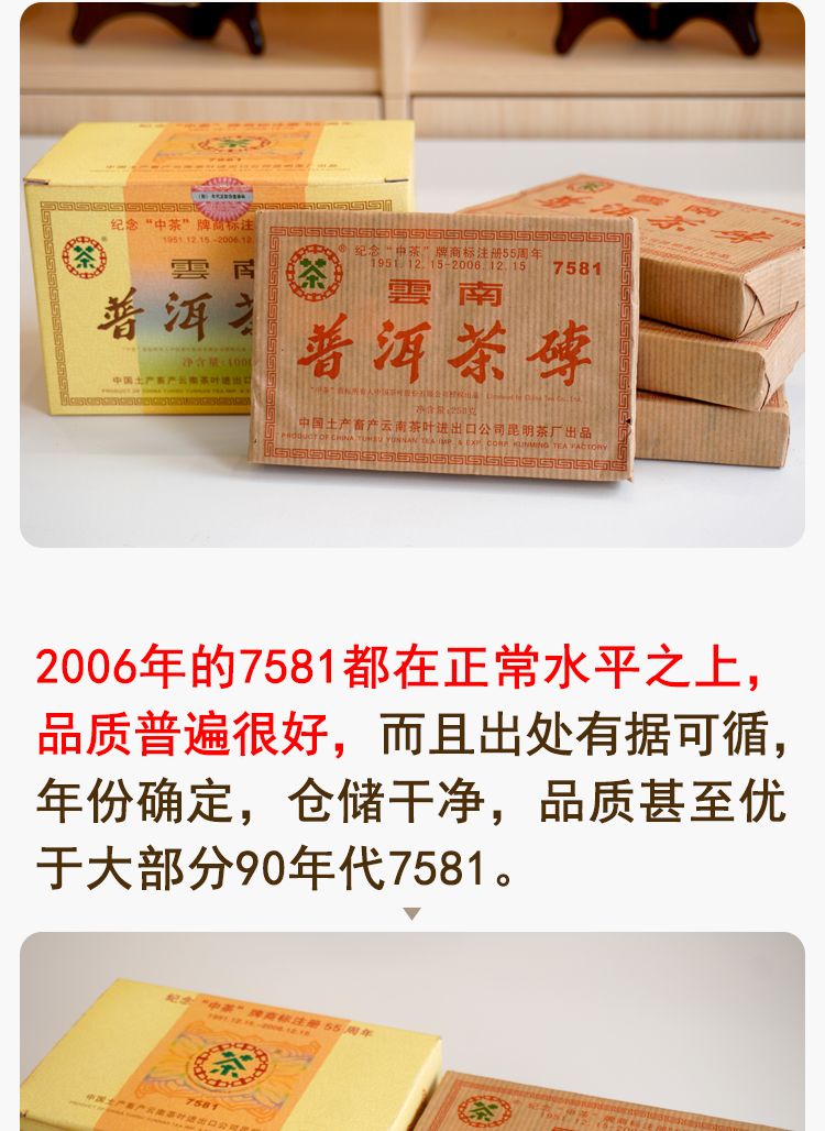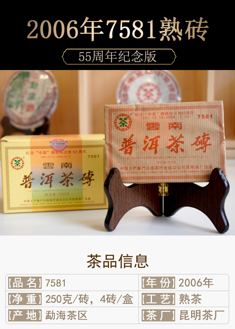 【经典7581】2006年纪念中茶商标注册55周年7581纪念版 熟茶7581里的精品版 干仓真品 一盒4片 一片250克 标价为一片的价格 高性价比
