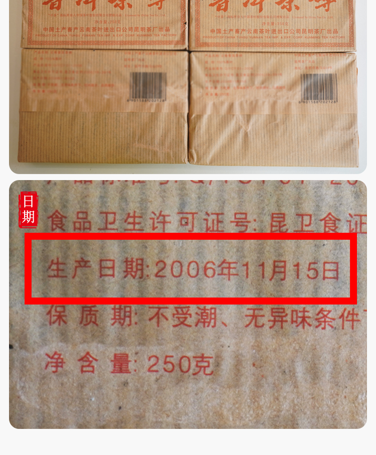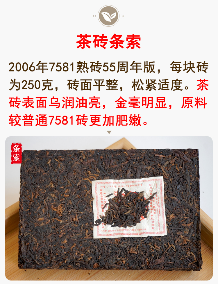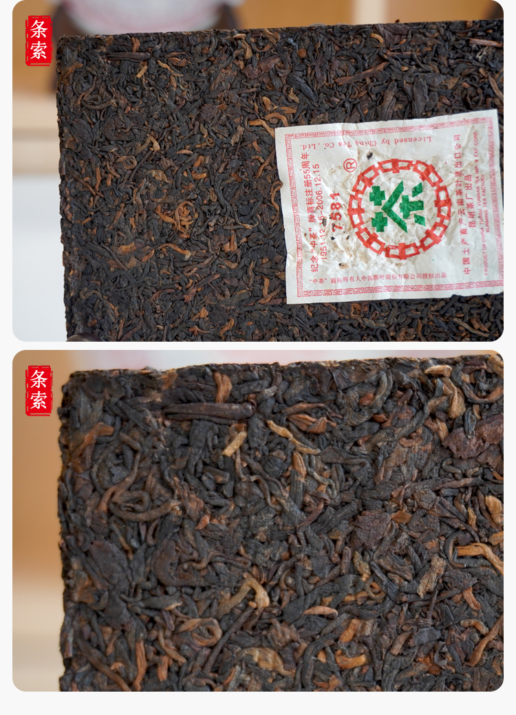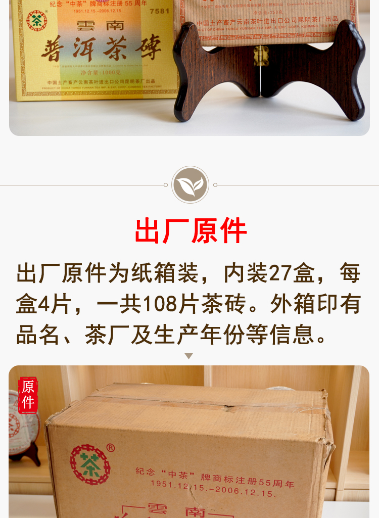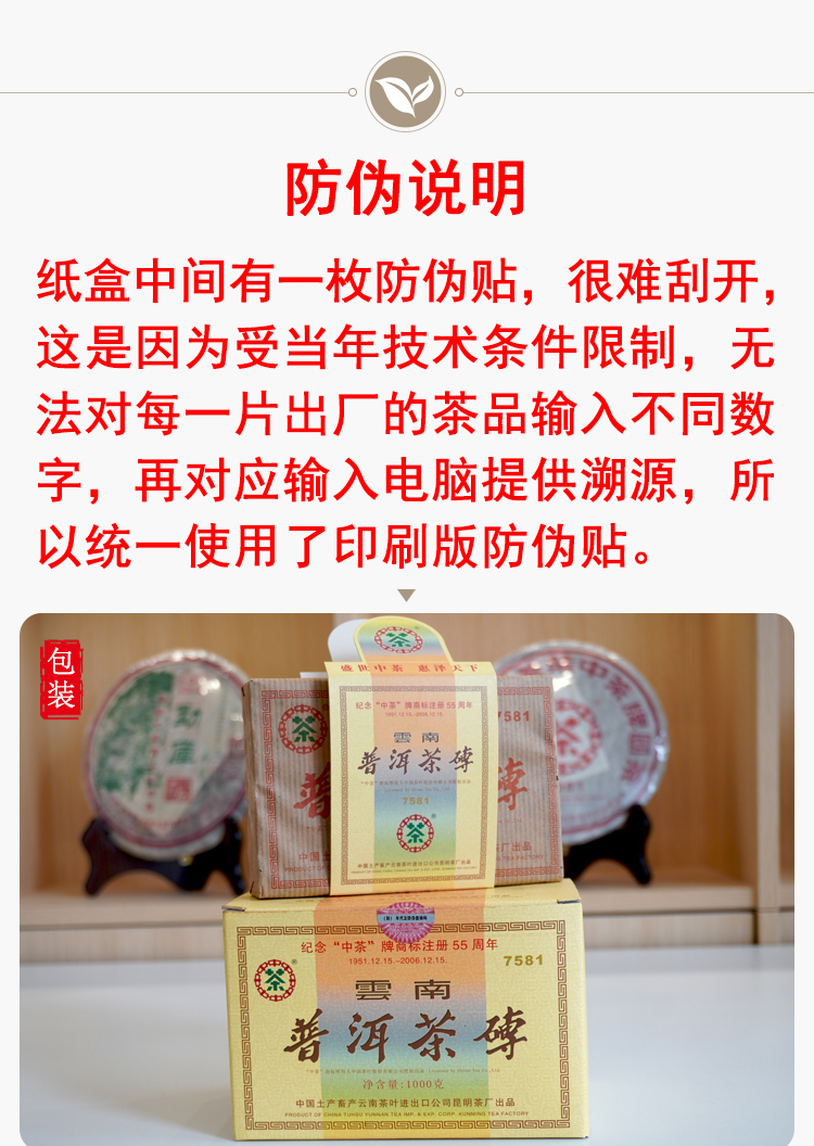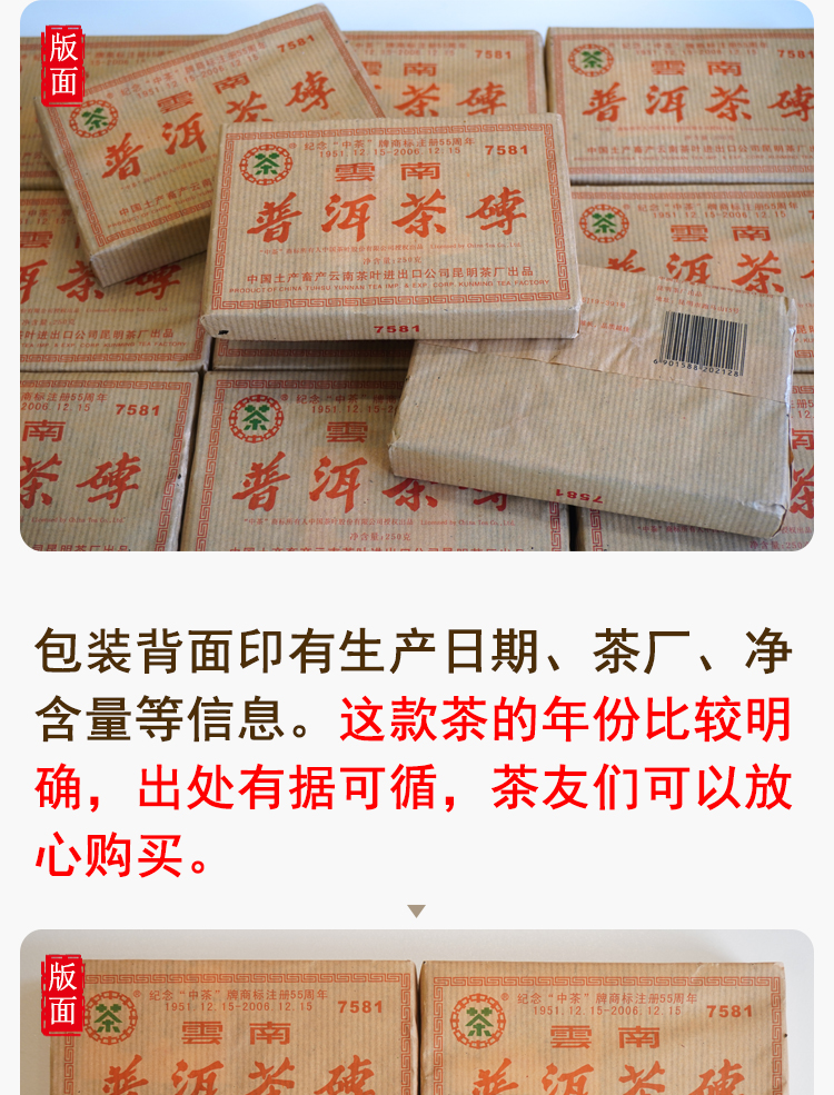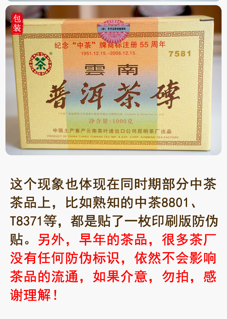 【经典7581】2006年纪念中茶商标注册55周年7581纪念版 熟茶7581里的精品版 干仓真品 一盒4片 一片250克 标价为一片的价格 高性价比