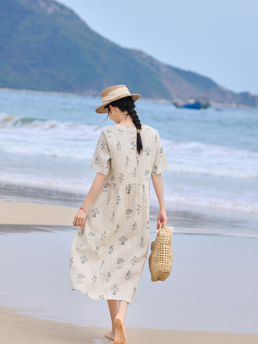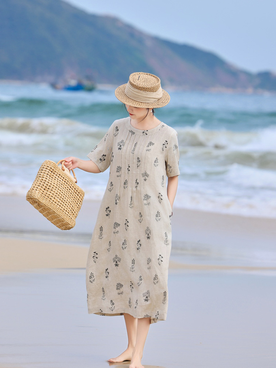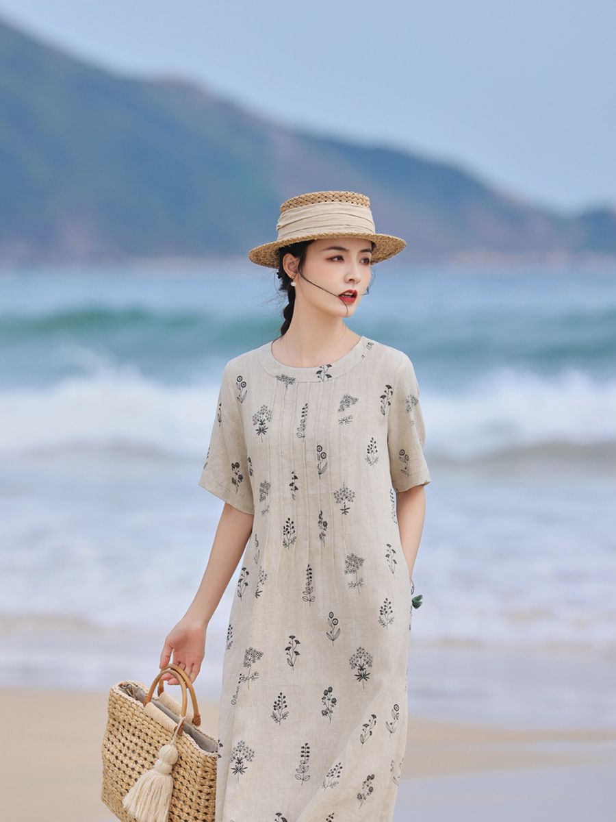 亚麻印花宽松圆领,复古中袖连衣裙茶服HS25827
