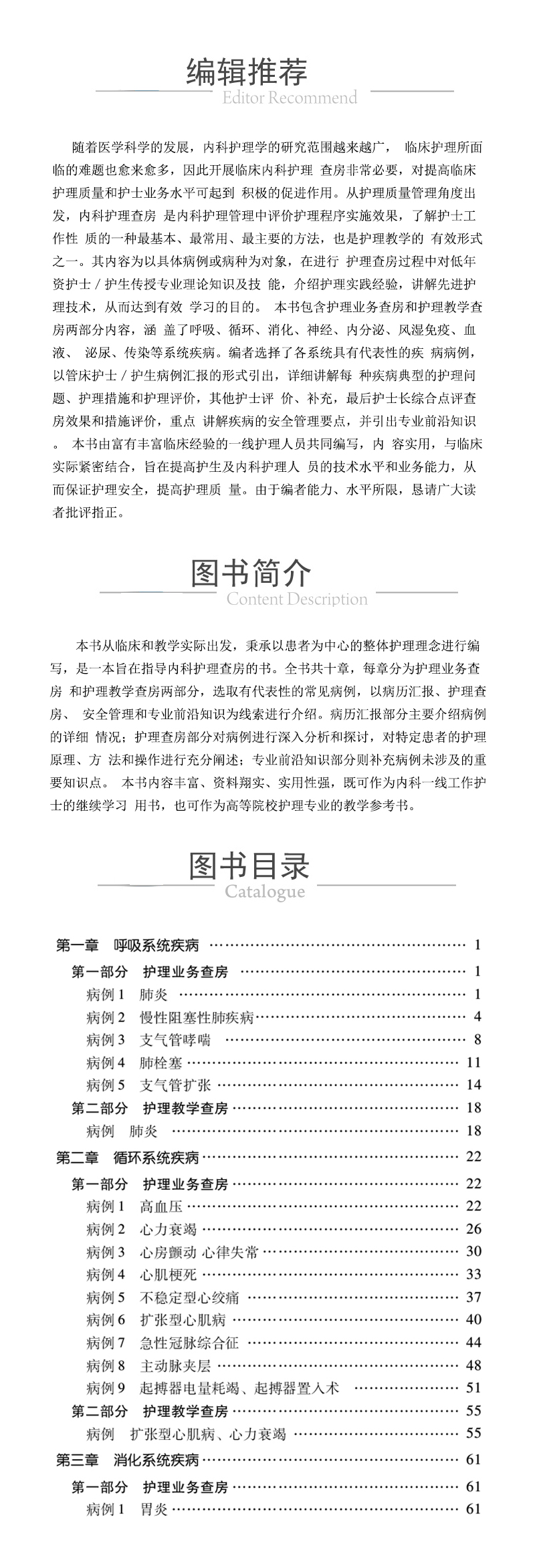 本书从临床和教学实际出发,秉承以患者为中心的整体护理理念进行编写,是一本旨在指导内科护理查房的书。全书共十章,每章分为护理业务查房和护理教学查房两部分,选取有代表性的常见病例,以病历汇报、护理查房、安全管理和专业前沿知识为线索进行介绍。病历汇报部分主要介绍病例的详细情况;护理查房部分对病例进行深人分析和探讨,对特定患者的护理原理、方法和操作进行充分阐述;专业前沿知识部分则补充病例未涉及的重要知识点。本书内容丰富、资料翔实、实用性强,既可作为内科--线工作护士的继续学习用书,也可作为高等院校护理专业的教学参考书。