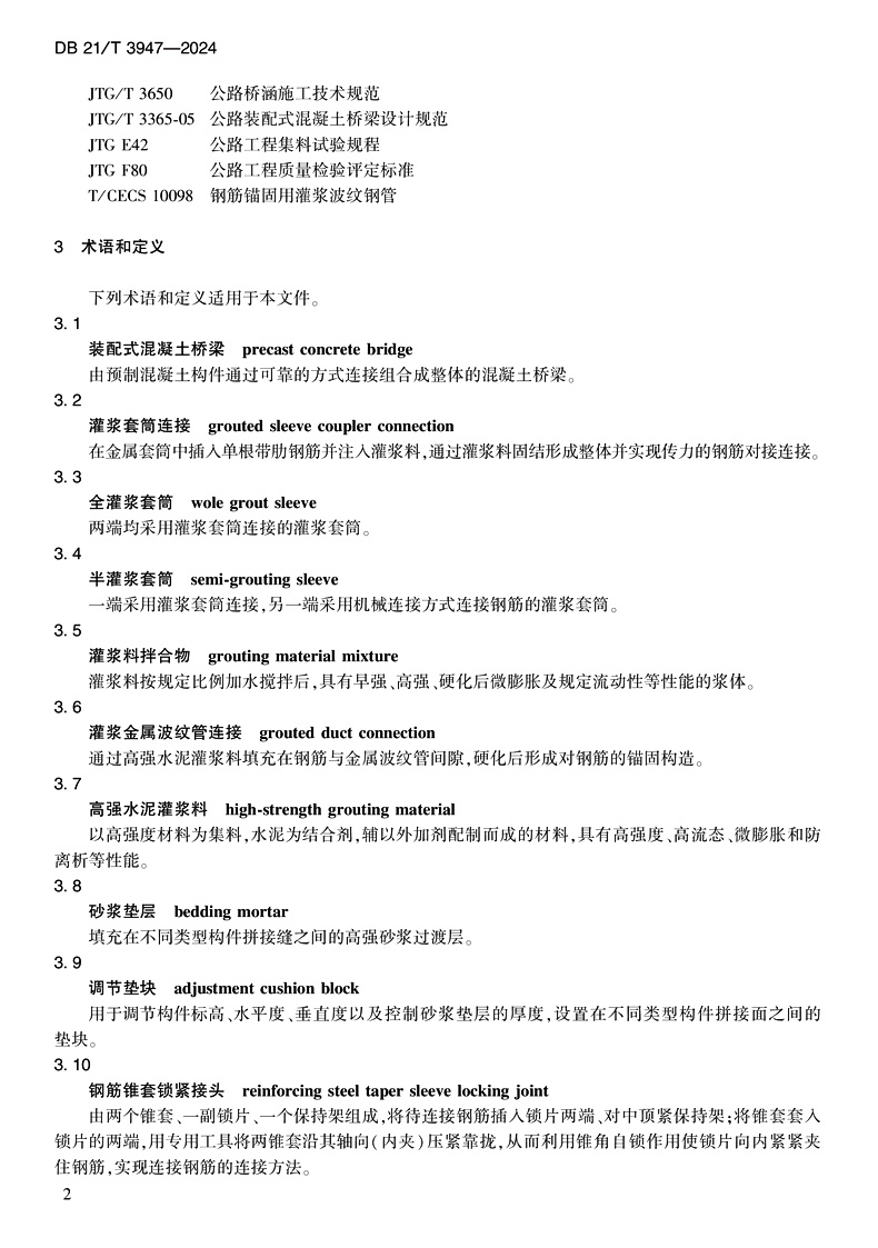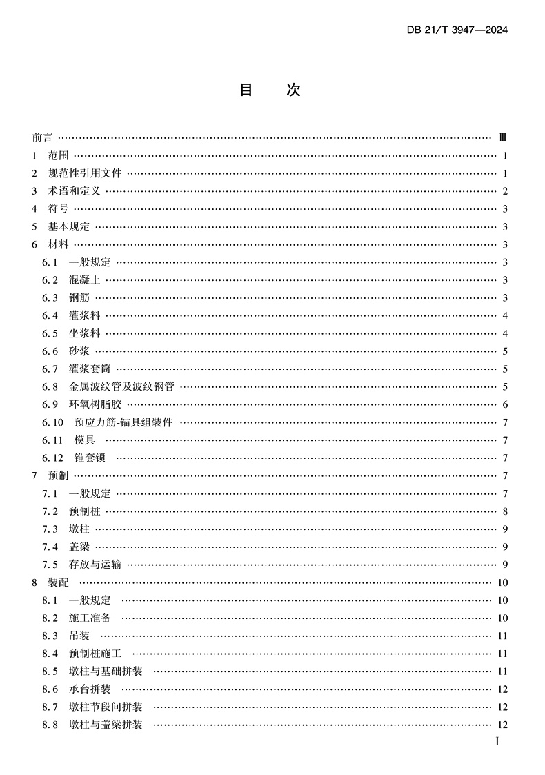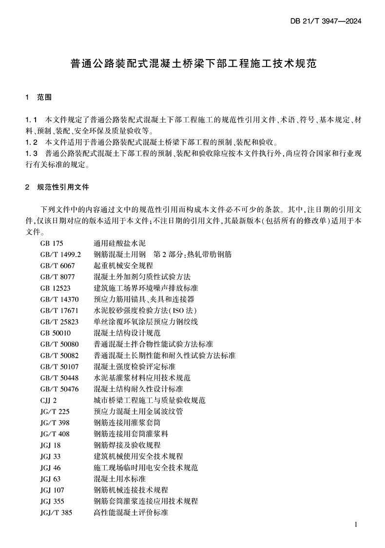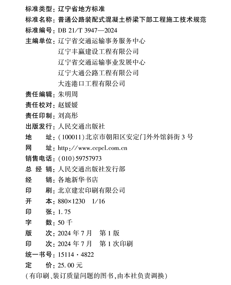 书名:普通公路装配式混凝土桥梁下部工程施工技术规范(DB 21/T 3947—2024)