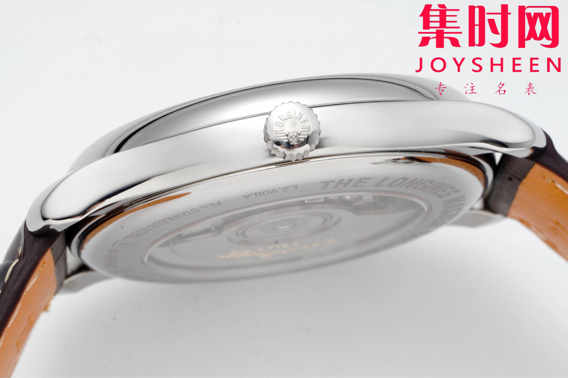 表带:意大利小牛皮表带搭配浪琴经典蝴蝶式精钢表扣。