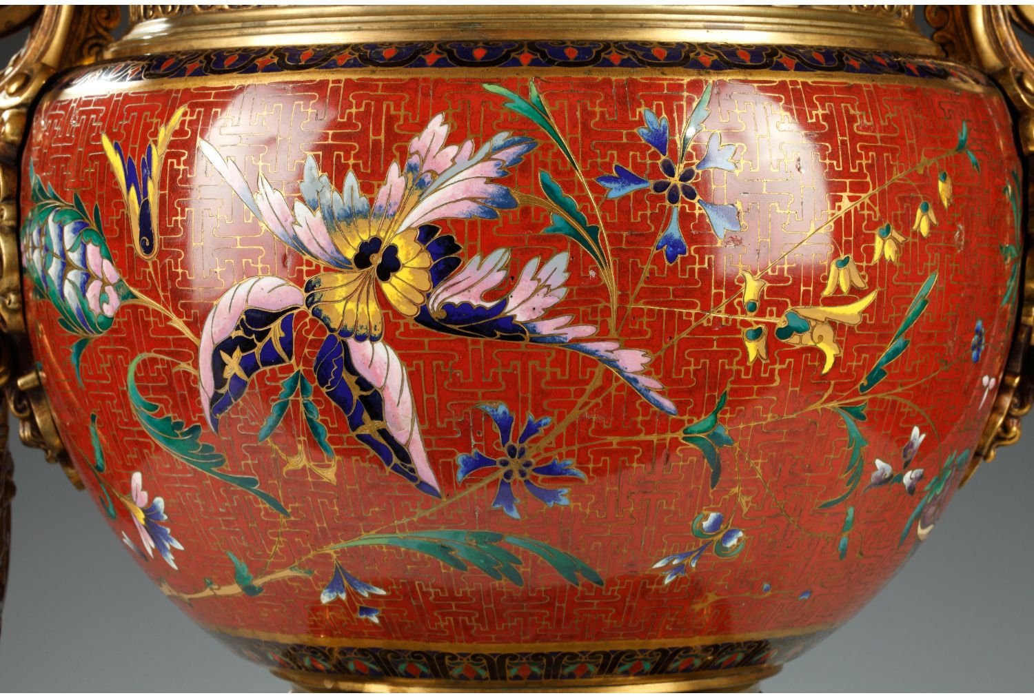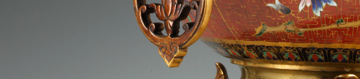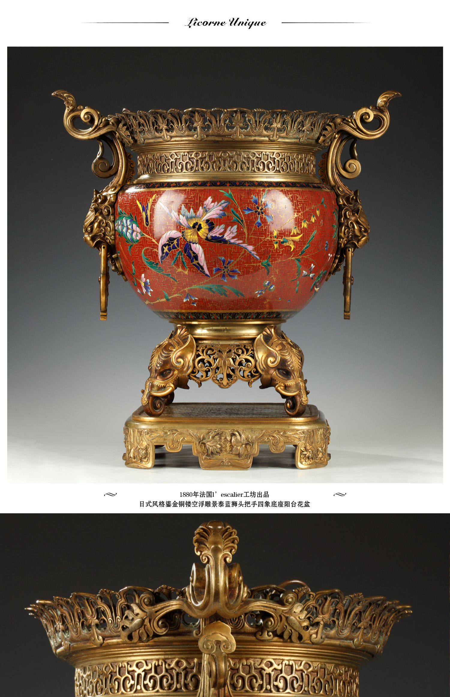 独角鹿西洋古董l’escalier工坊鎏金铜浮雕景泰蓝狮头四象花盆