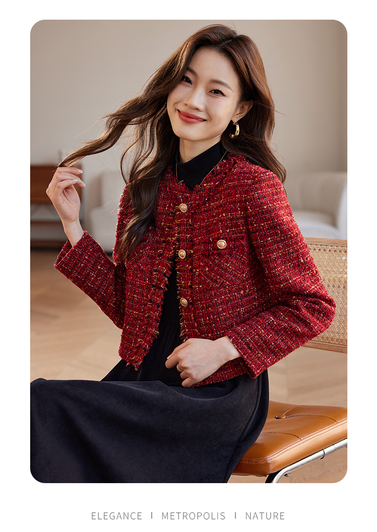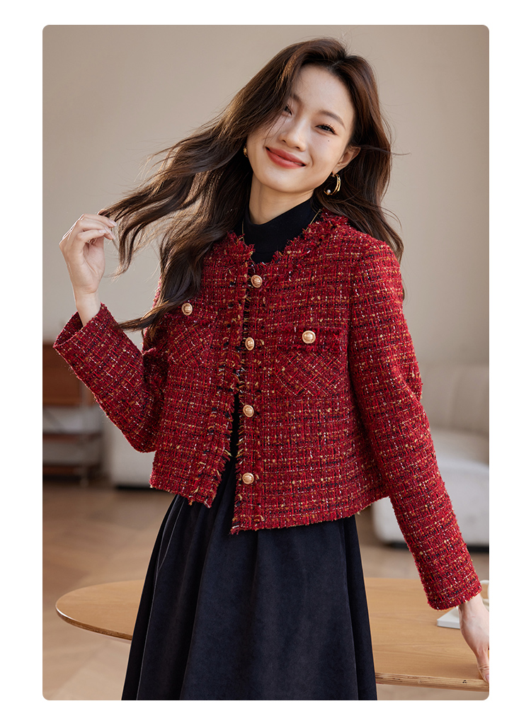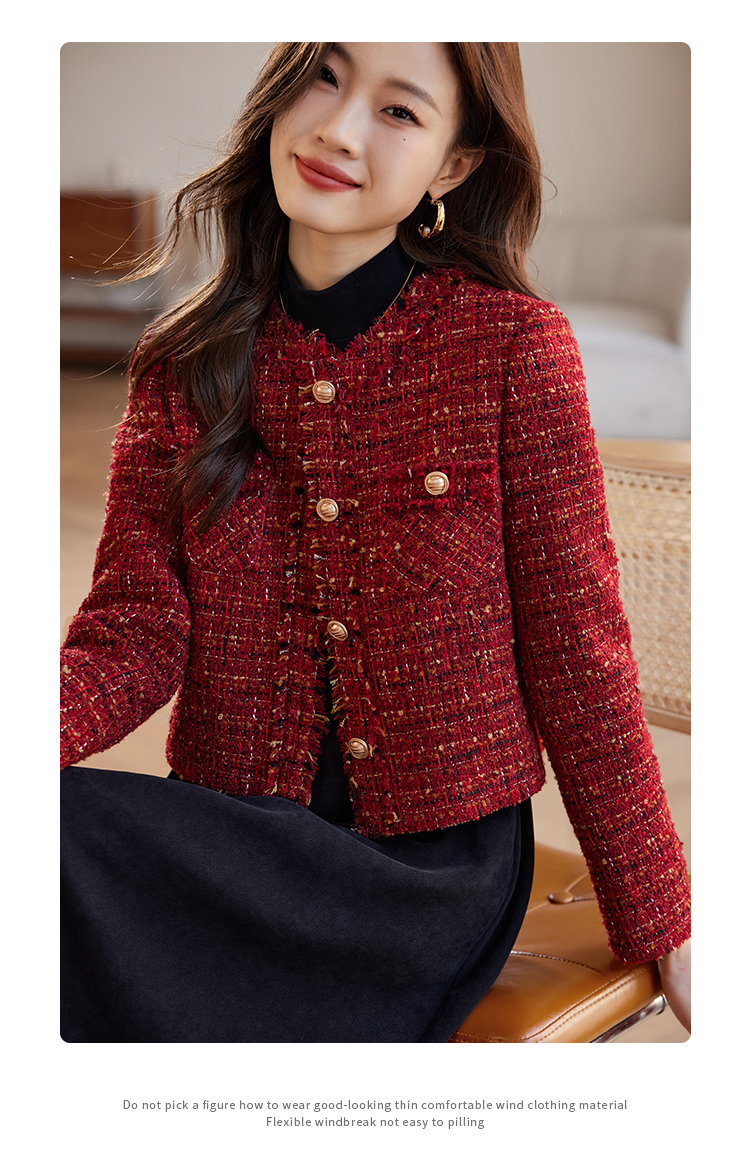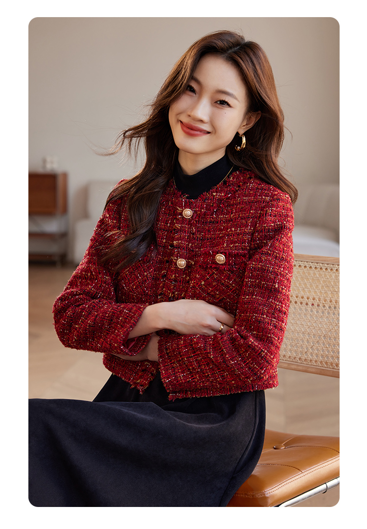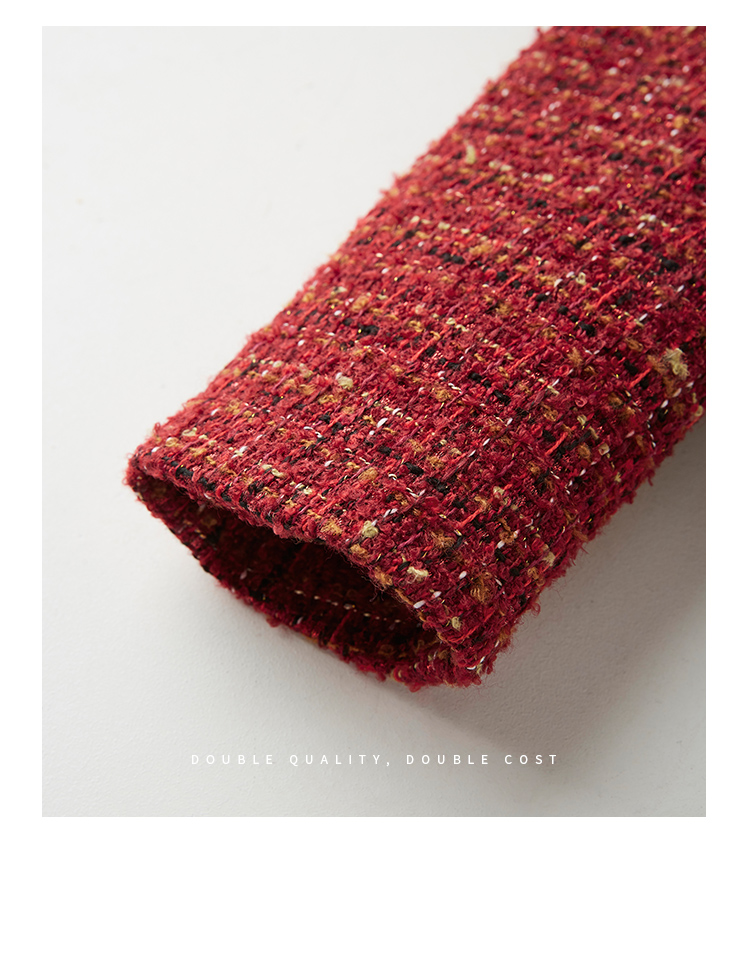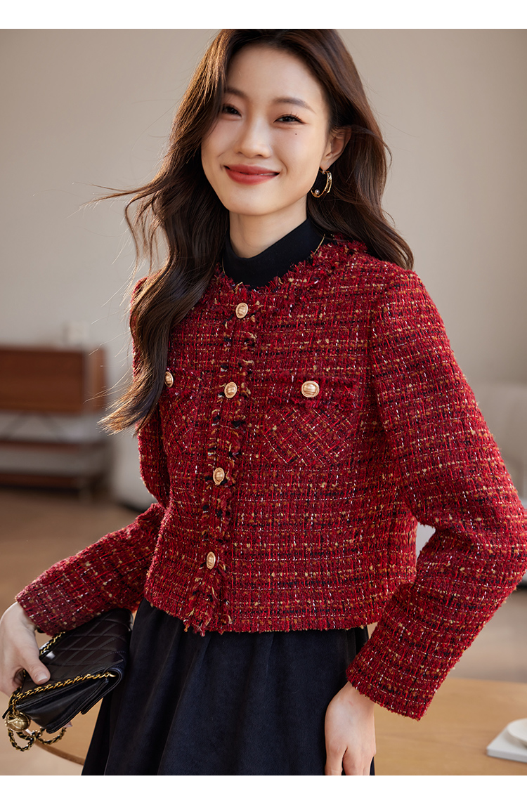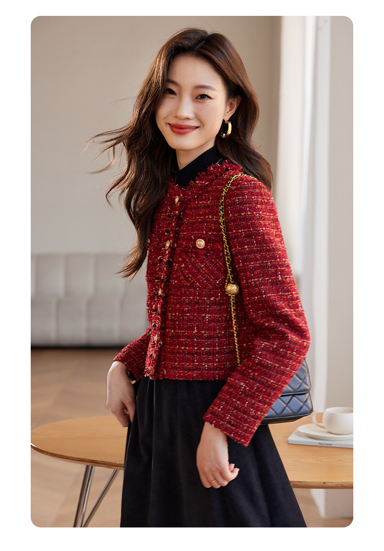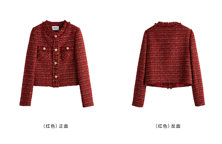 【年货节】熙世界2025过年小香风夹棉短款外套女秋冬法式气质名媛粗花呢红色上衣