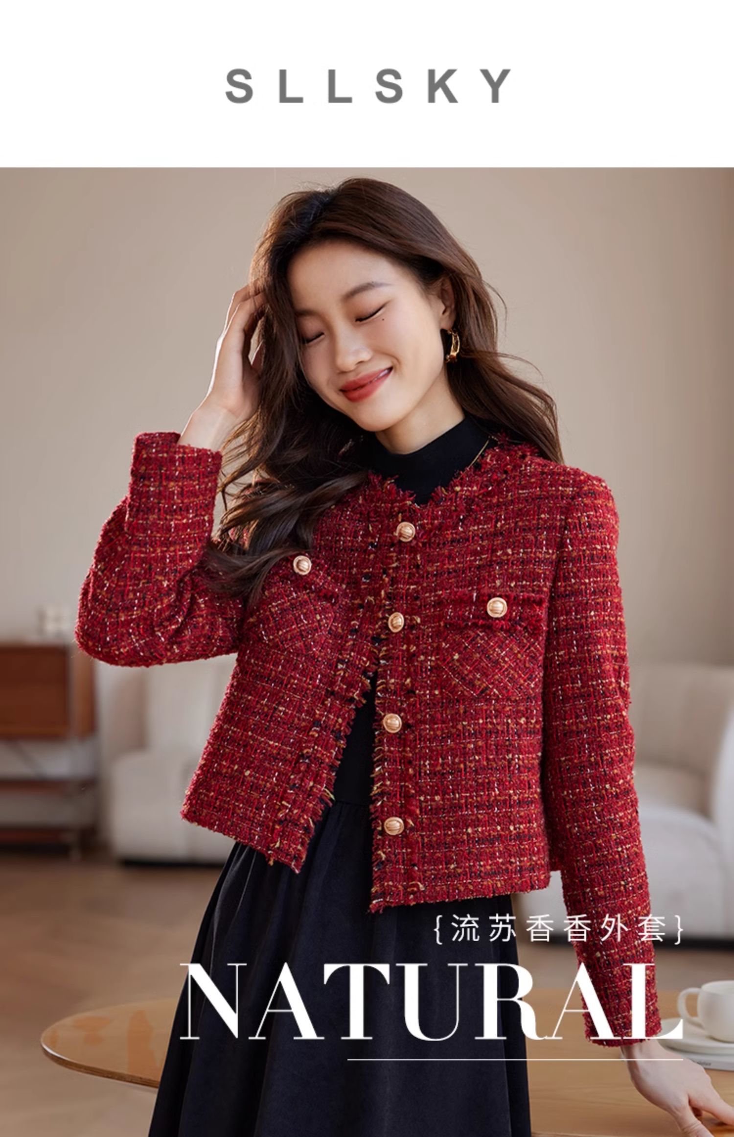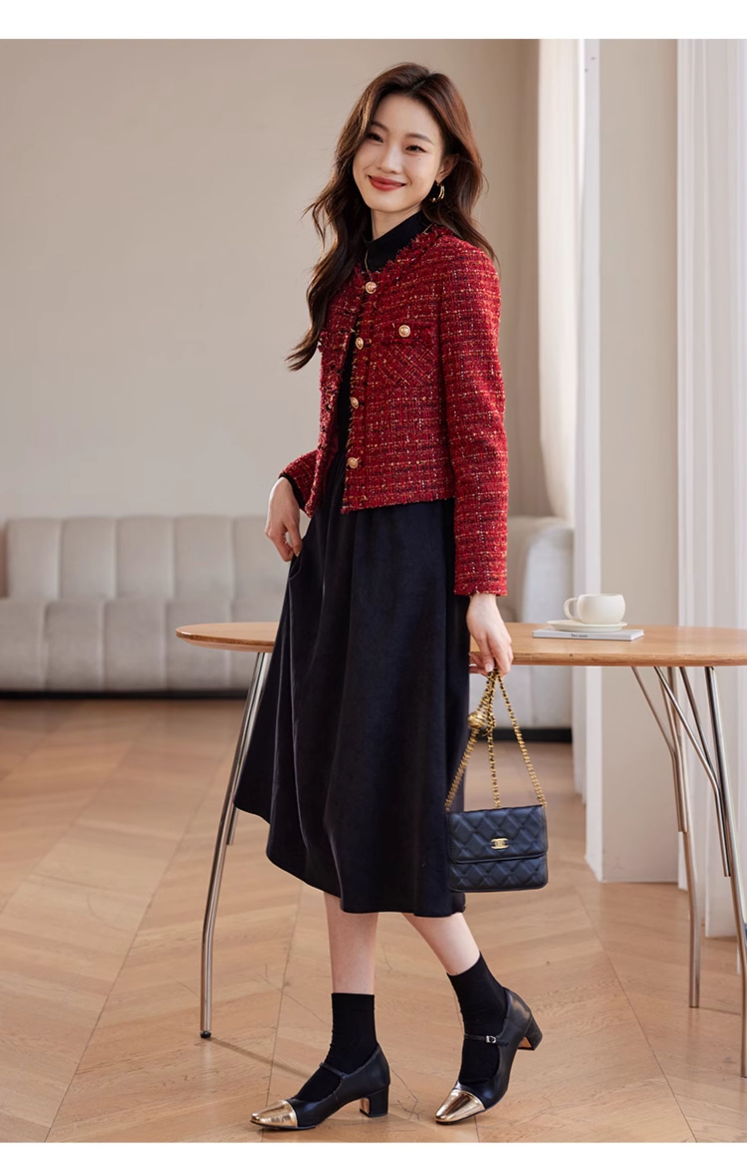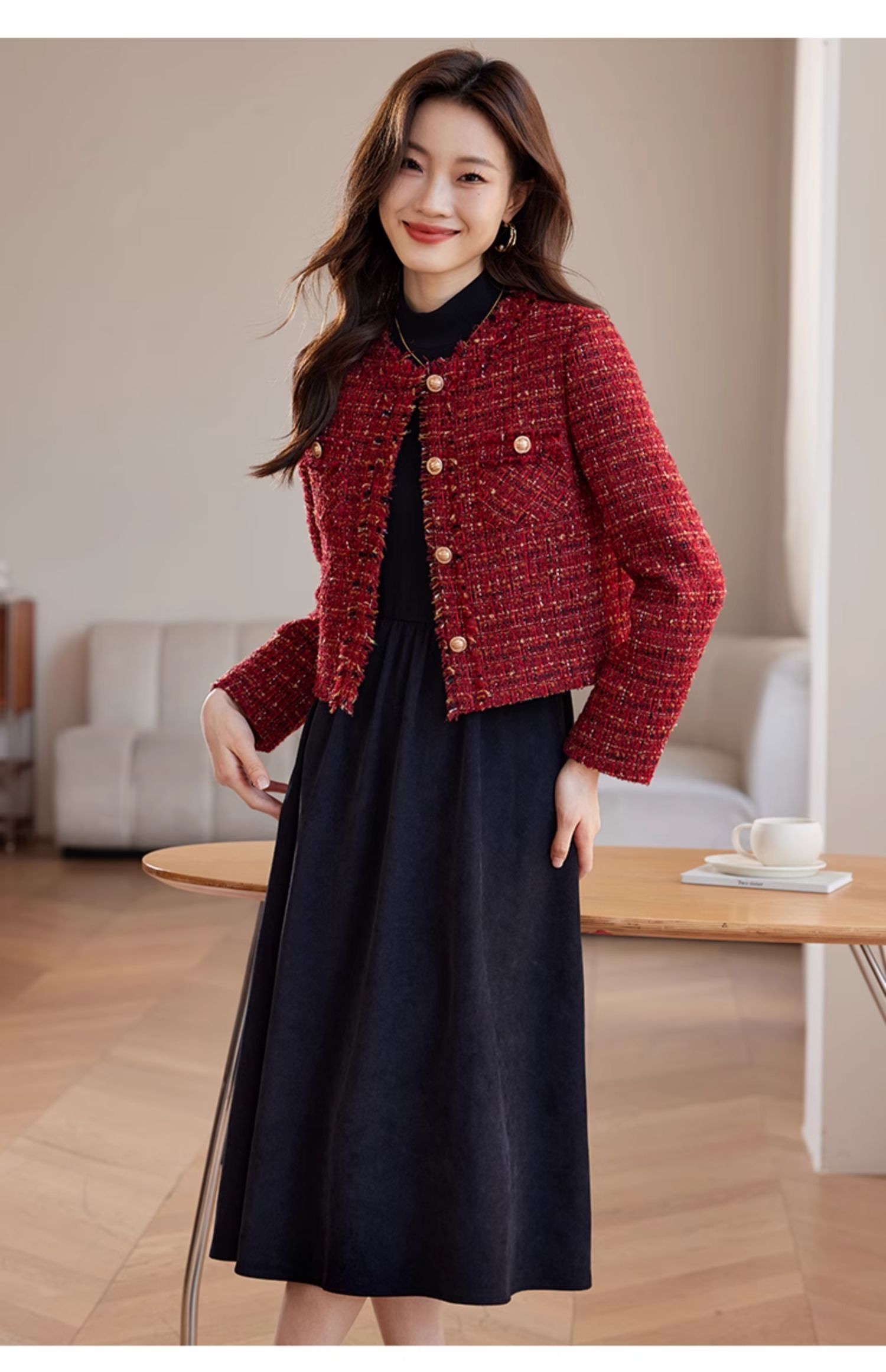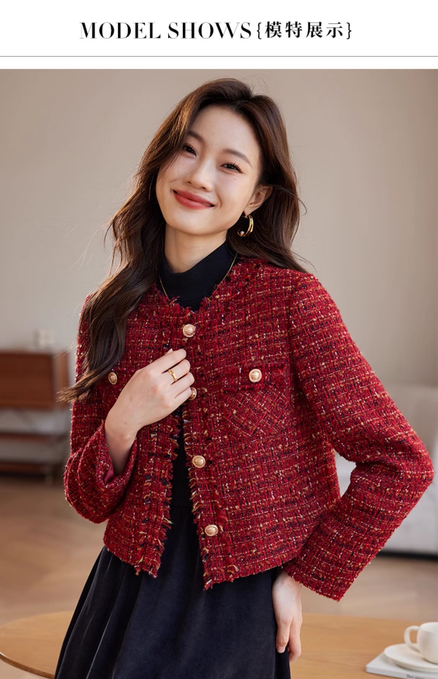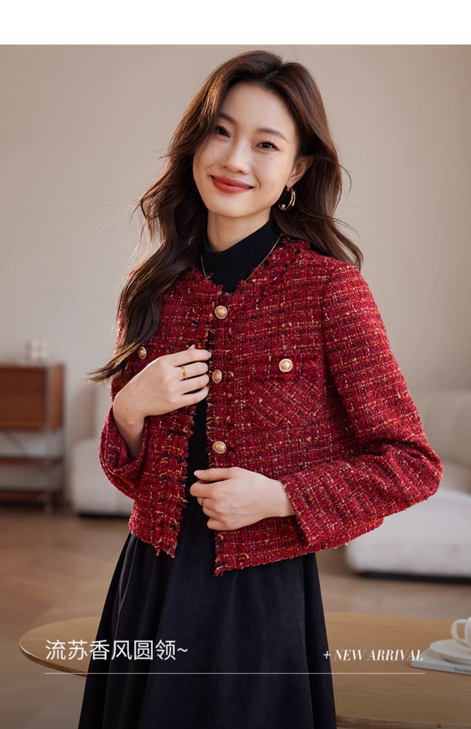 【年货节】熙世界2025过年小香风夹棉短款外套女秋冬法式气质名媛粗花呢红色上衣
