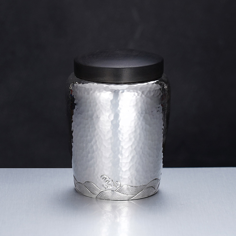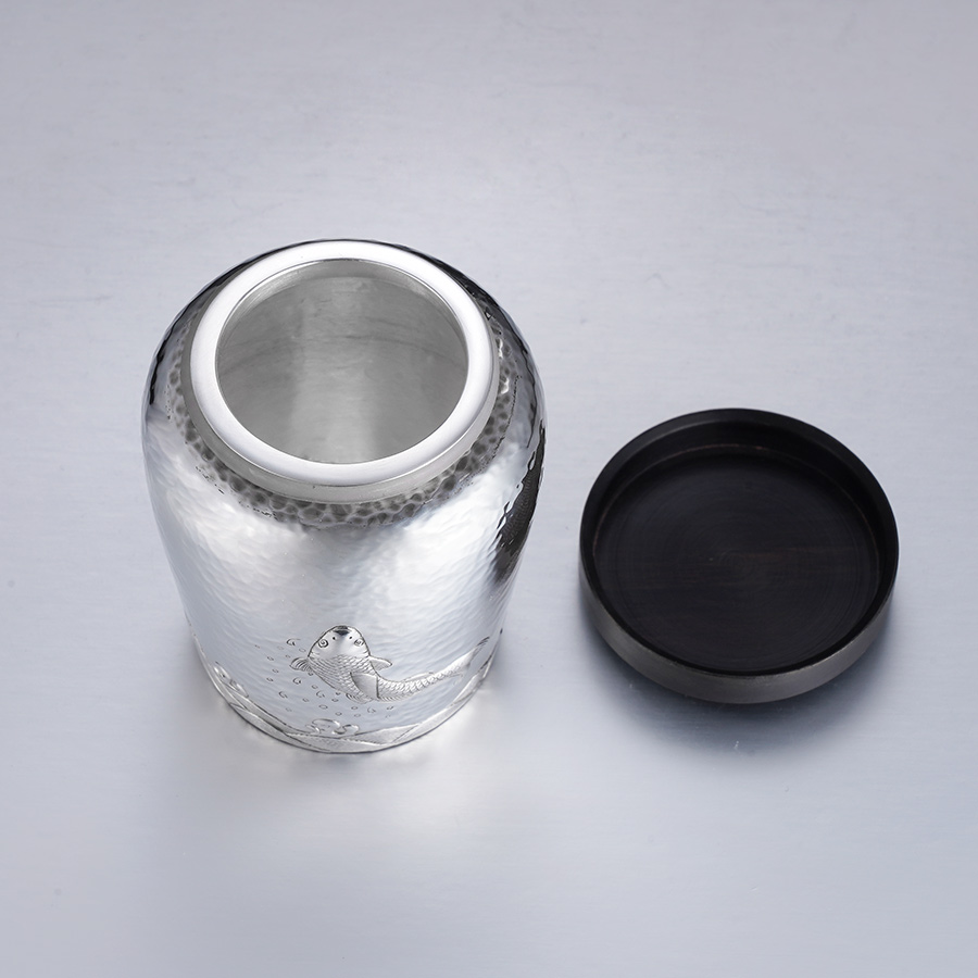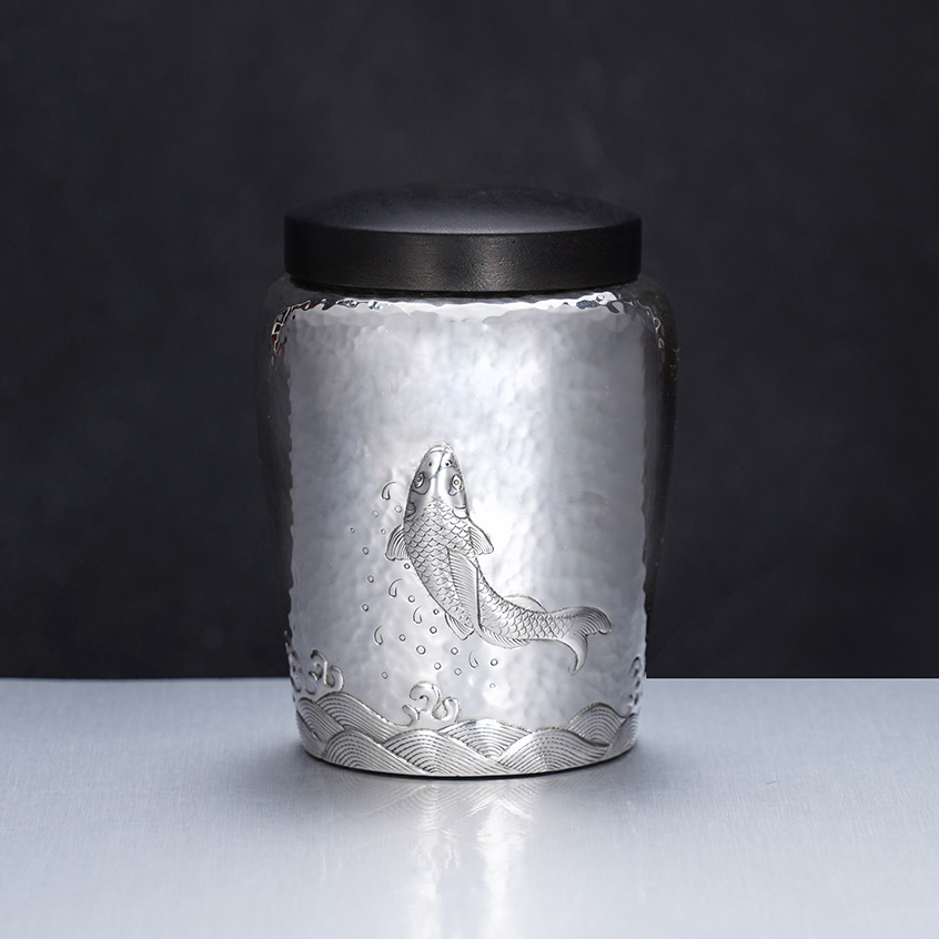 【寓意】:茶叶罐足银材质,通体抛光打磨,外侧刻有一条灵动的锦鲤,呈跃然而上之姿,取“鱼跃龙门”之意,象征一飞冲天,飞黄腾达。