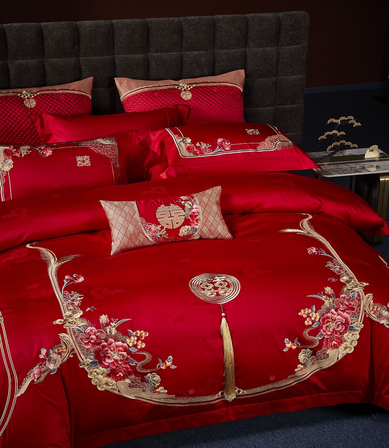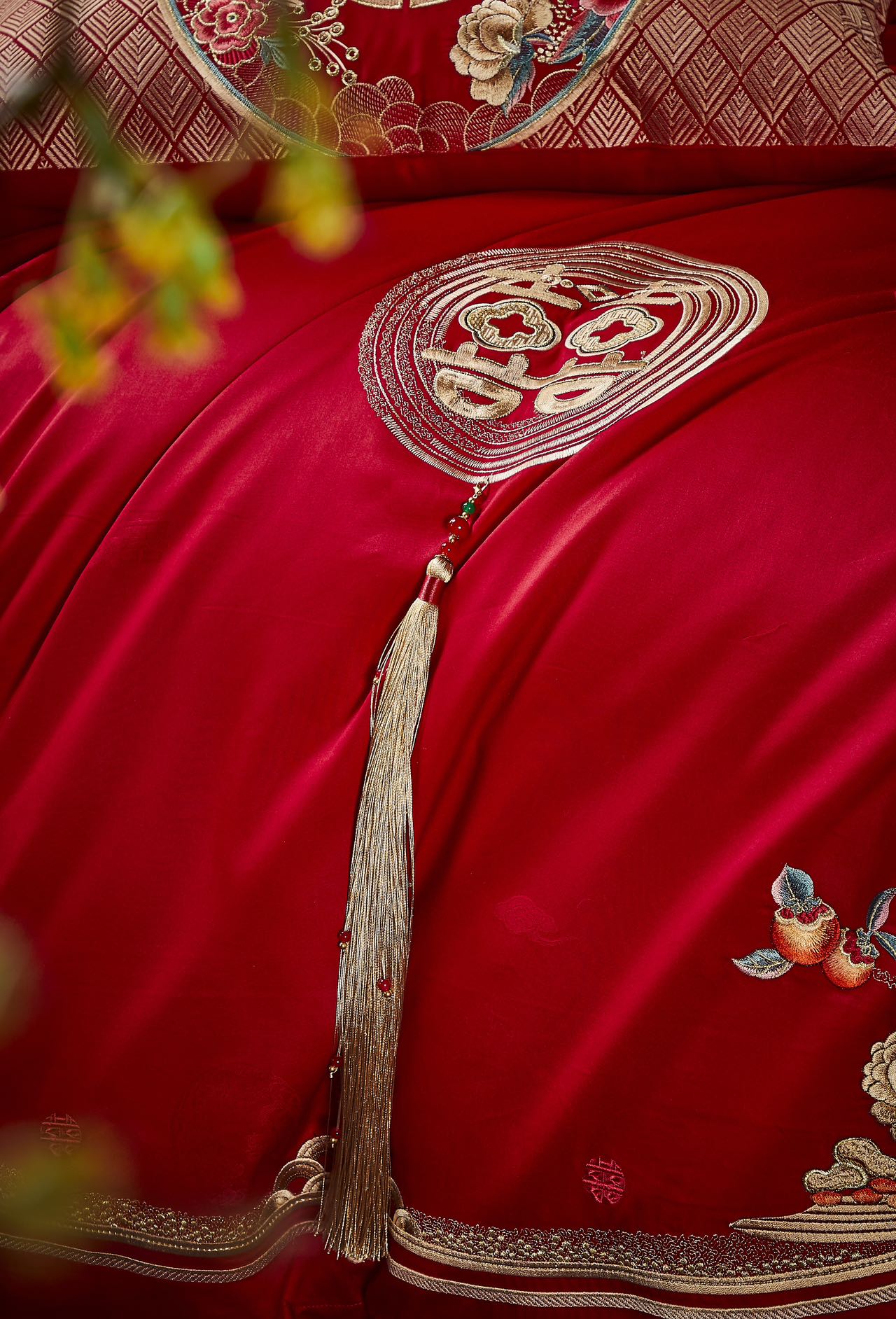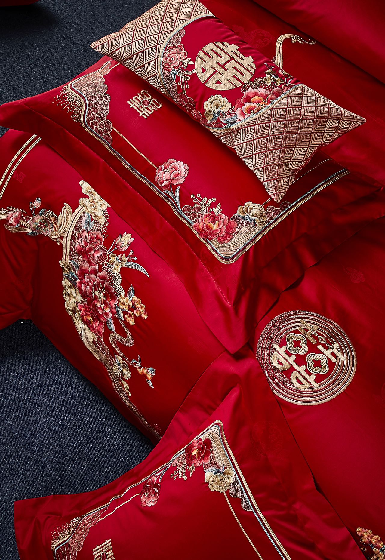 利路米百支棉大红色高档刺绣喜被新婚庆六件套--花间喜事