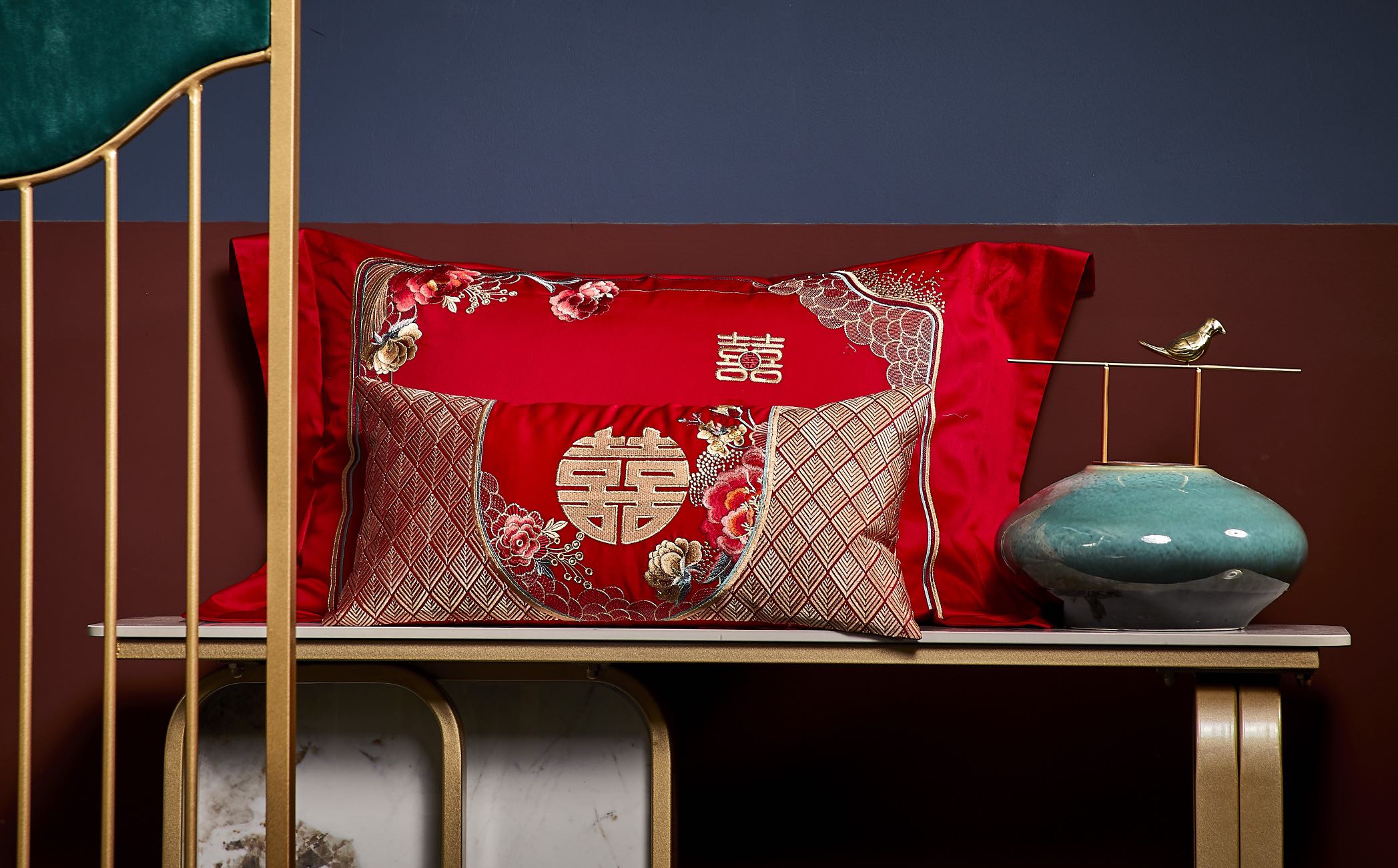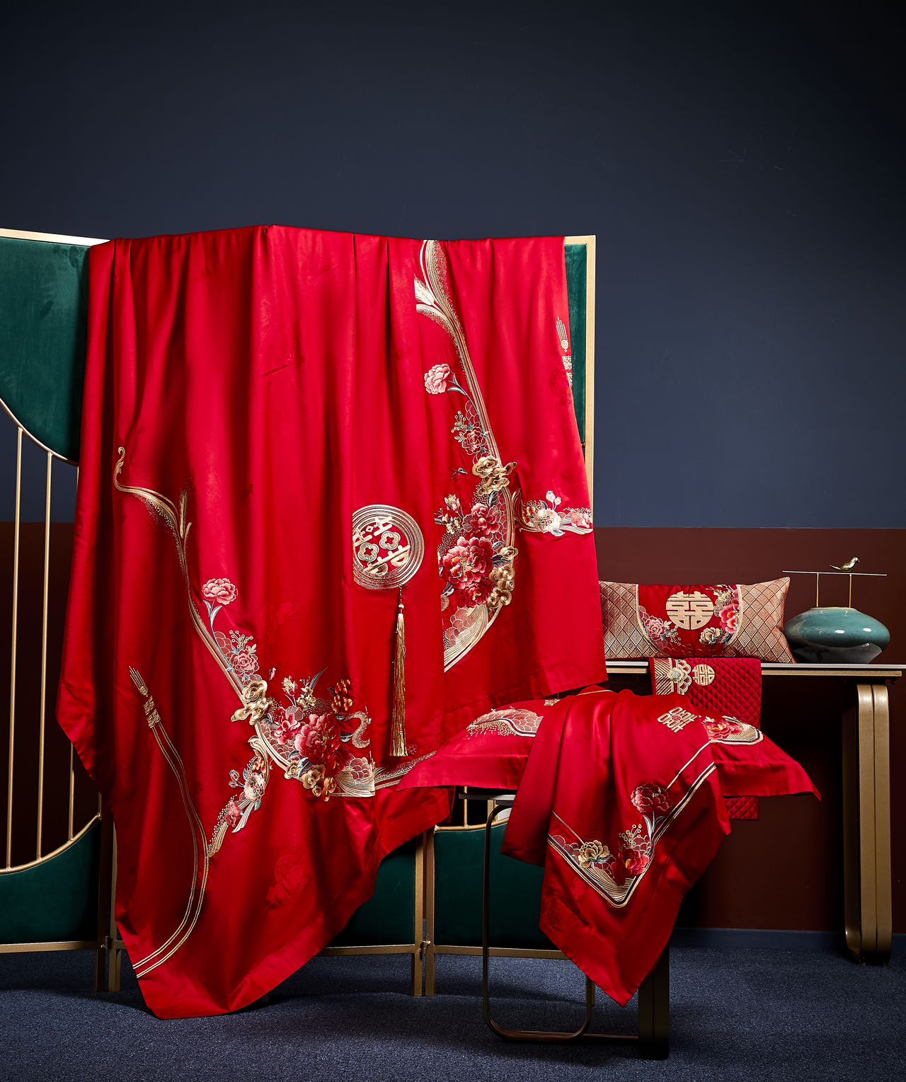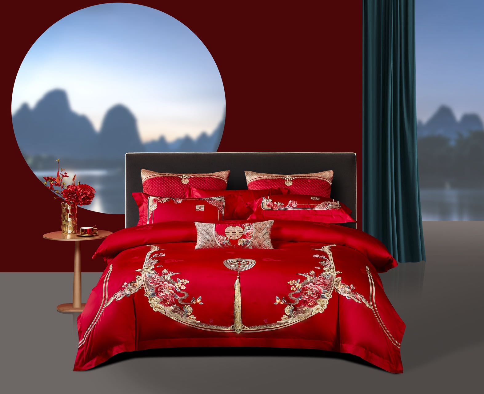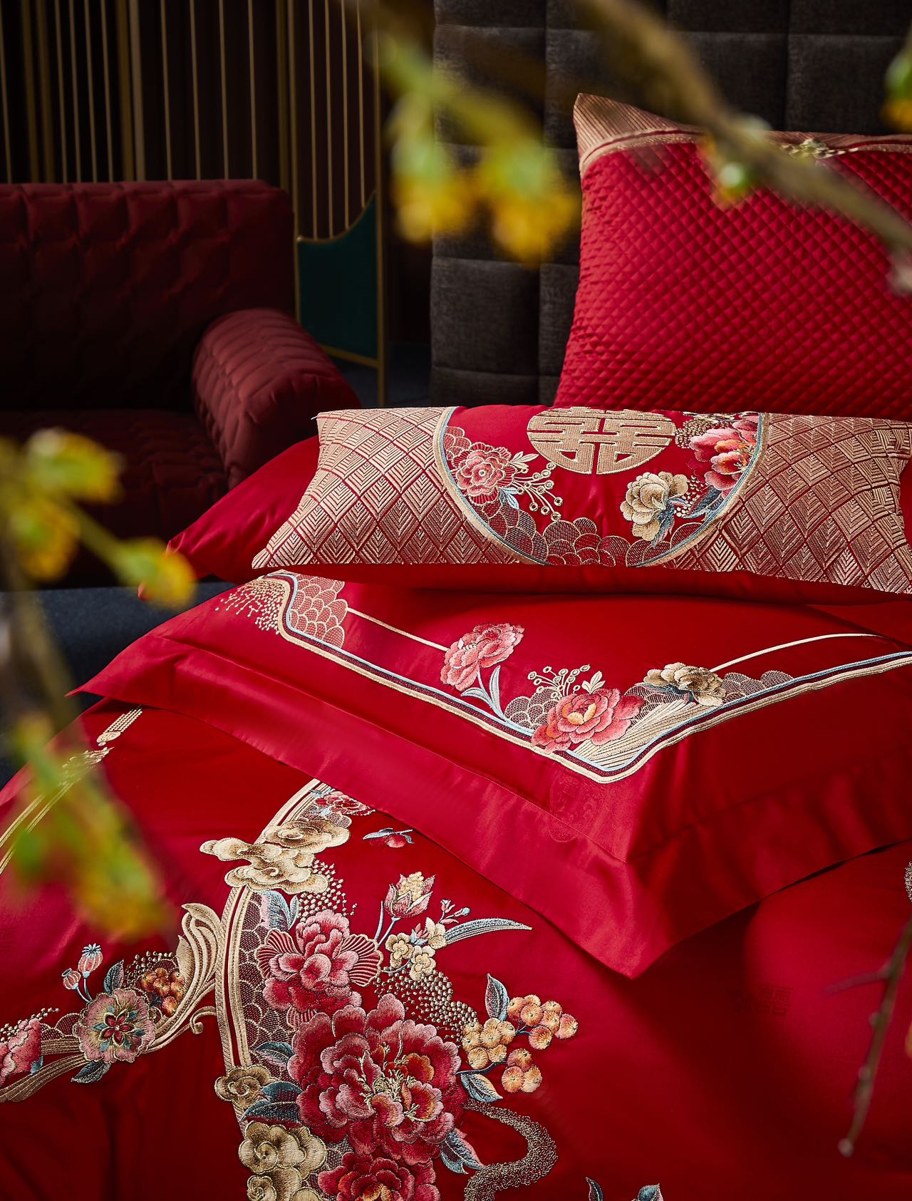 利路米百支棉大红色高档刺绣喜被新婚庆六件套--花间喜事