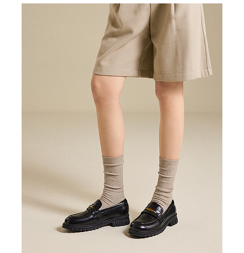 千百度漆皮厚底乐福鞋女通勤增高深口黑色小皮鞋单鞋A25463103