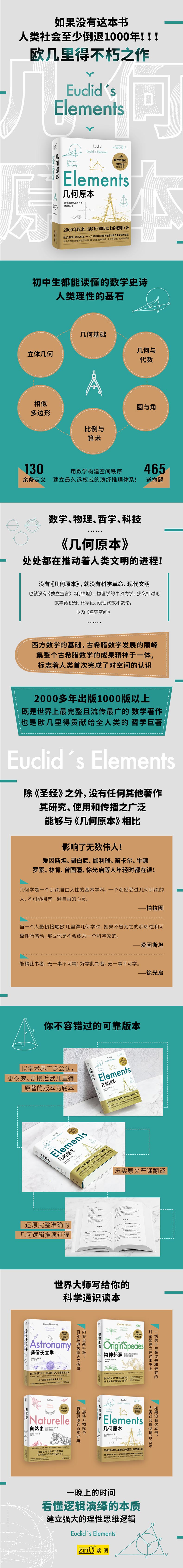 《几何原本》成书于公元前300年左右,全书13卷,是古希腊数学家欧几里得的一部不朽之作。它既是一本数学著作,也是哲学巨著,标志着人类首次完成了对空间的认识。《几何原本》自问世之日起,在长达2000多年的时间里,历经多次翻译和修订,自1482年少有印刷本出版,至今已有1000多种不同版本。欧几里得建立了定义和公理,并研究各种几何图形的性质,从而确立了一套从公理、定义出发,论证命题得到定理的几何学论证方法,并系统地总结了泰勒斯、毕达哥拉斯及智者学派等前代学者在实践和思考中获得的几何知识,集整个古希腊数学的成果与精神于一身。对人们理性推演能力的影响,即对人的科学思想产生了深刻且巨大的影响。