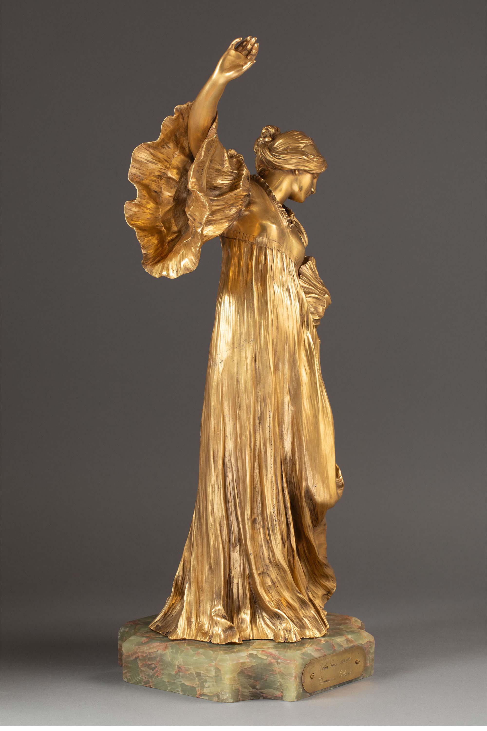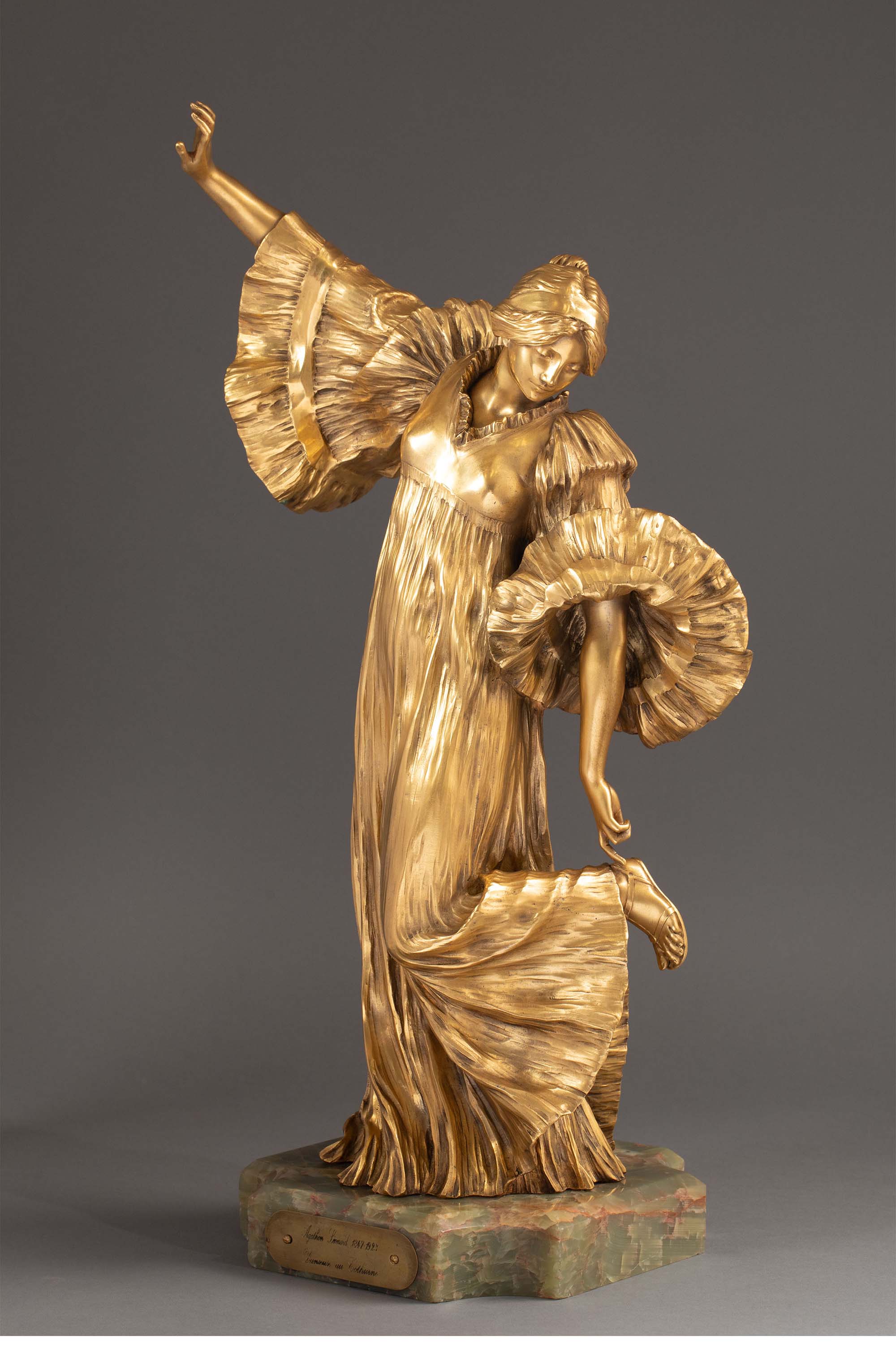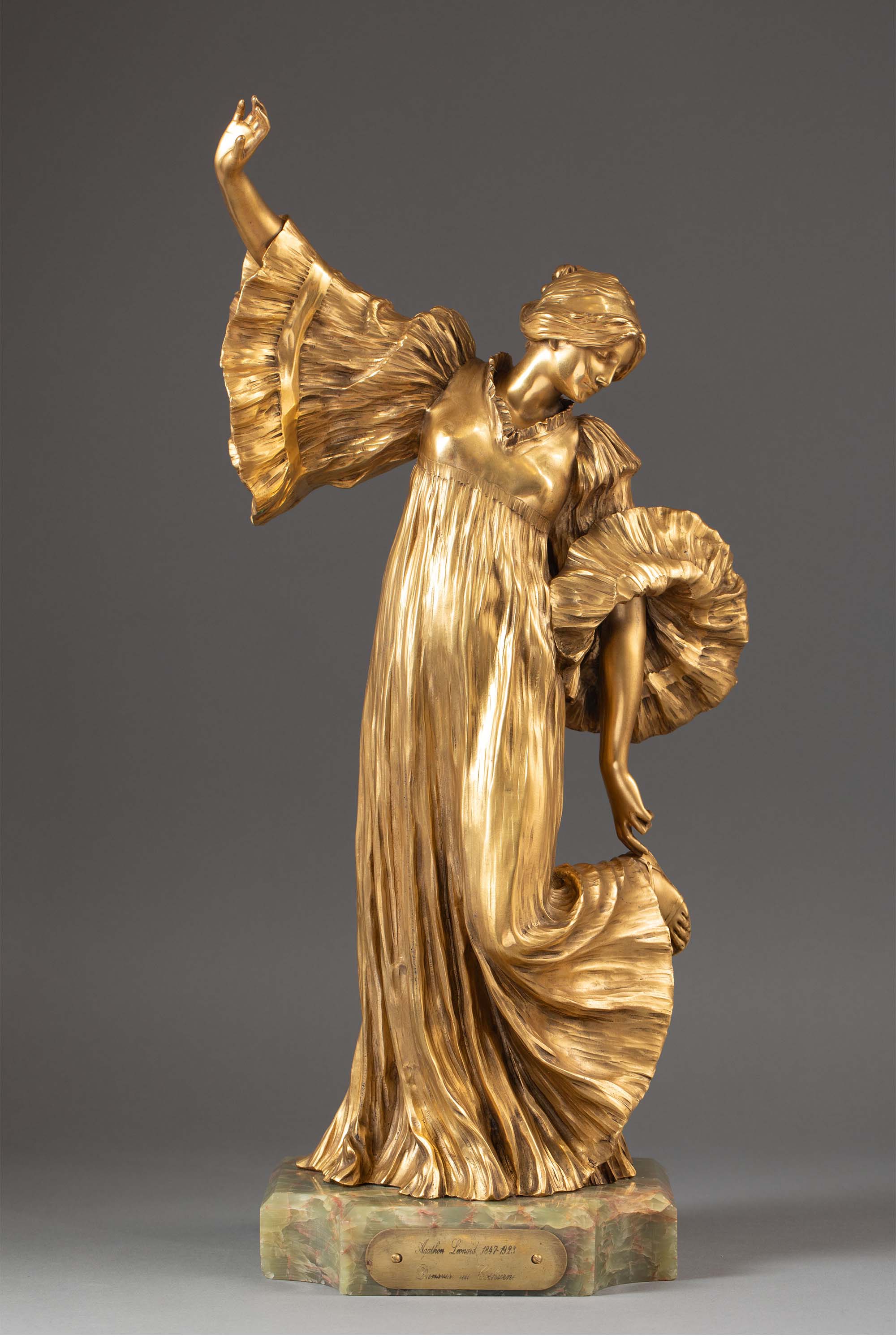 1900年代法国雕塑艺术家A.Léonard签名创作Susse Freres工坊出品飘带舞者系列缟玛瑙底座青铜鎏金雕塑《穿舞鞋的舞者》
