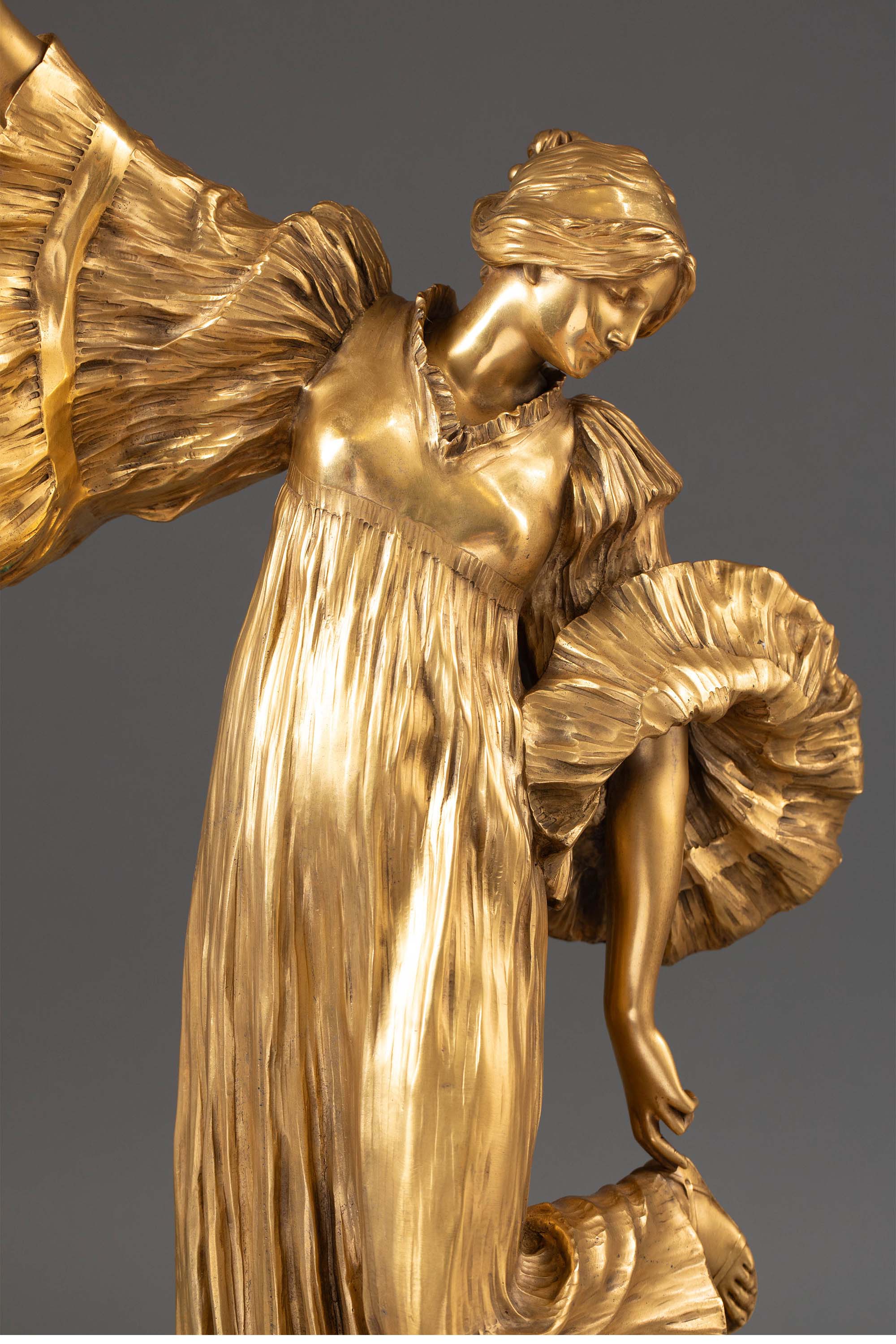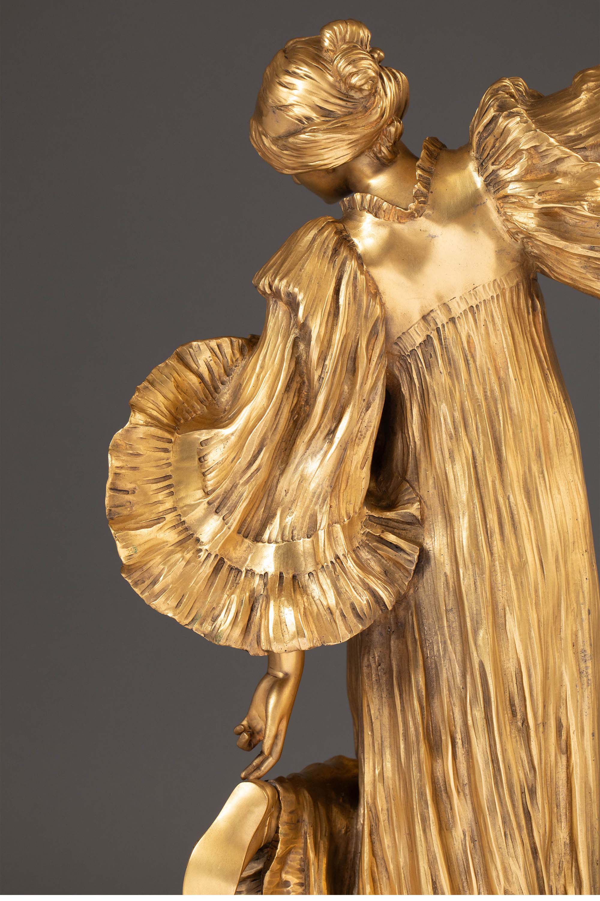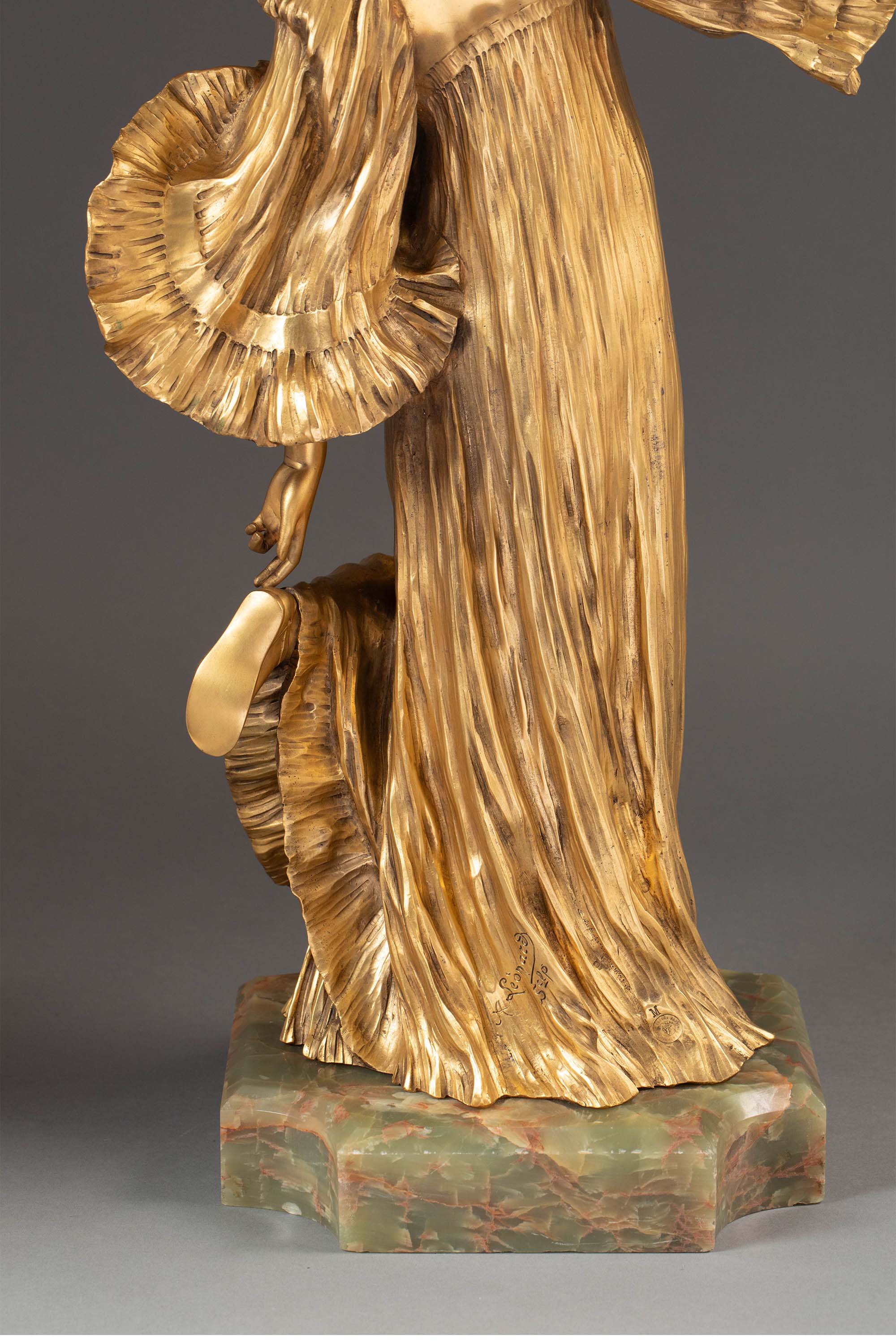 1900年代法国雕塑艺术家A.Léonard签名创作Susse Freres工坊出品飘带舞者系列缟玛瑙底座青铜鎏金雕塑《穿舞鞋的舞者》