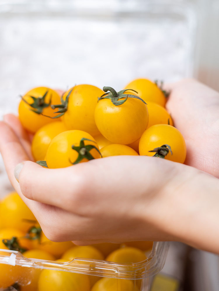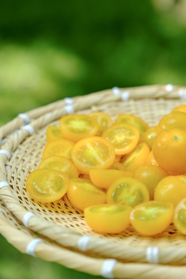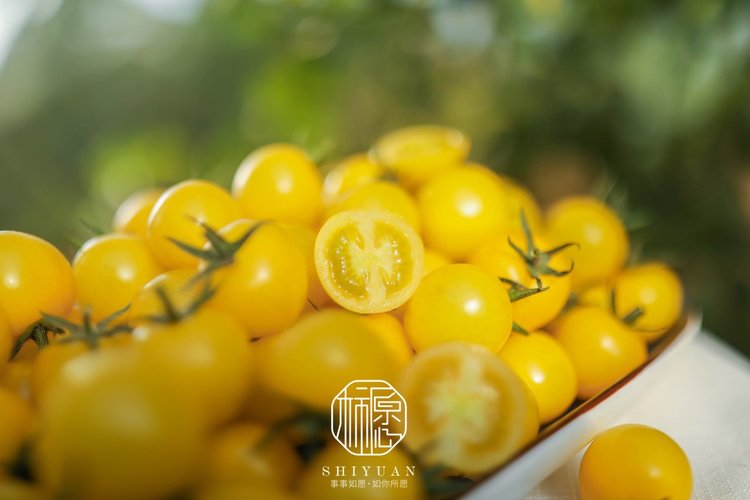 黄色樱桃小番茄内里汁多丰盈,掰开后汁水清晰可见,食欲感强,诱人外表,散发自然清甜香味。