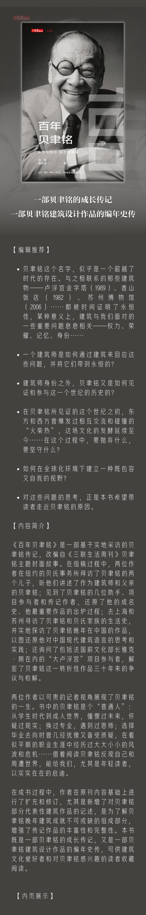 新疆西藏港澳台地区不发货请勿拍单,感谢您的理解! 编辑推荐 贝聿铭这个名字,似乎是一个超越了时代的存在。与之相联系的那些建筑物——卢浮宫金字塔、香山饭店、苏州博物馆,都被时间证明了永恒性。某种意义上,建筑与我们面对的一些重要问题息息相关——权力、荣耀、记忆、身份…… 一个建筑师是如何通过建筑来回应这些终极问题,并将它们带到永恒的? 超越建筑师身份之外,贝聿铭又是如何见证和参与这一个世纪的历史的? 在贝聿铭所见证的这个世纪之初,东方和西方曾爆发过相互交流和碰撞的“火柴热”,这场文化的发酵延续至今…… 在这个过程中,要抛弃什么,要坚守什么? 如何在全球化环境下建立一种既包容又自我的视野? 对这些问题的思考,正是本书希望带读者走近贝聿铭的原因。 内容简介 《百年贝聿铭》是一部基于实地采访的贝聿铭传记,改编自《三联生活周刊》贝聿铭主题封面故事。在组稿过程中,两位作者在纽约的贝氏事务所拜访了贝聿铭的两个儿子,听他们讲述了作为建筑师和父亲的贝聿铭;见到了贝聿铭的几位助手、项目参与者和传记作者,还原了他的成名史、他*重要作品的出炉过程;去上海和苏州寻访了贝聿铭和贝氏家族的生活史,并实地探访了贝聿铭晚年在中国的作品,以图还原他对中国现代建筑语言的思考和实践;还询问了包括法国前文化部长雅克•朗在内的“大卢浮宫”项目参与者,解密了贝聿铭这一转折性作品三十年来的争议与和解。 两位作者以可贵的记者视角展现了贝聿铭的一生。书中的贝聿铭是个“普通人”:从学生时代到成人世界,憧憬过未来,怀疑过现实;换过专业,遇到过恩师;选择毕业去向时曾几经犹豫又备受质疑,在看似平顺的职业生涯中经历过大大小小的风波和危机……借着阅读贝聿铭反观自己和周遭世界,能给我们,尤其是年轻读者,以实实在在的启迪。 在成书过程中,作者在原刊内容基础上进行了扩充和修订,尤其是新增了对贝聿铭部分代表性建筑作品的记述,是为了解贝聿铭晚年建筑成就不可或缺的组成部分,增强了传记作品的丰富性和完整性。本书既是一部贝聿铭的成长传记,又是一部贝聿铭建筑设计作品的编年史传,可供建筑文化爱好者和对贝聿铭感兴趣的读者收藏阅读。