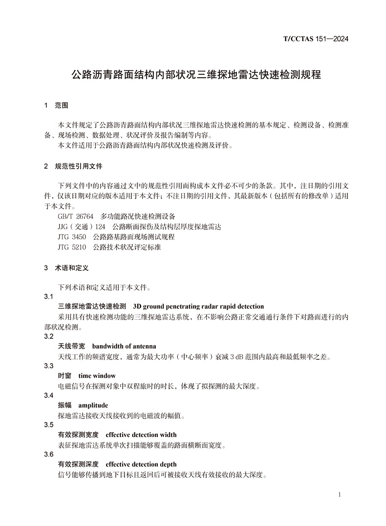 书名:公路沥青路面结构内部状况三维探地雷达快速检测规程T/CCTAS 151—2024