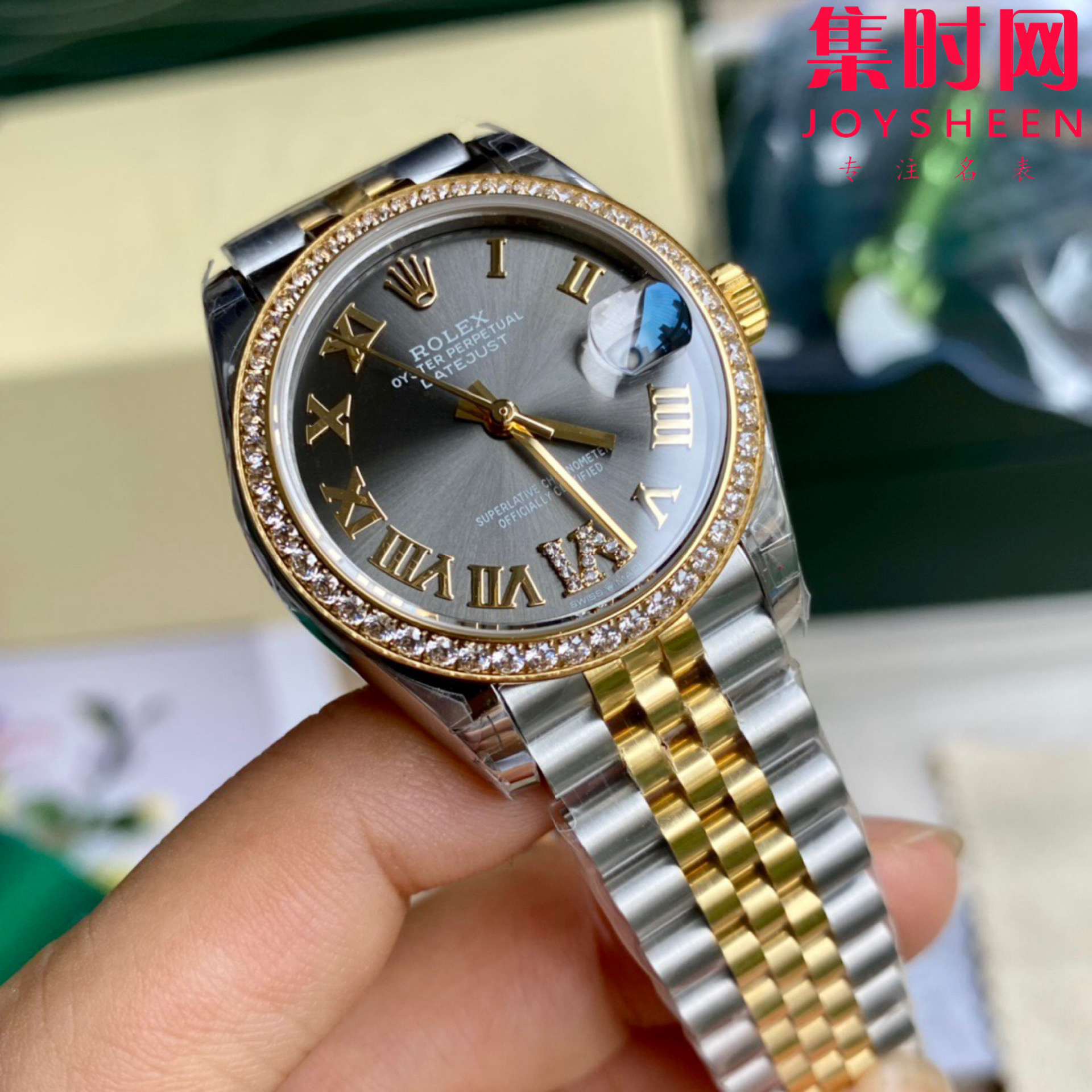 劳力士GS日志型系列 女款31mm 日志31系列 间金灰罗马钻圈 女士腕表 搭载改Cal.2236全自动机械机芯 日志型的蚝式表壳是坚固优雅的典范。采用904L不锈钢来锻造表壳表带,具备高抗腐蚀性。搭载改Cal.2236自动机械机芯 性能稳定,其抗震力、几何结构使机芯在任何位置都可保持规律运行。三角坑纹底盖以专用工具的旋紧,使表壳完全密封,上链表冠采用双扣锁双重防水系统,牢固旋紧于表壳,使得更加防水。镜面则以抗刮损蓝水晶制造,3点钟位置装有小窗凸透镜,方便读取日期。女装日志型的防水蚝式表壳给予高精准机芯防护。