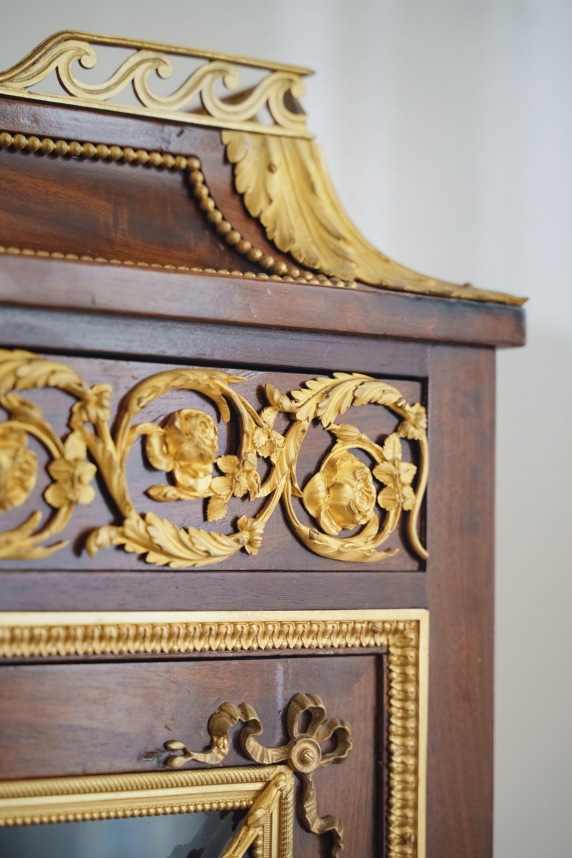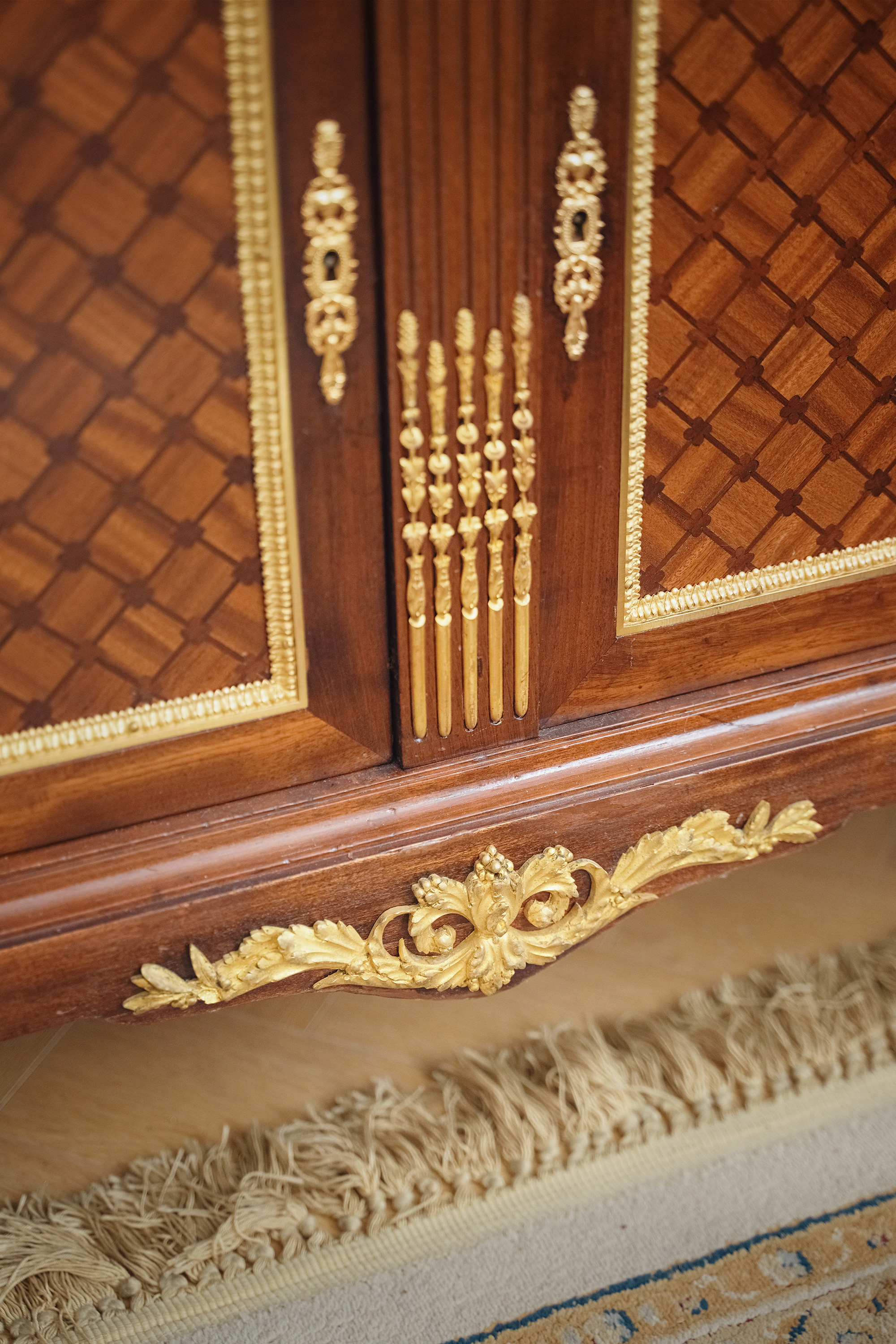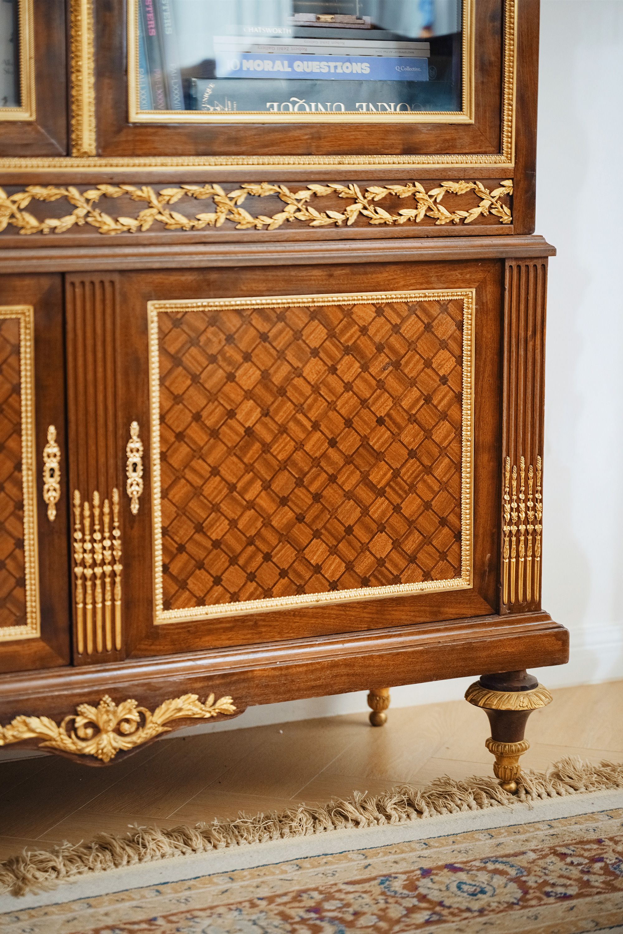 1890年代法国家具名坊SORMANI出品路易十六风格古典卷叶主题铜鎏金精雕装饰菱格拼接纹硬木玻璃柜