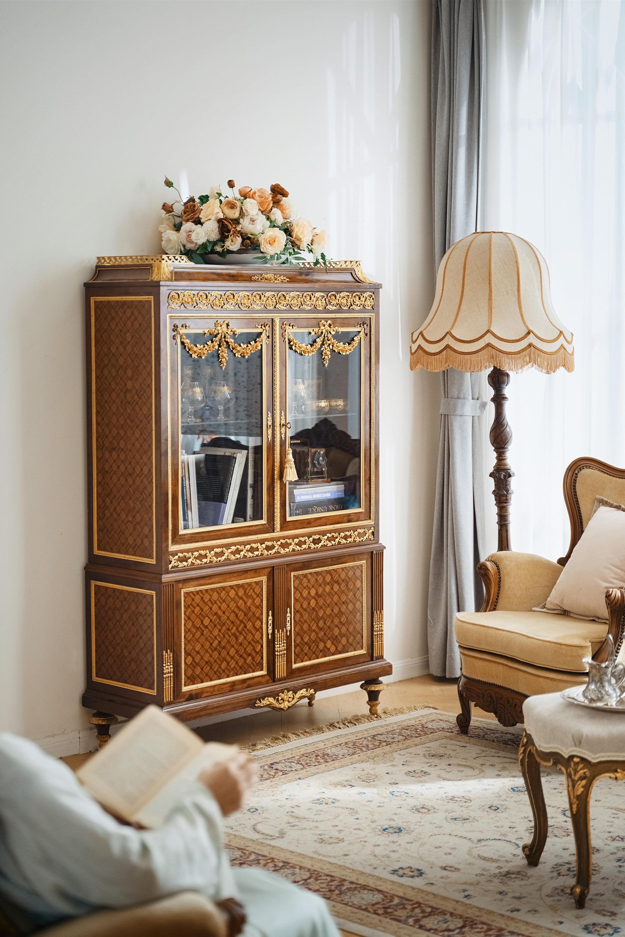 材质:实木,珍贵木皮,铜鎏金,玻璃