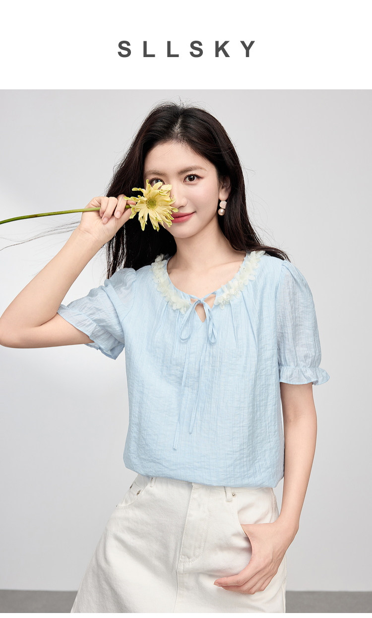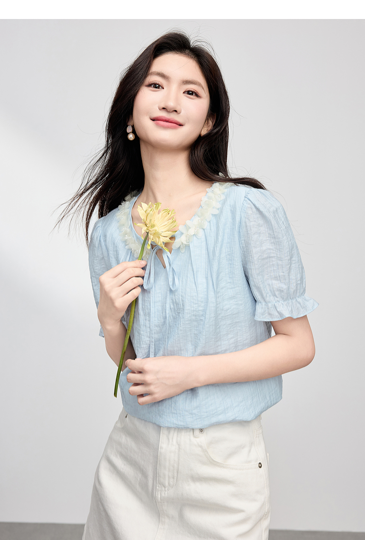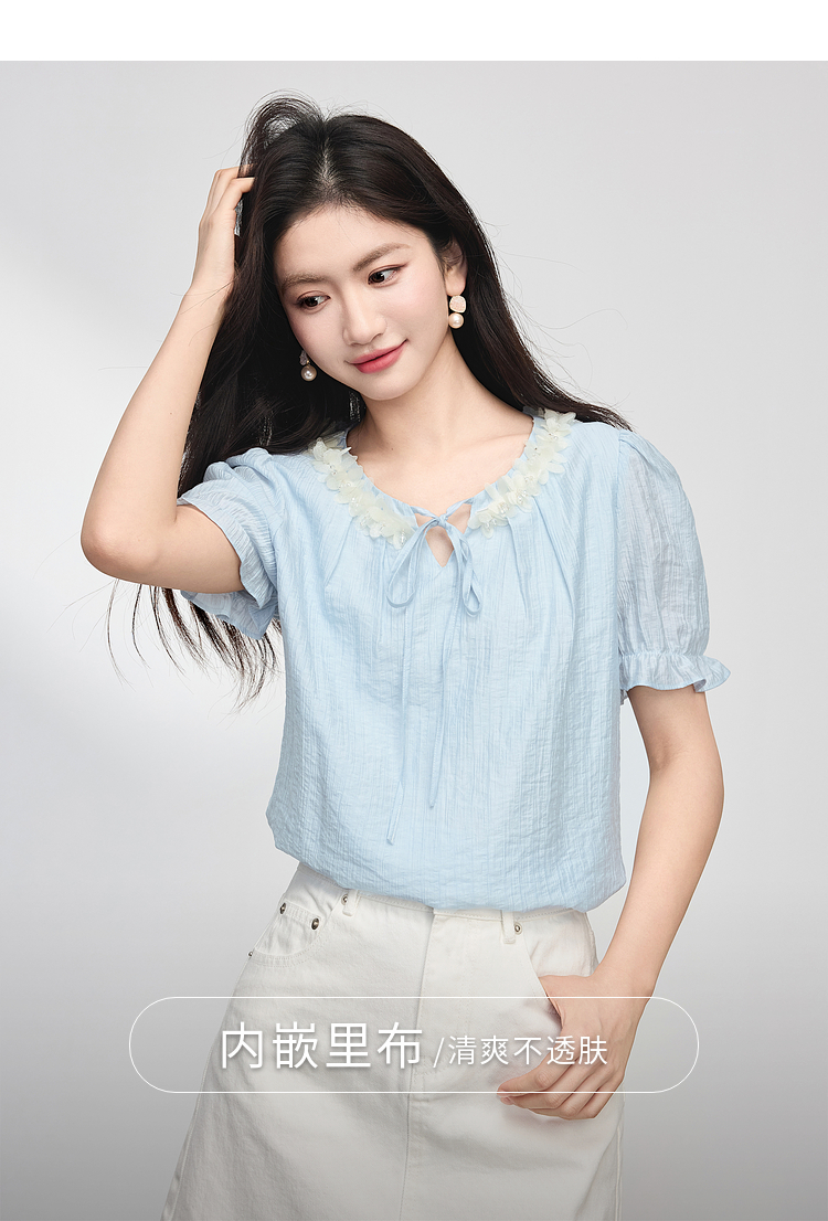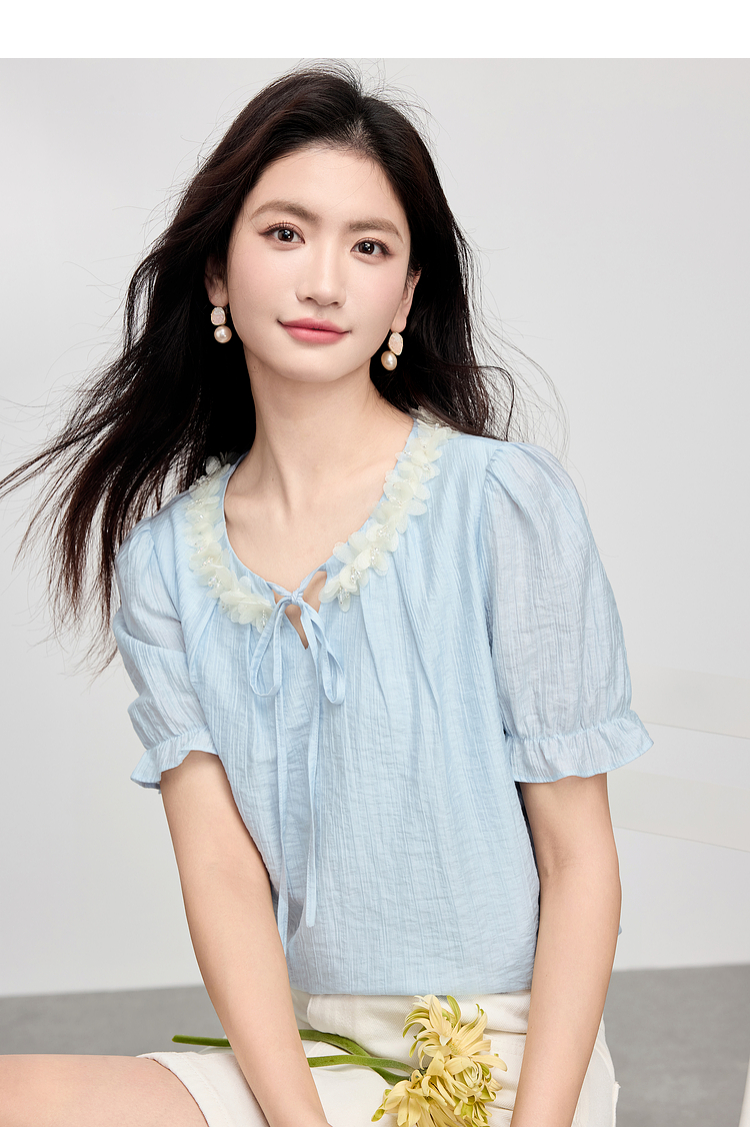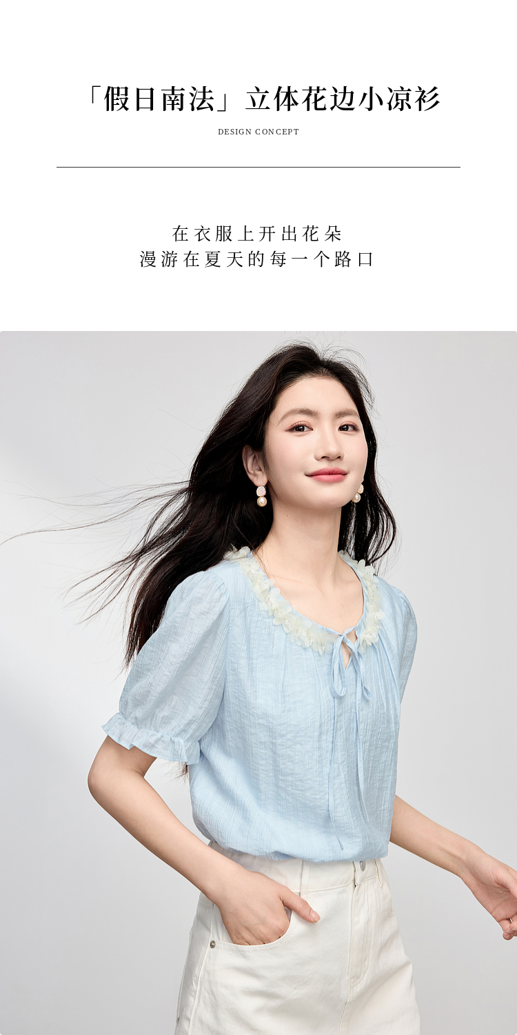 【专属特价】熙世界南法假日立体花边天丝衬衫女夏季2025年新款泡泡袖小衫上衣
