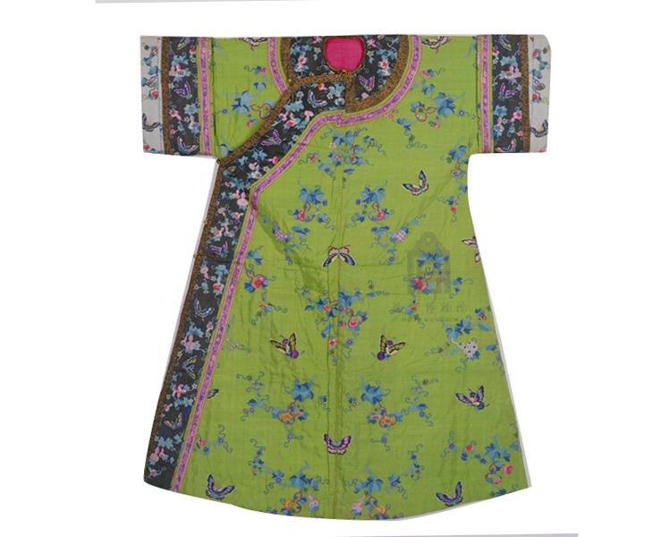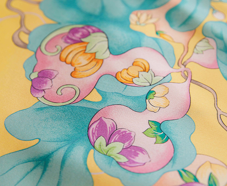 “灵感来源于宫廷的绿色缂丝子孙万代蝶纹棉衬衣。润泽饱满的葫芦,结于蜿蜒的藤蔓之上;缀以竹叶、寿桃、牡丹等吉祥图案。葫芦花伴葫芦叶,层层叠叠,动中有静,自然朴实,亦不失华贵。 葫芦其音“福禄”,象征幸福,其蔓密集绵延,结籽繁盛,亦表达子嗣昌吉、福禄万代之意。将美好的葫芦呈于君前,愿君一生,福禄绵长。