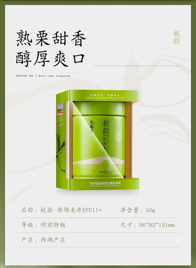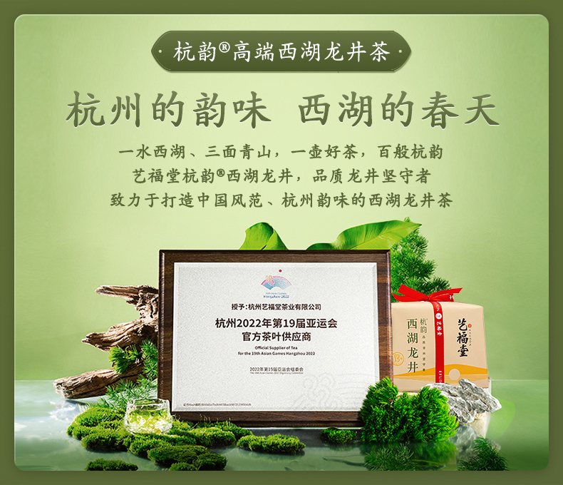 - “艺福堂茶业”创立于2008年,是一家集生产、销售、科研为一体的现代茶业企业,主打西湖龙井,兼营世界各地名优茗茶及花草茶,是中国茶行业为数不多的年销售额过5亿的品牌之一,是杭州亚运会官方指定用茶!