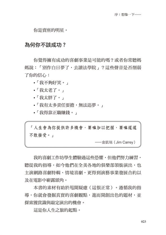 跟著喜劇狂人一起創作,加上大量正反範例、名人專家段子說明,學習完馬上用練習題確保成果,掌握幕後準備、演出、寫作及行銷自己的技巧,將幽默感成功展現出來,為人生創造更多機會。