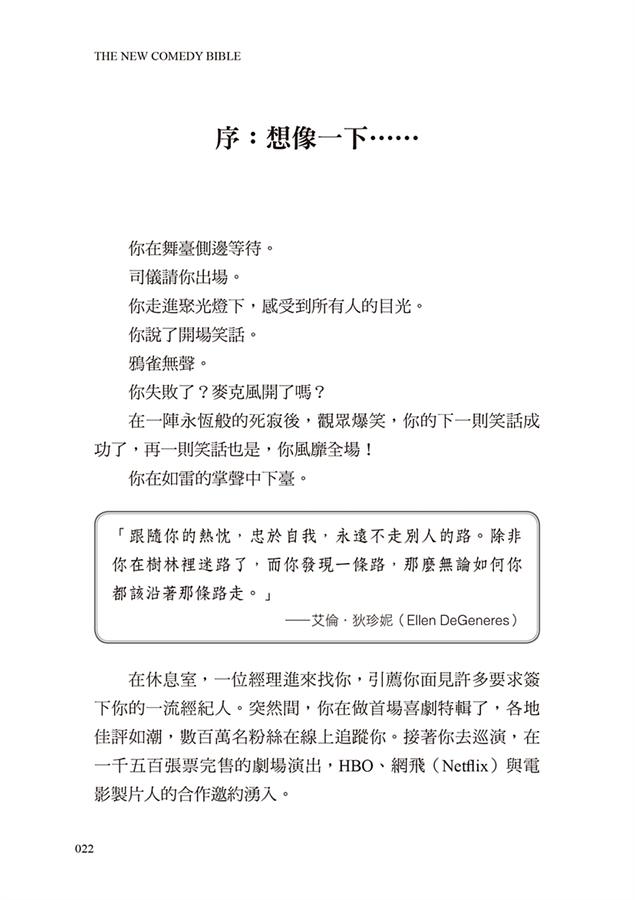 累積一些精修過的笑話,你要準備上台了,該穿什麼?怎麼震撼開場,讓大家馬上愛上你?怎麼延續笑聲至最後?到即興互動、應付突發狀況、回顧表演,一步步預演全程。