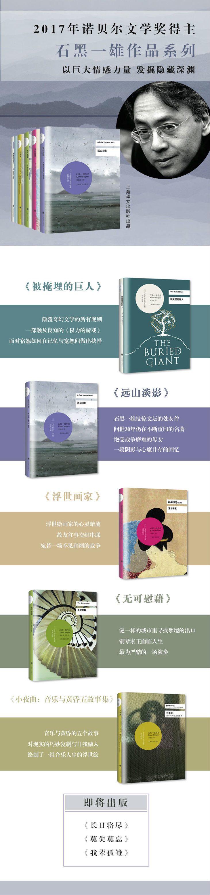 石黑一雄的小说,以其巨大的情感力量,发掘了隐藏在我们与世界联系的幻觉之下的深渊。——瑞典学院