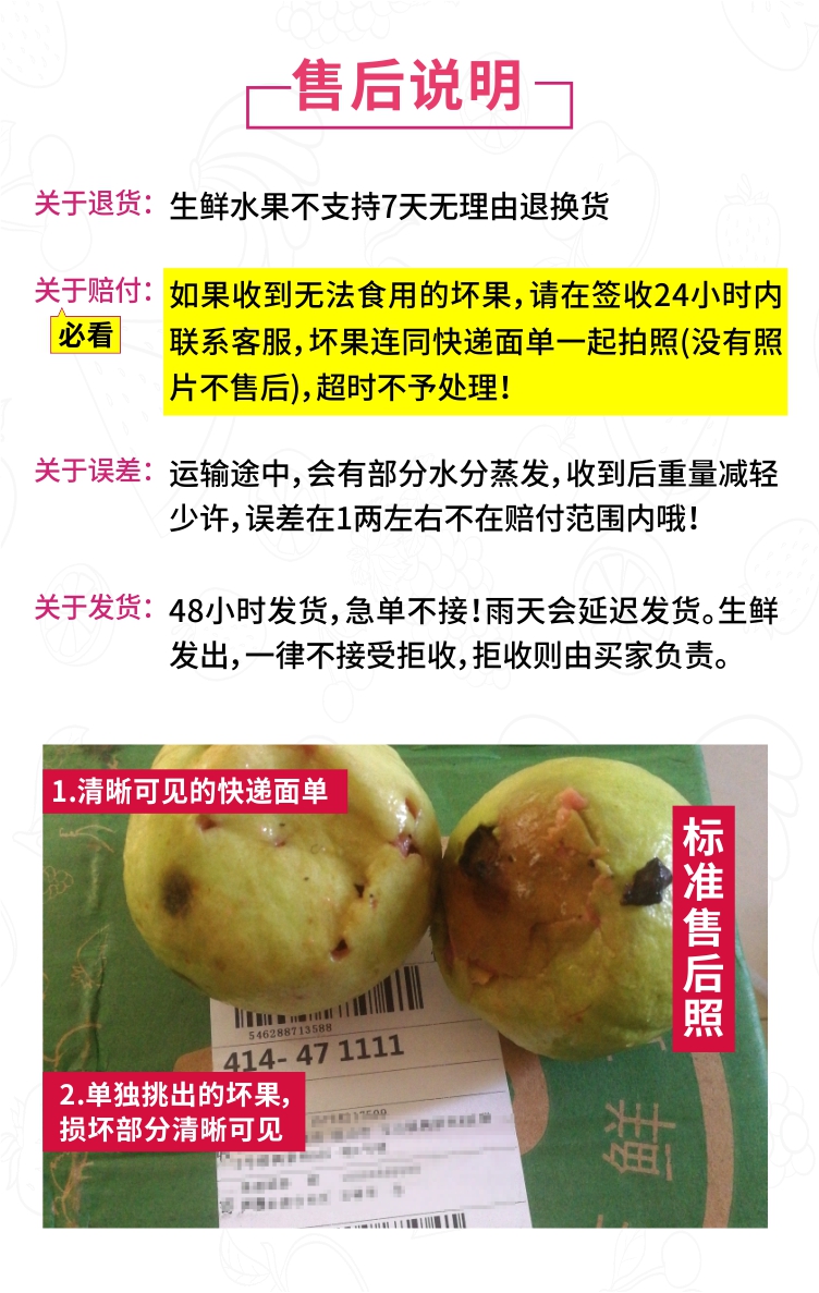 1. 签收后第一时间验货,如有坏果售后需要提供清晰的坏果面和快递面单一起的照片。