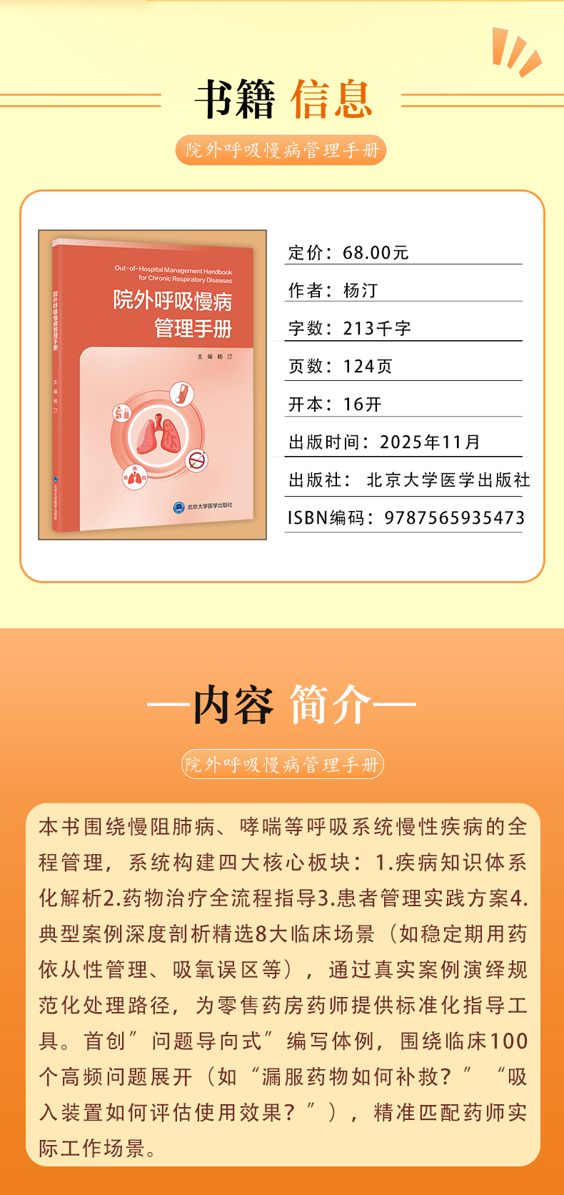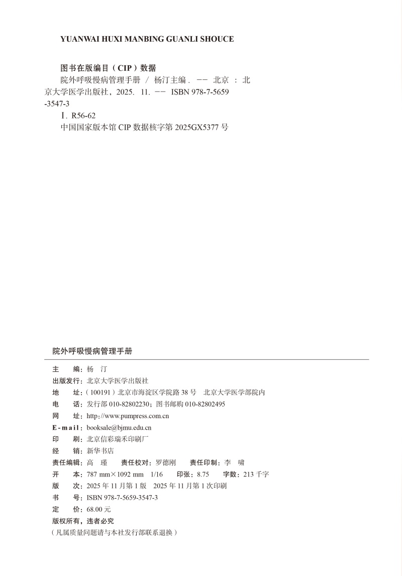 院外呼吸慢病管理手册 杨汀 主编 围绕呼吸慢病全程管理 精准匹配实际工作场景 慢性病 诊疗 9787565935473 北京大学医学出版社