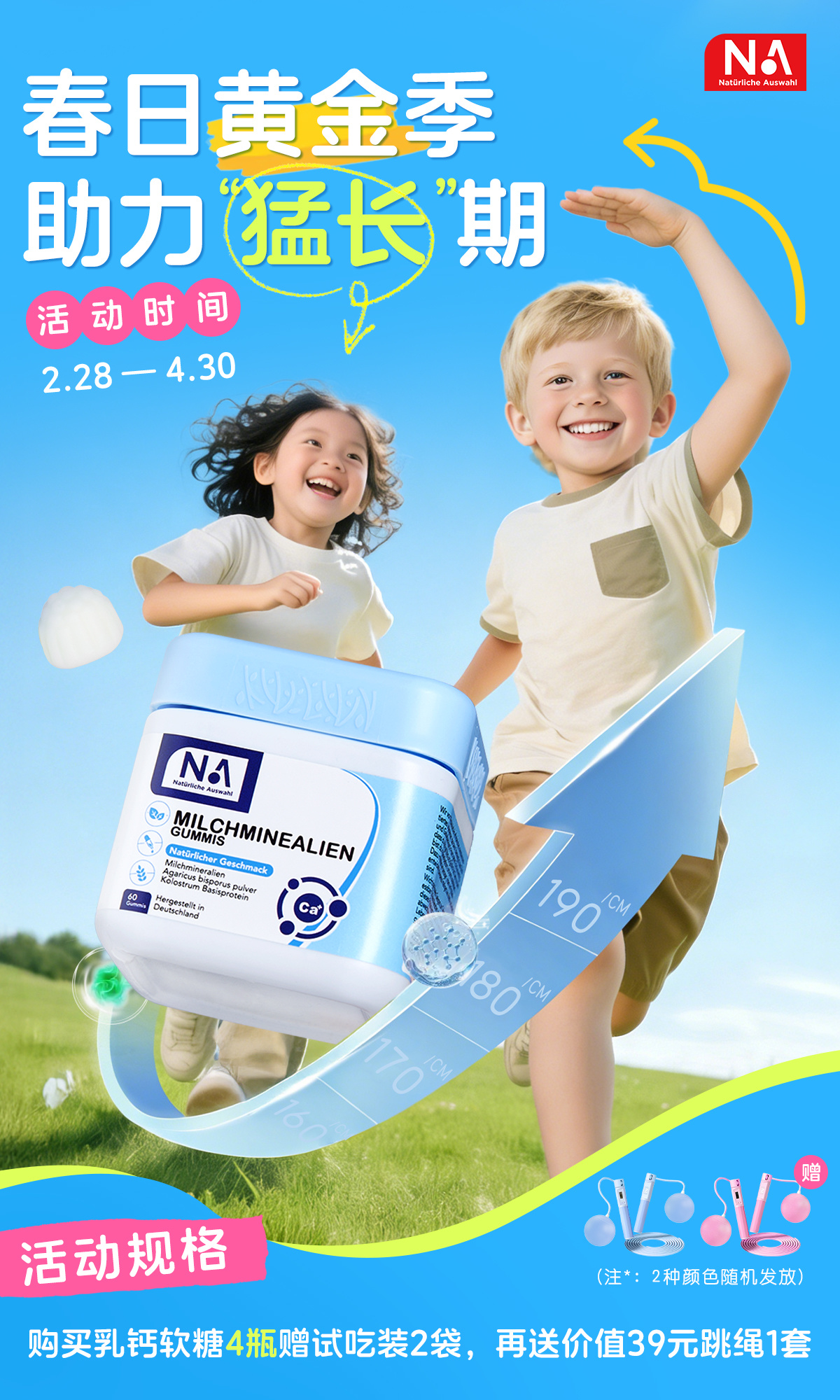 💥 趁活动囤足4瓶,送跳绳+试吃装,纵向运动刺激骨骼生长板,配合高吸收钙,效果直接翻倍!这个春天让孩子“高人一等”!
