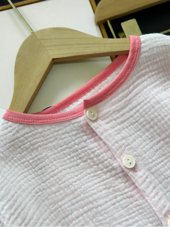 这款衣服用的是💯纯棉面料 采用新型绉纱织造技术, 摸起来软乎乎的巨舒服吖! 一上手我就想拿在脸上蹭~ 整个人就像在麻麻怀抱里面一样舒适☁️