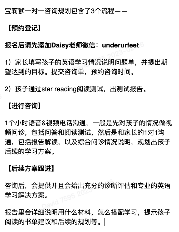 宝莉爹1对1英语启蒙问诊咨询(Star Reading阅读问诊测评,标准化流程+1v1咨询+推荐阅读书单&规划方案)AR题库