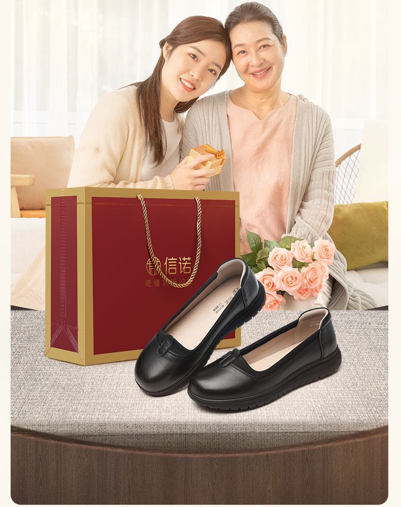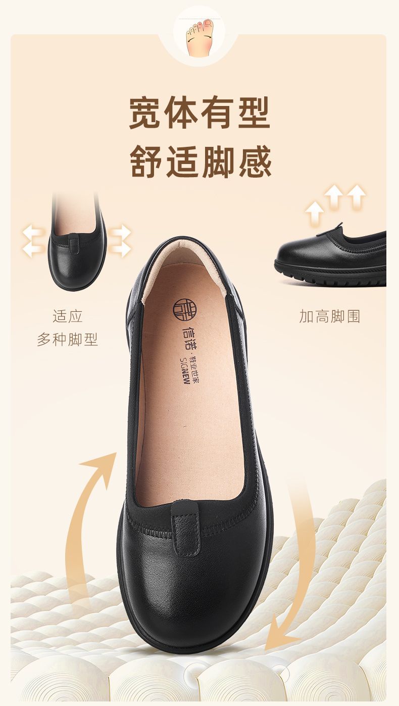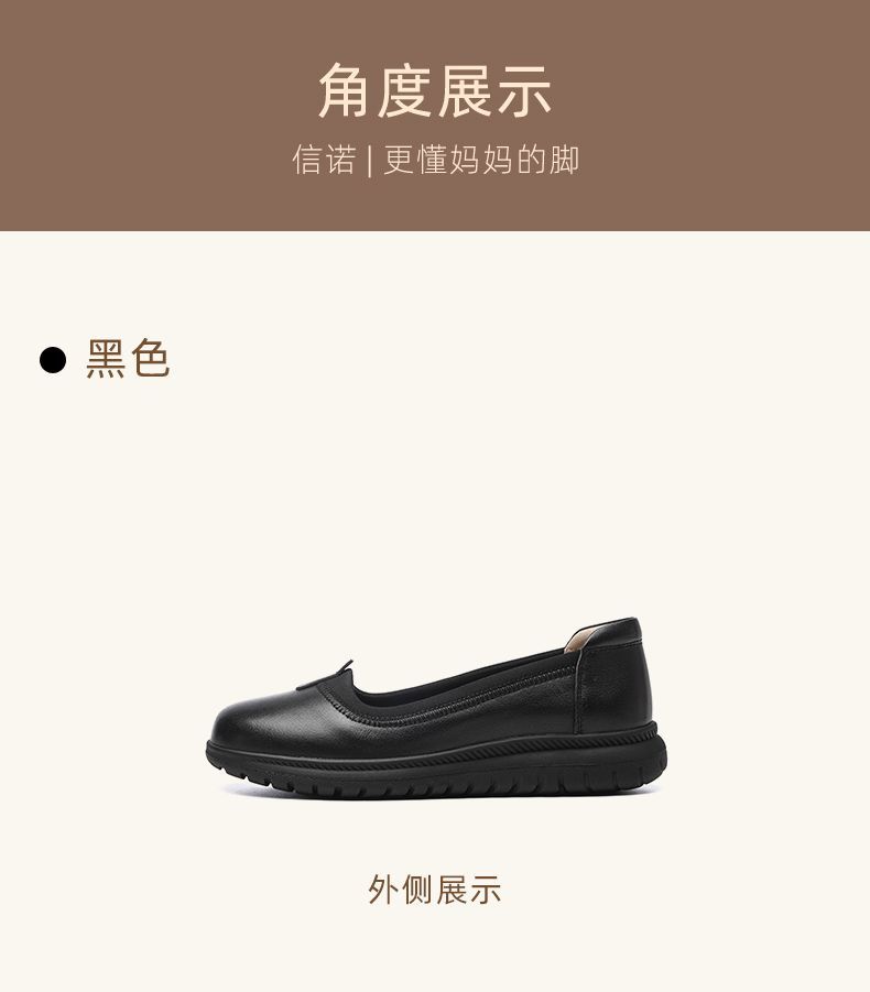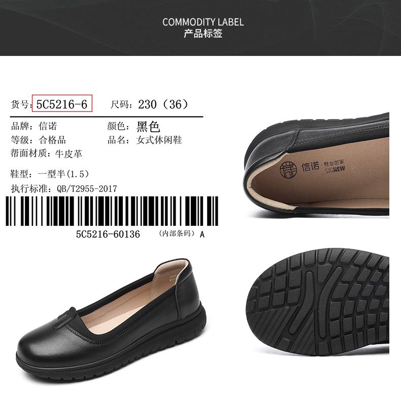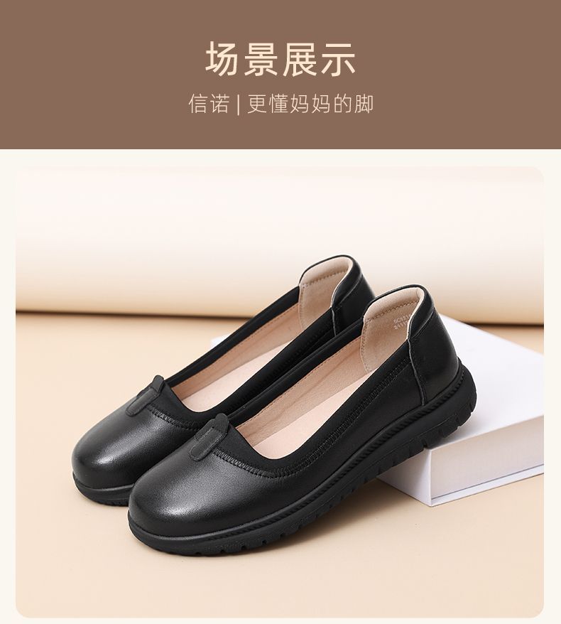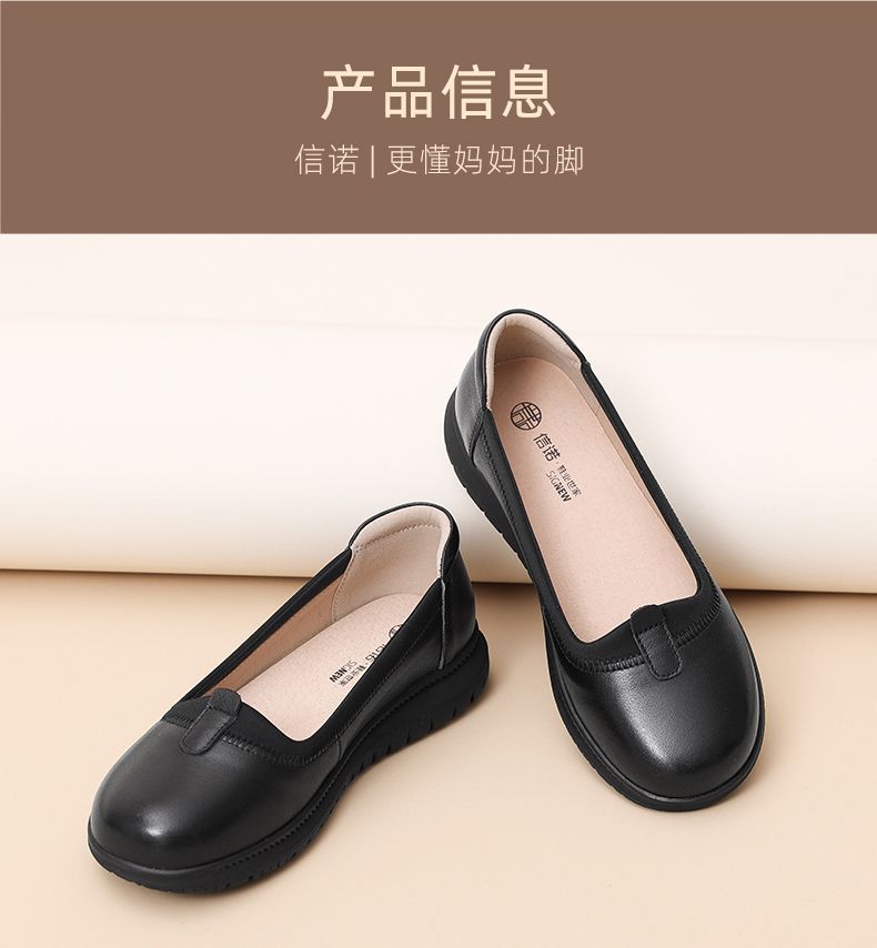 信诺真皮舒适妈妈工作鞋圆头软底平底职业酒店舒适黑色上班皮鞋女5C5216-6