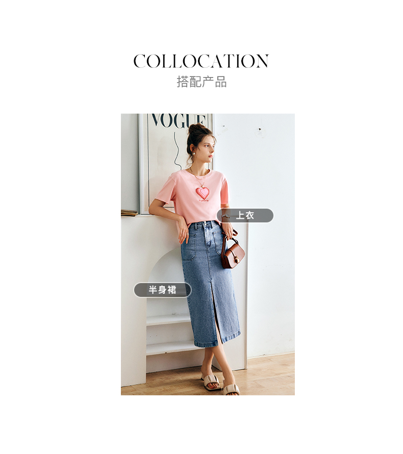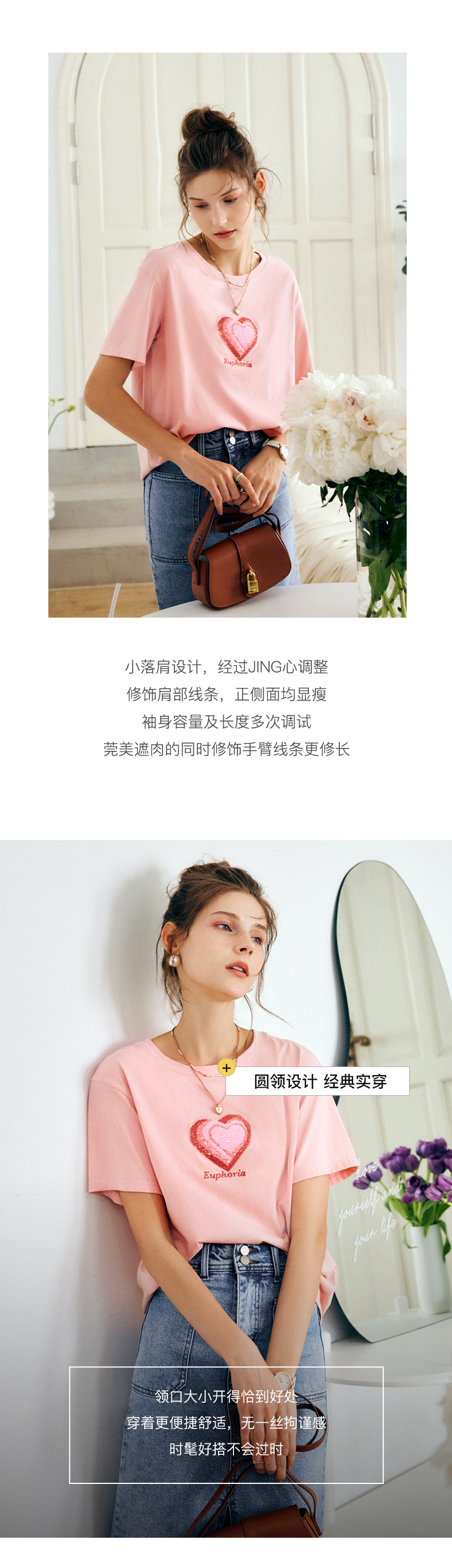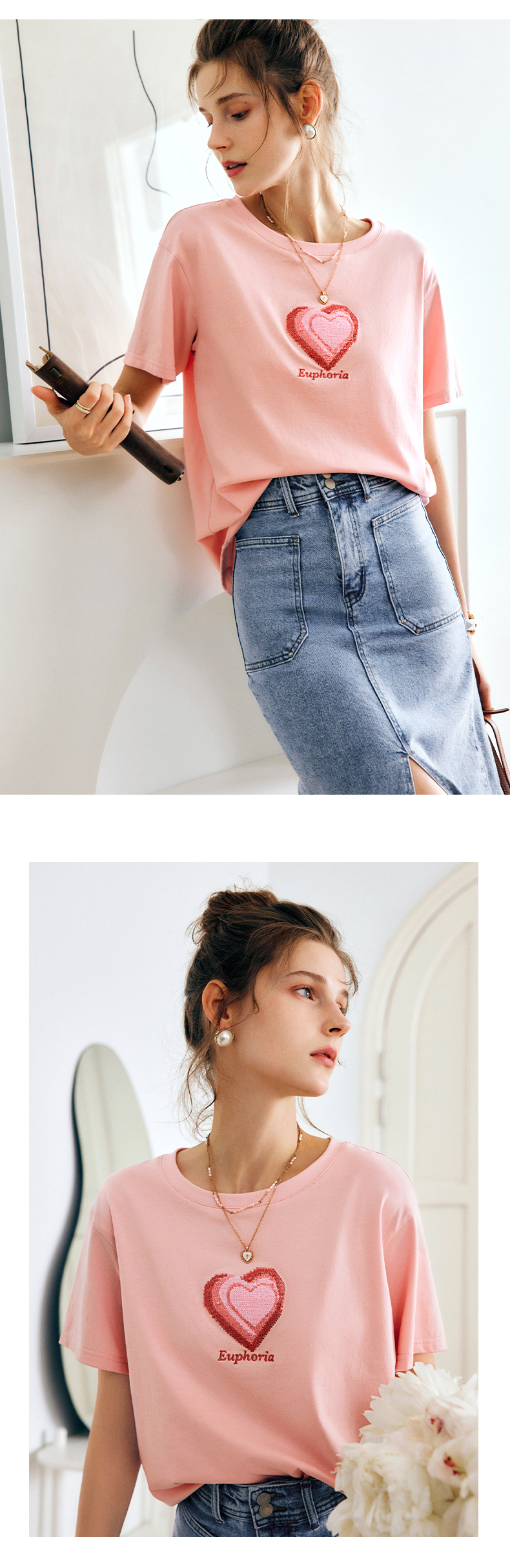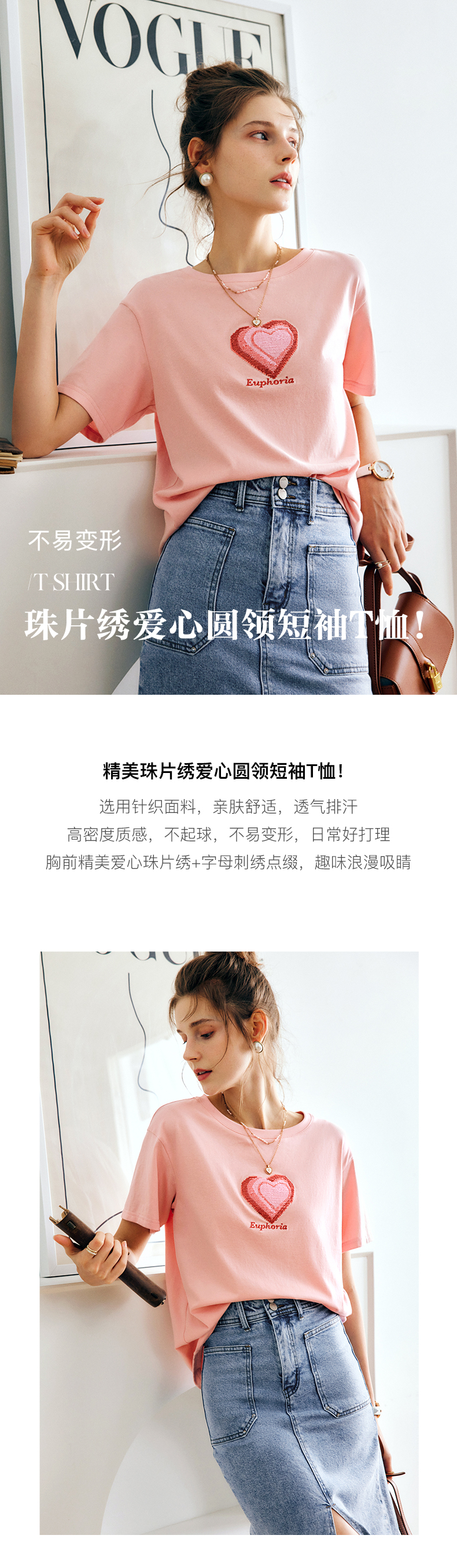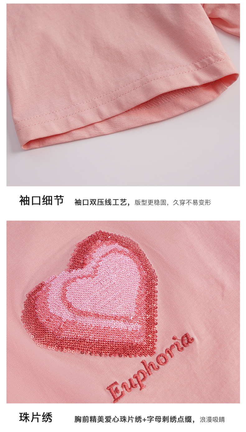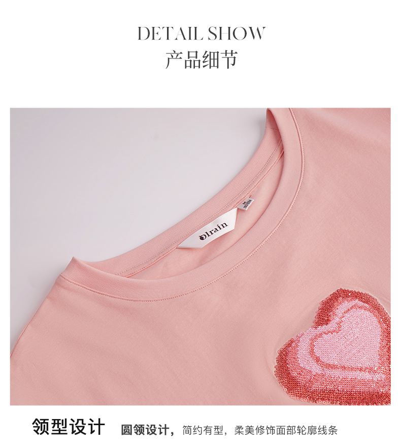 OLrain法式粉色短袖T恤女夏季2022新款宽松显瘦爱心珠片圆领上衣