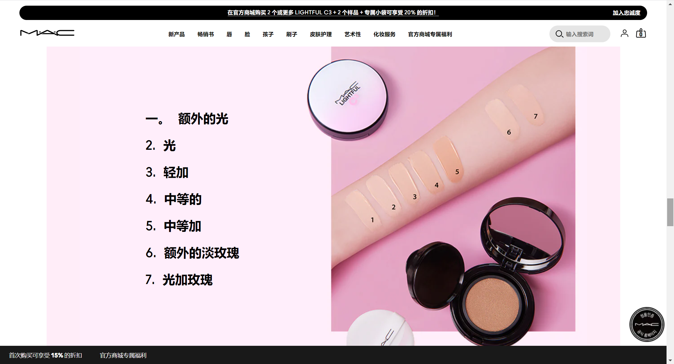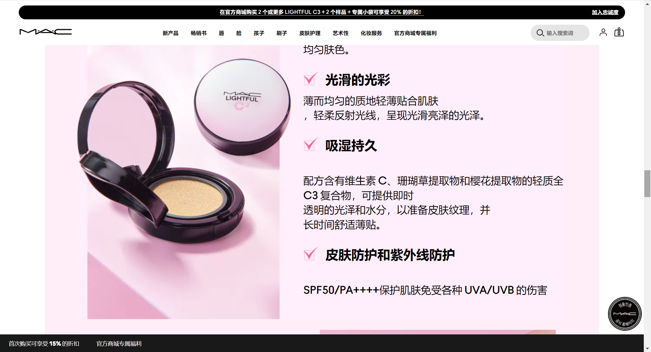 美国MAC粉红气垫LIGHTFUL C3 QUICK FINISH CUSHION COMPACT SPF 50/PA++++ WITH LIGHT-DIFFUSING COMPLEX