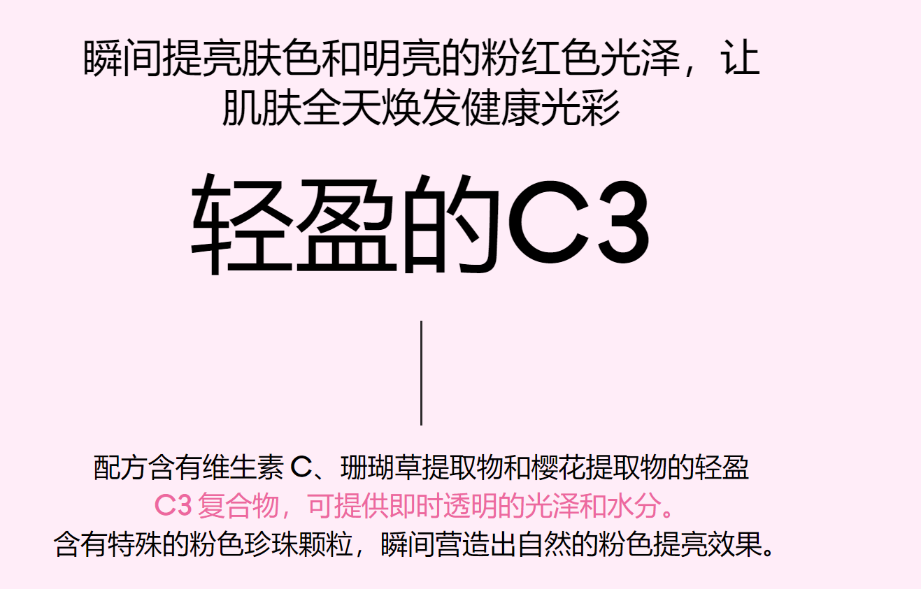 配方含有维他命C、珊瑚草提取物和樱花提取物的轻质C3复合物,瞬间赋予肌肤清透亮泽和水润质感,贴合舒适薄薄,持久持久。皮肤保护和紫外线防护