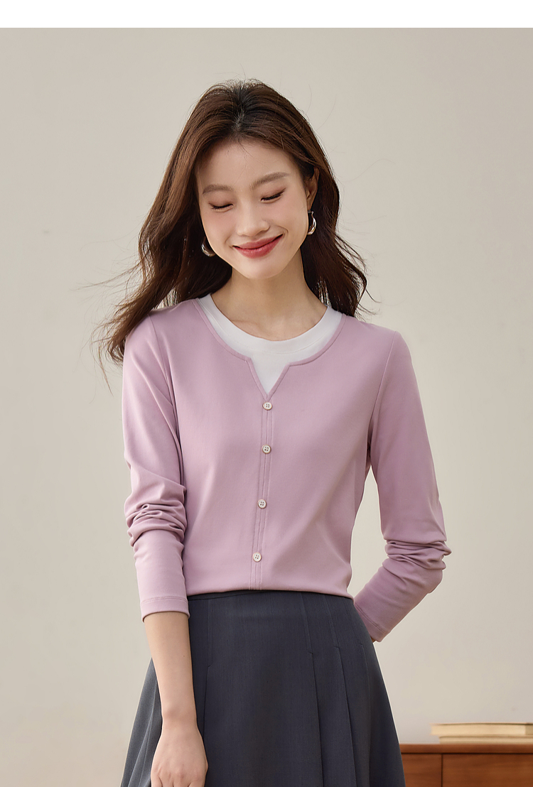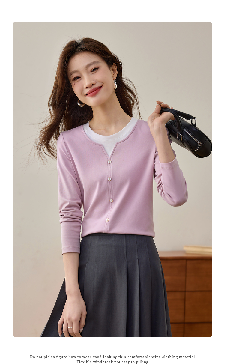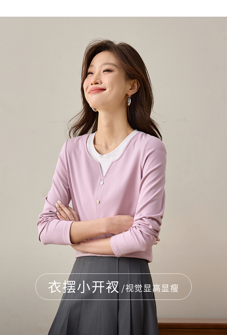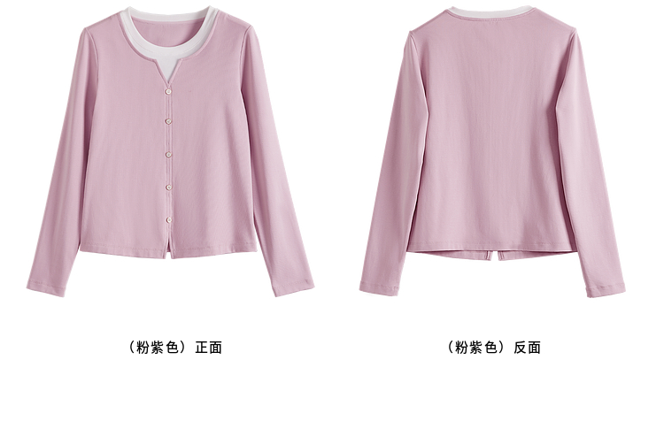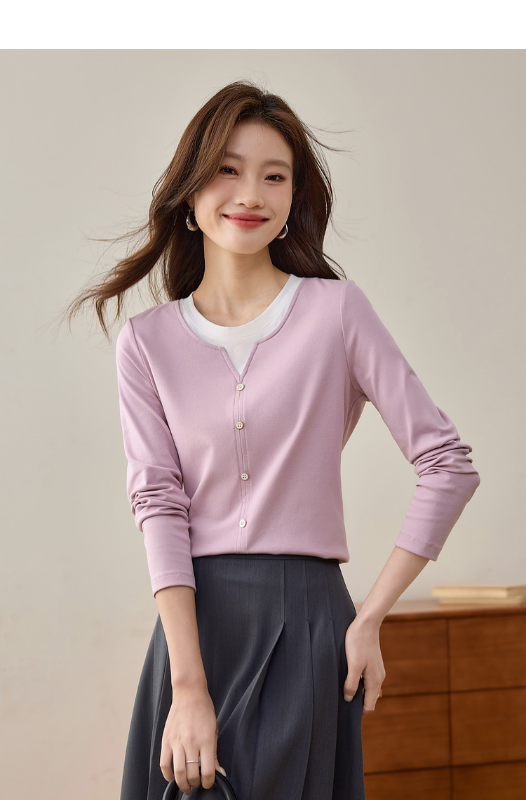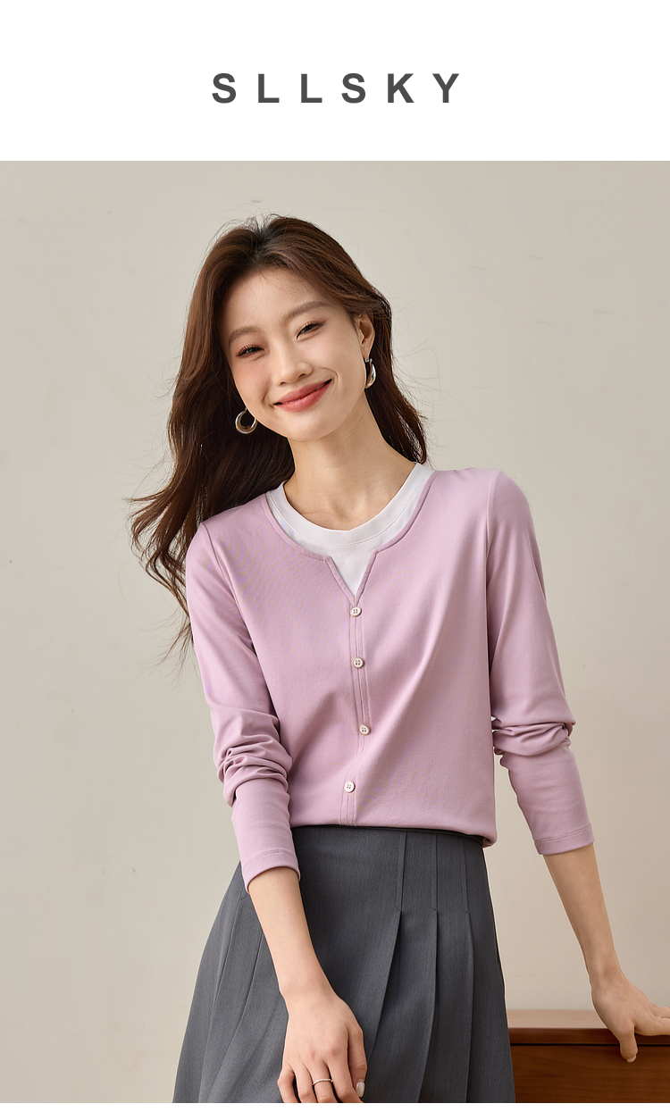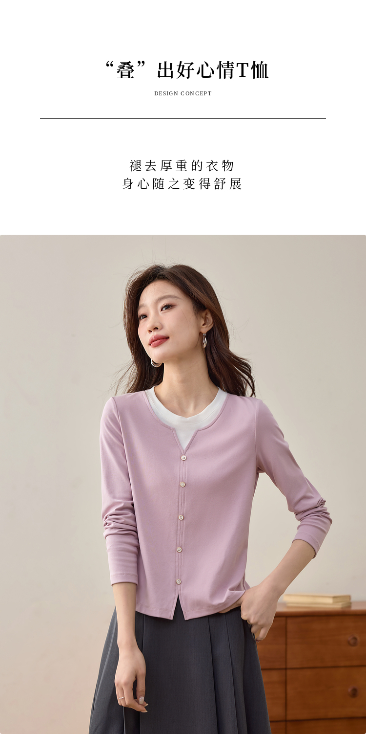 【1件8折】熙世界设计感紫色假两件T恤女长袖2025春秋新款显瘦圆领打底上衣