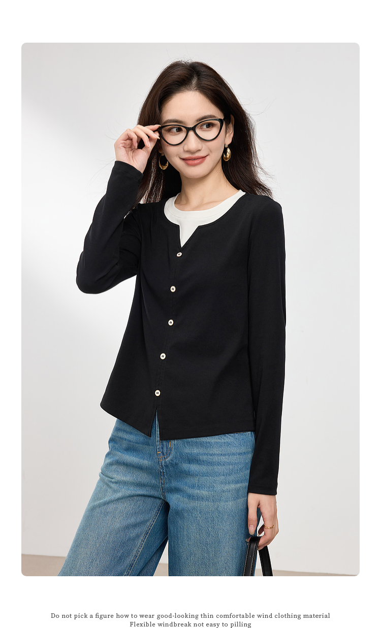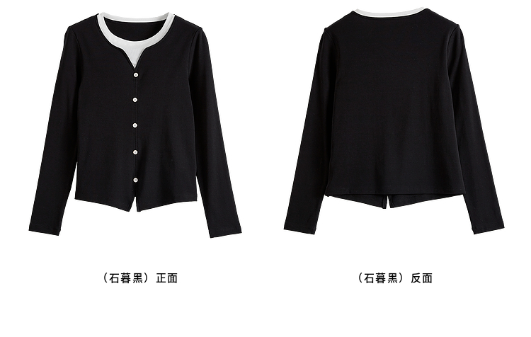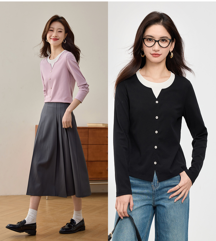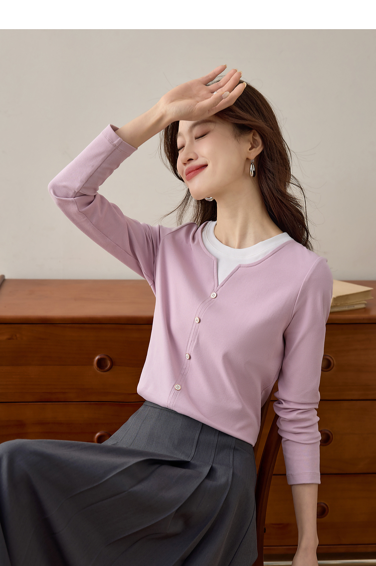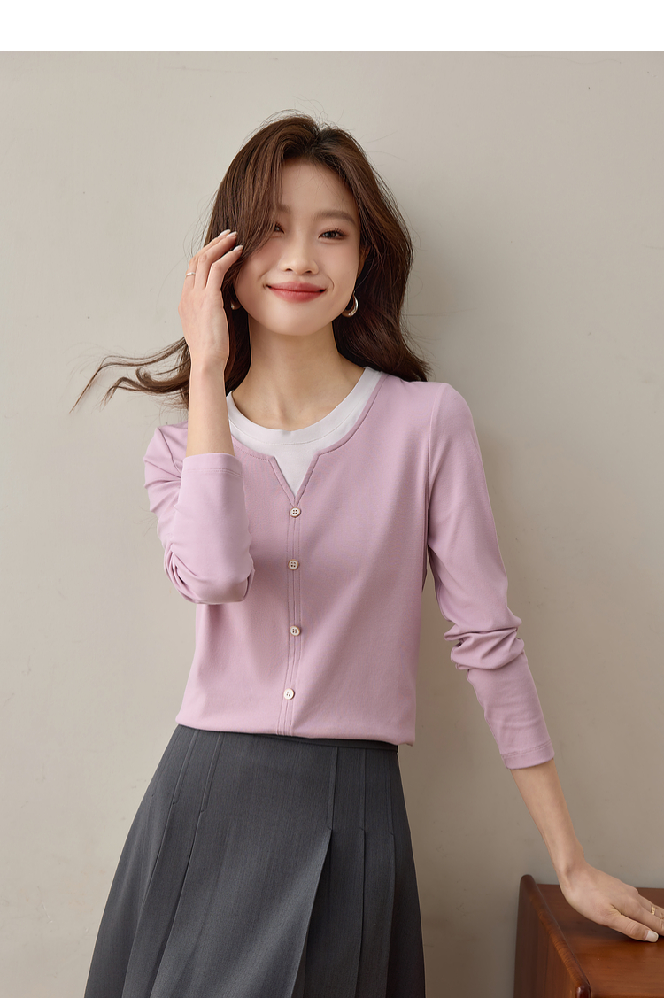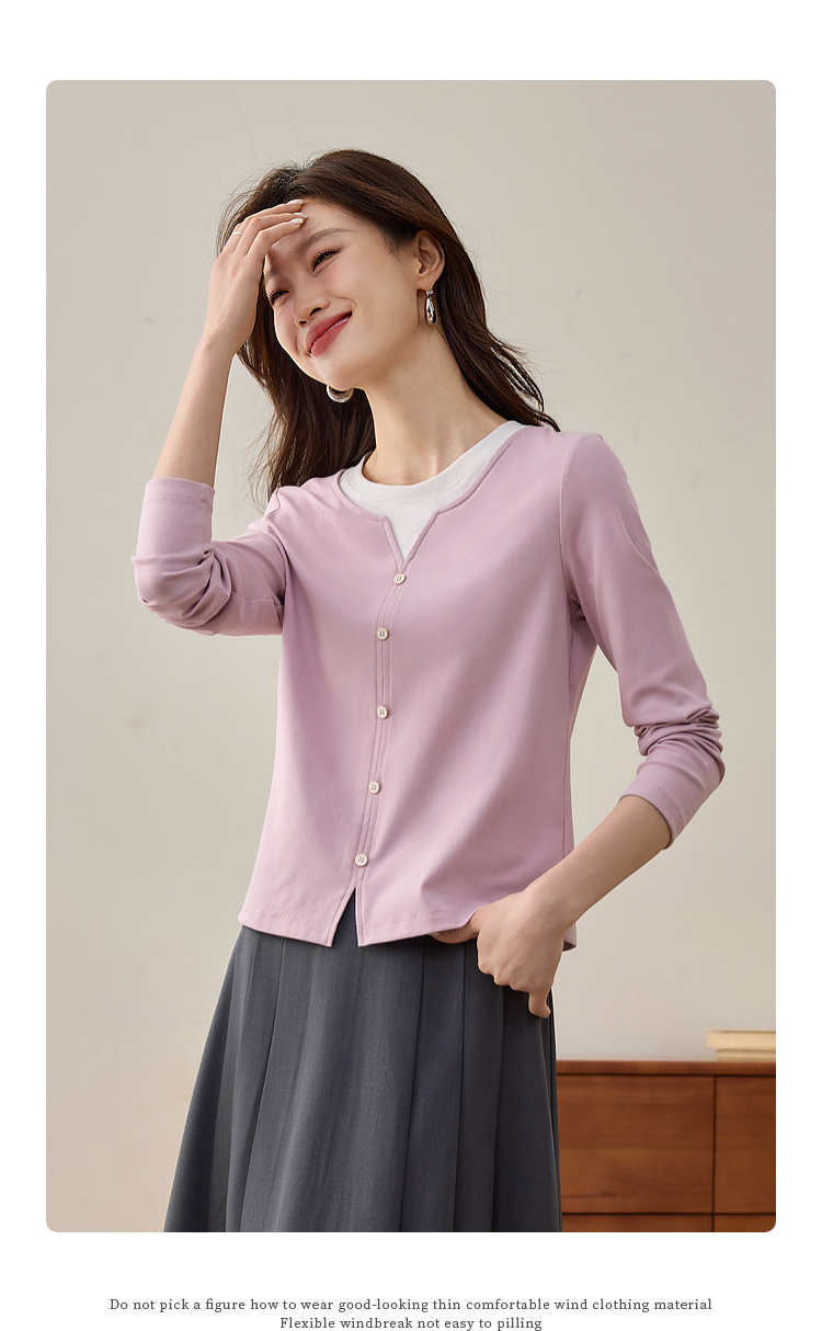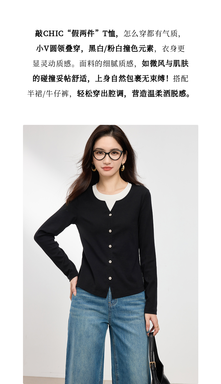 【1件8折】熙世界设计感紫色假两件T恤女长袖2025春秋新款显瘦圆领打底上衣