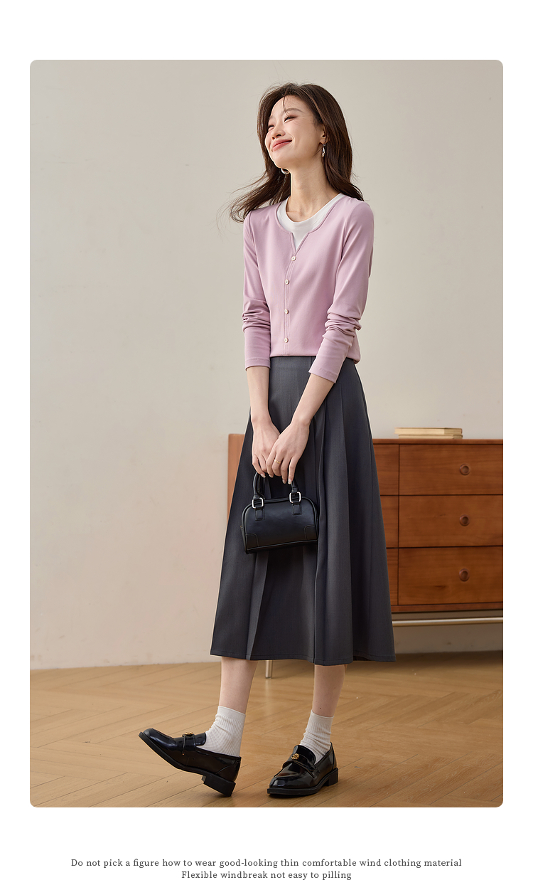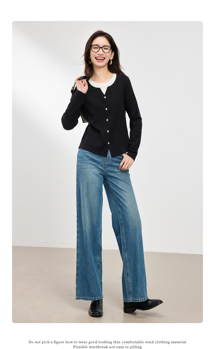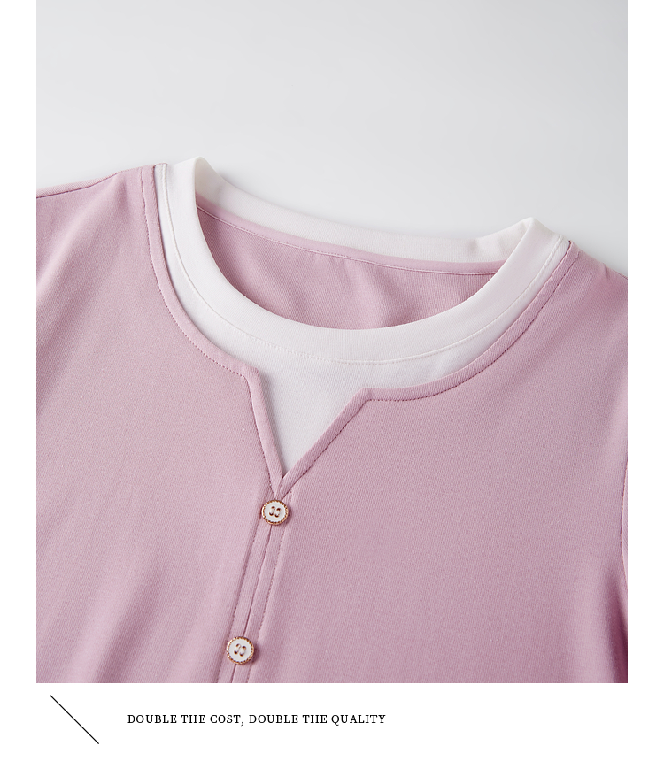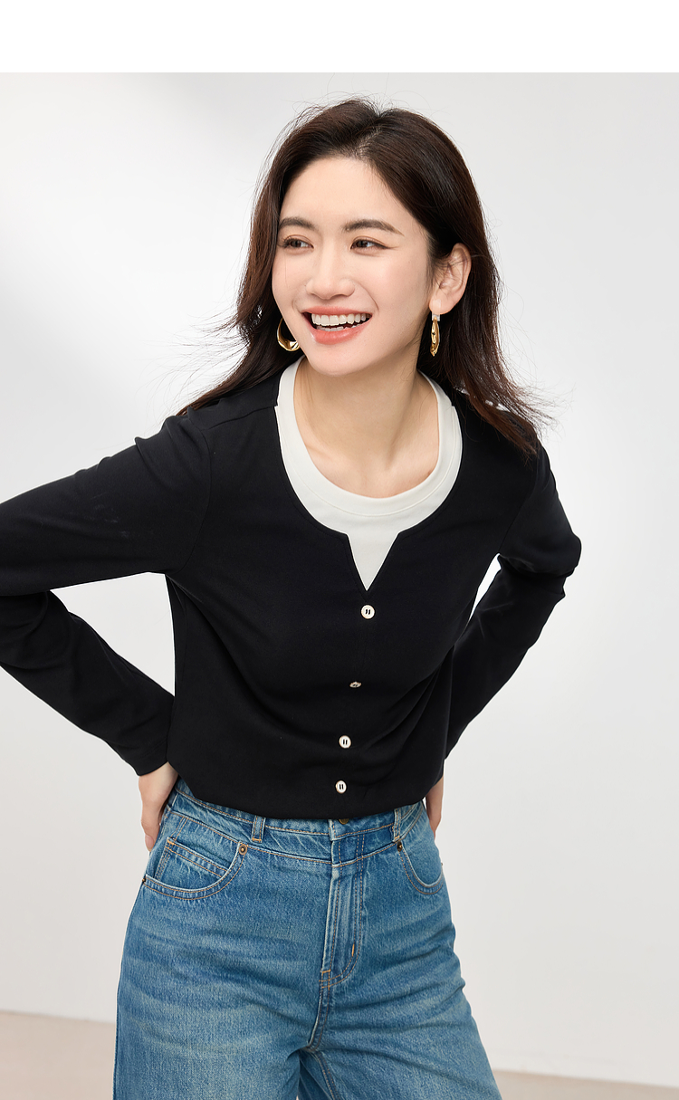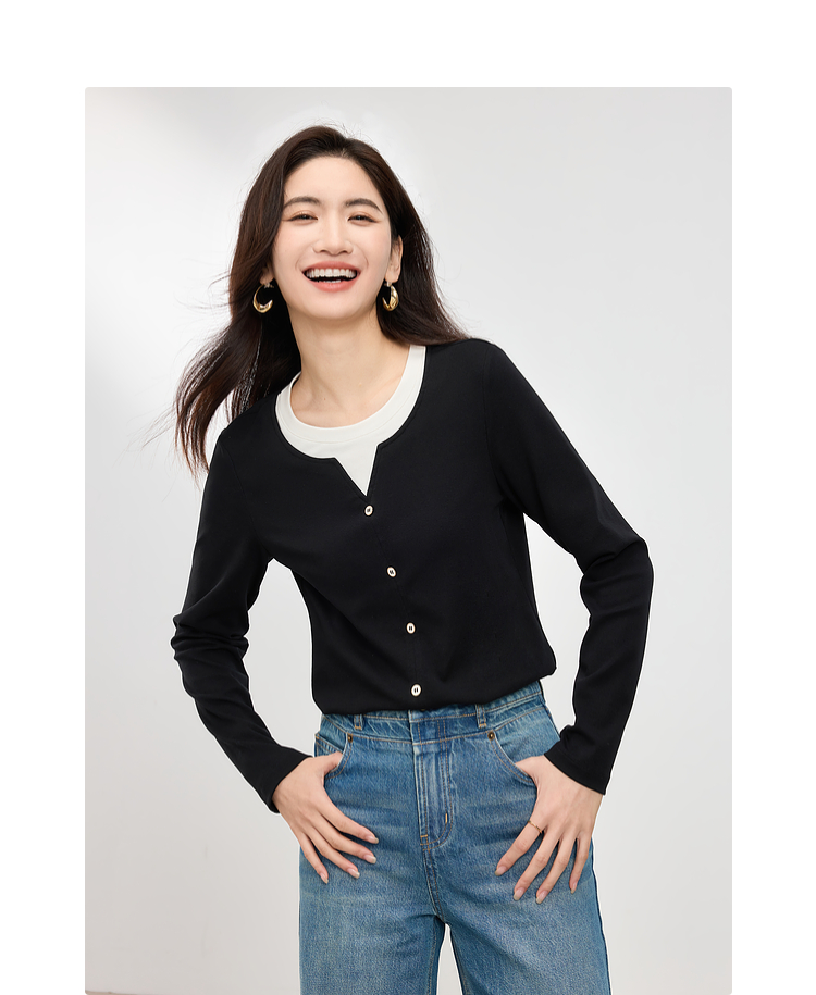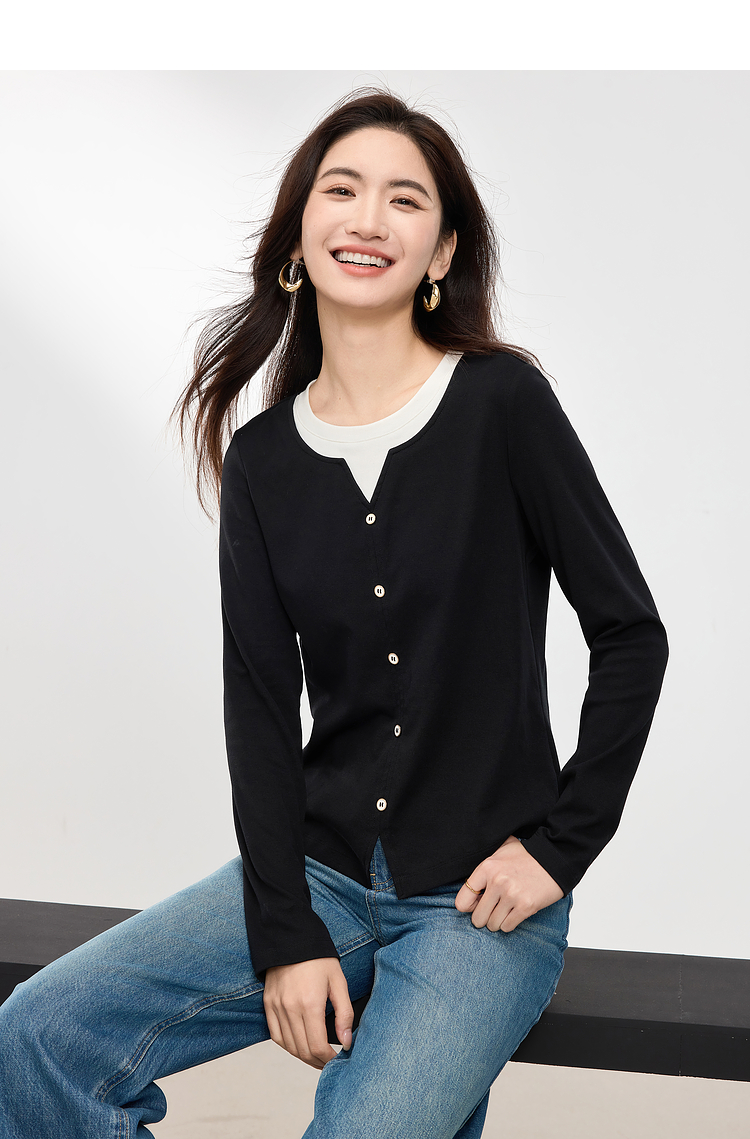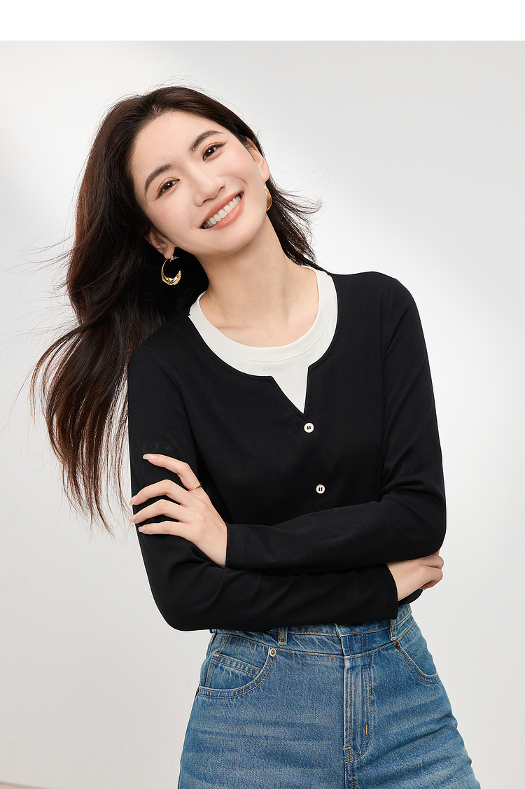 【1件8折】熙世界设计感紫色假两件T恤女长袖2025春秋新款显瘦圆领打底上衣