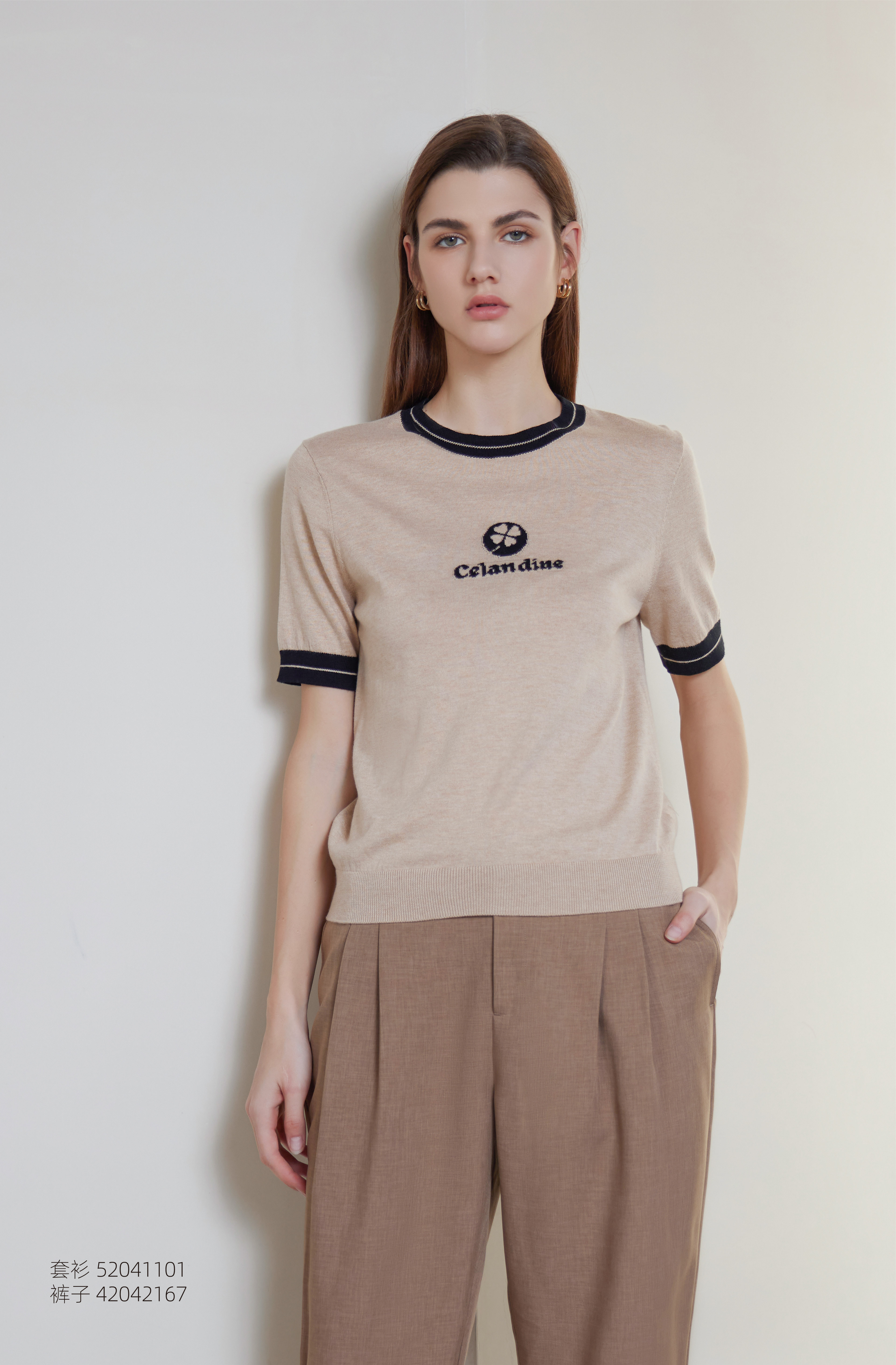 24年春季新品女士短袖针织套衫时尚百搭圆领撞色针织上衣