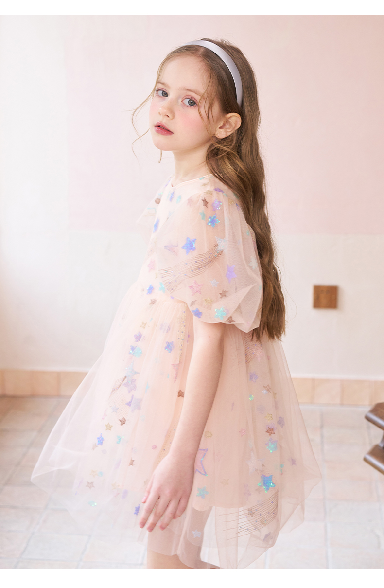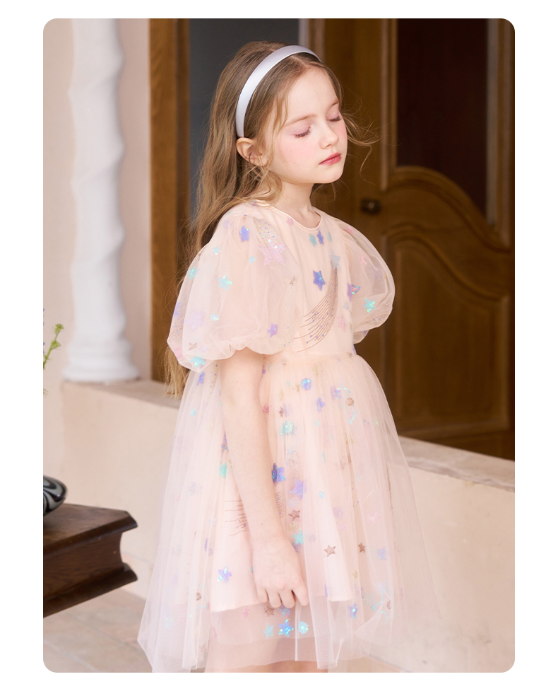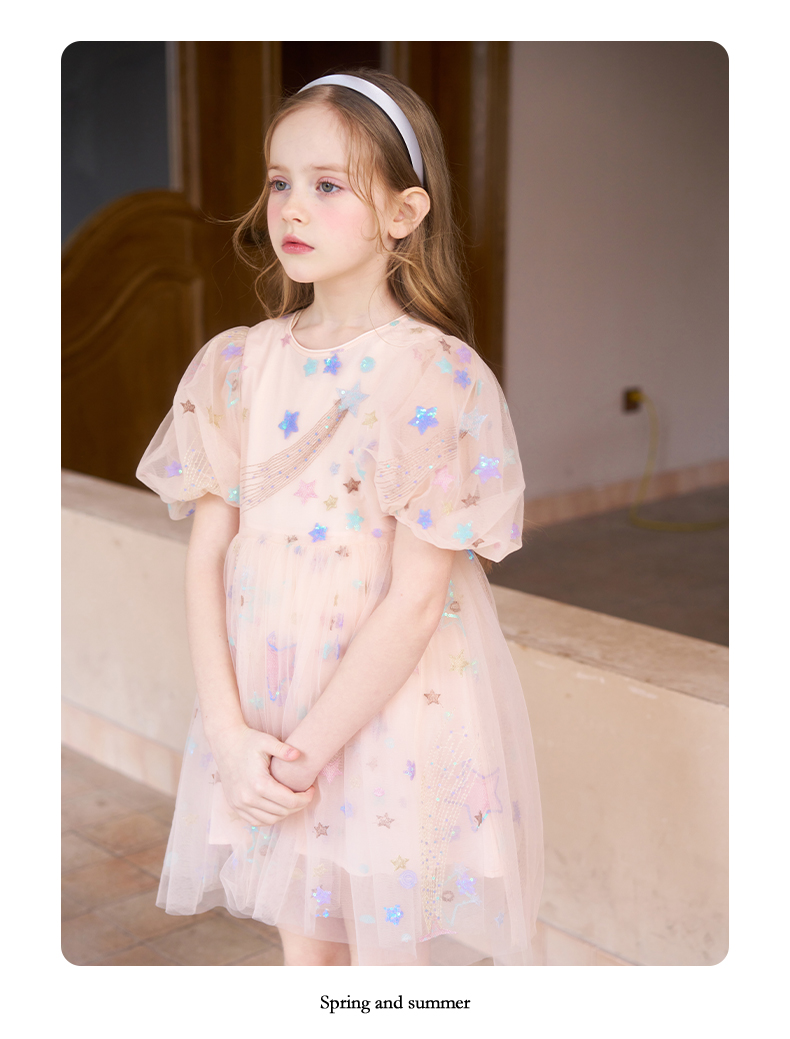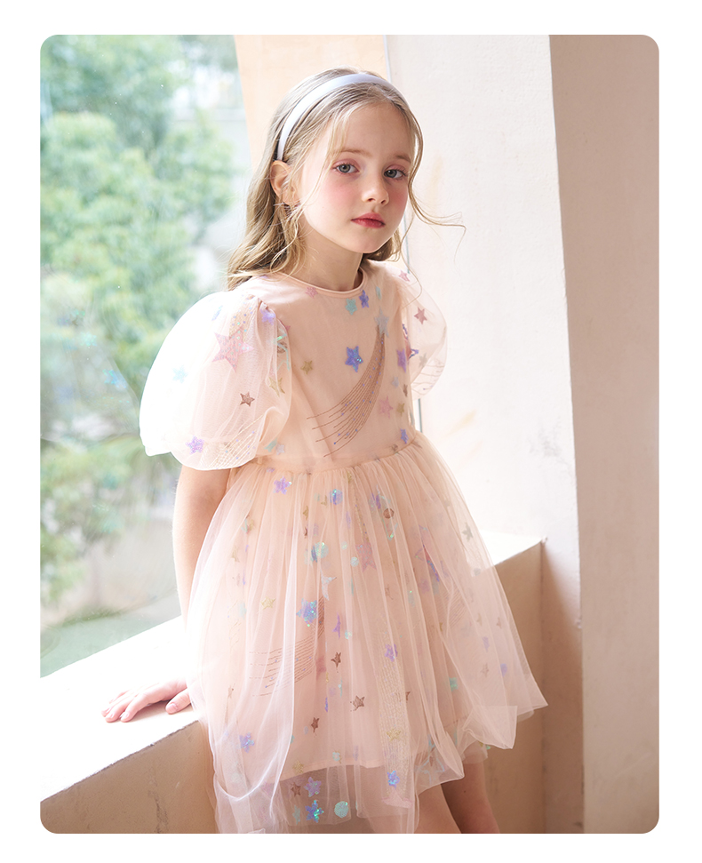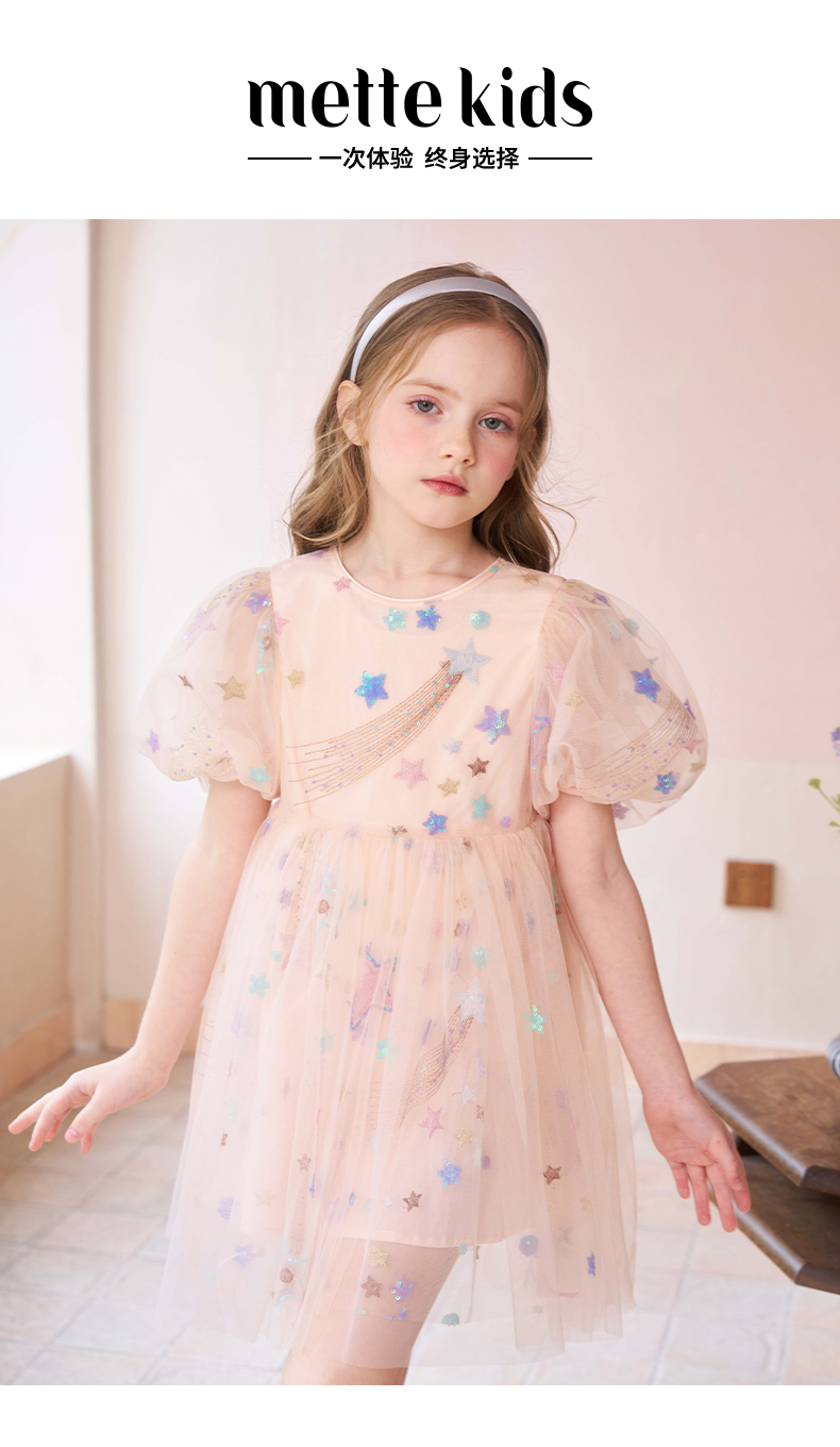 mettekids女童连衣裙儿童夏季粉色网纱裙子中大童泡泡袖公主裙