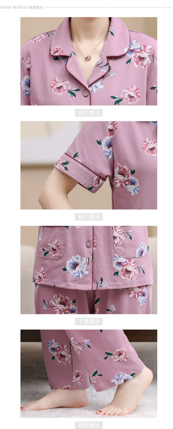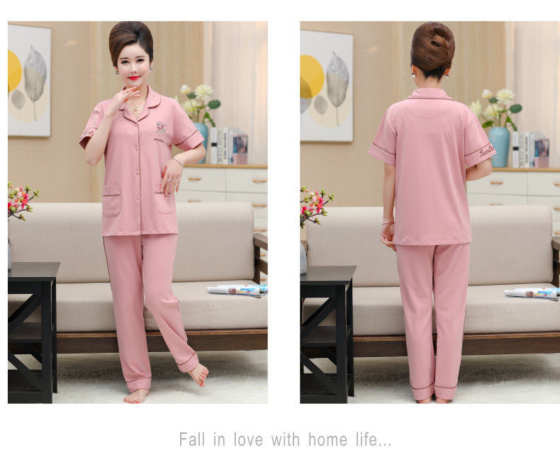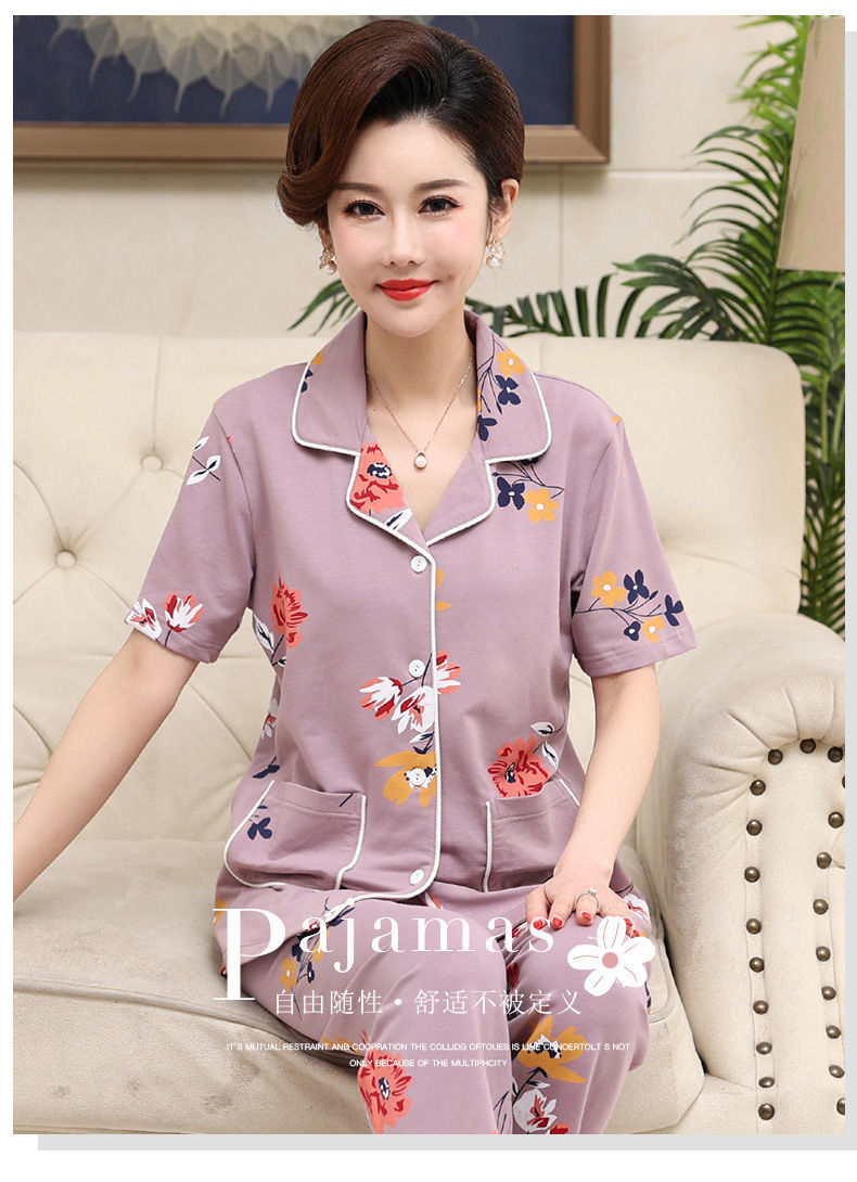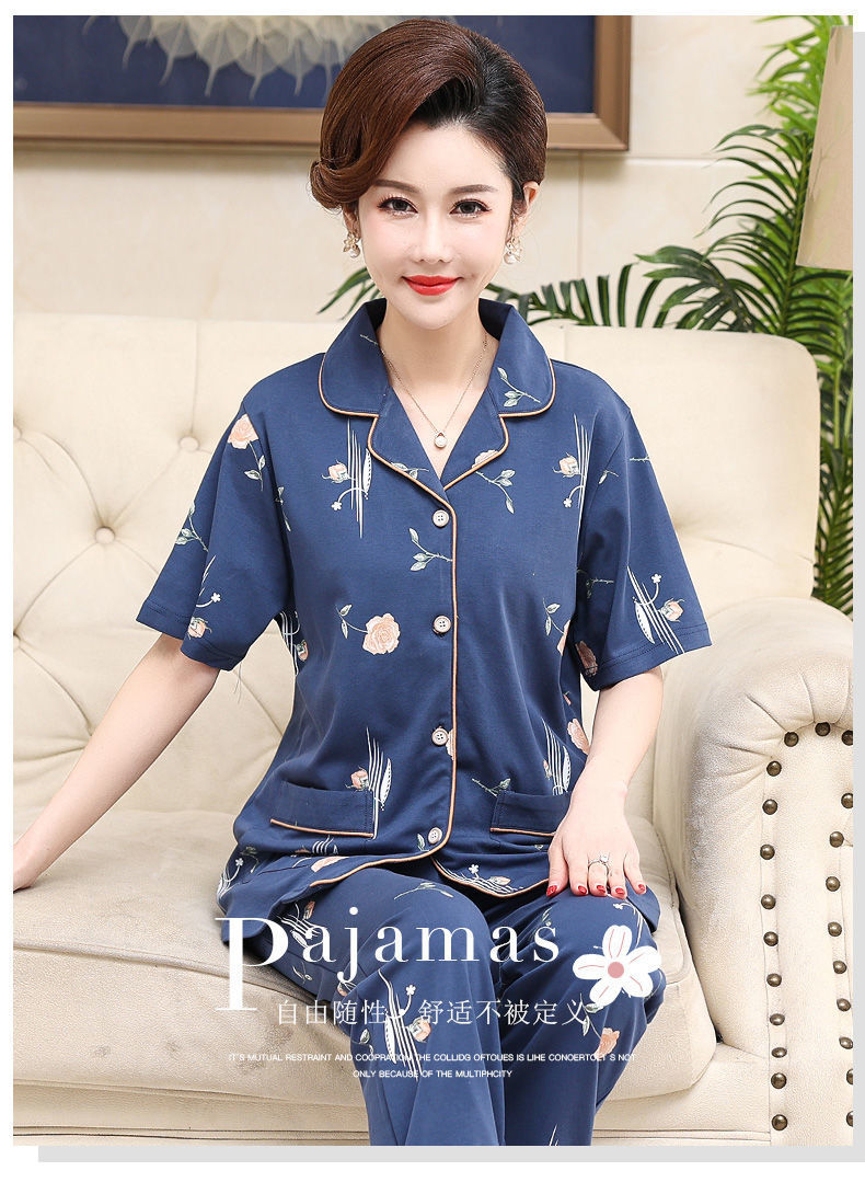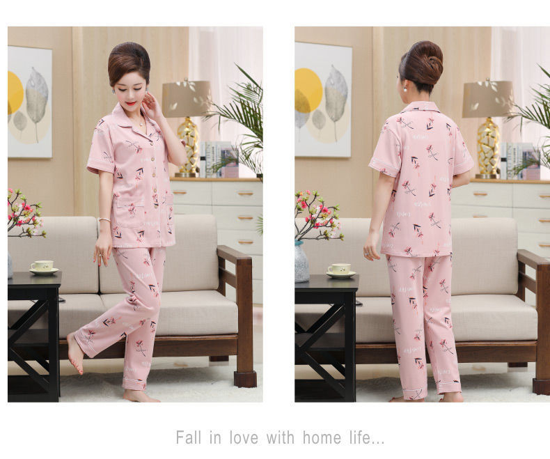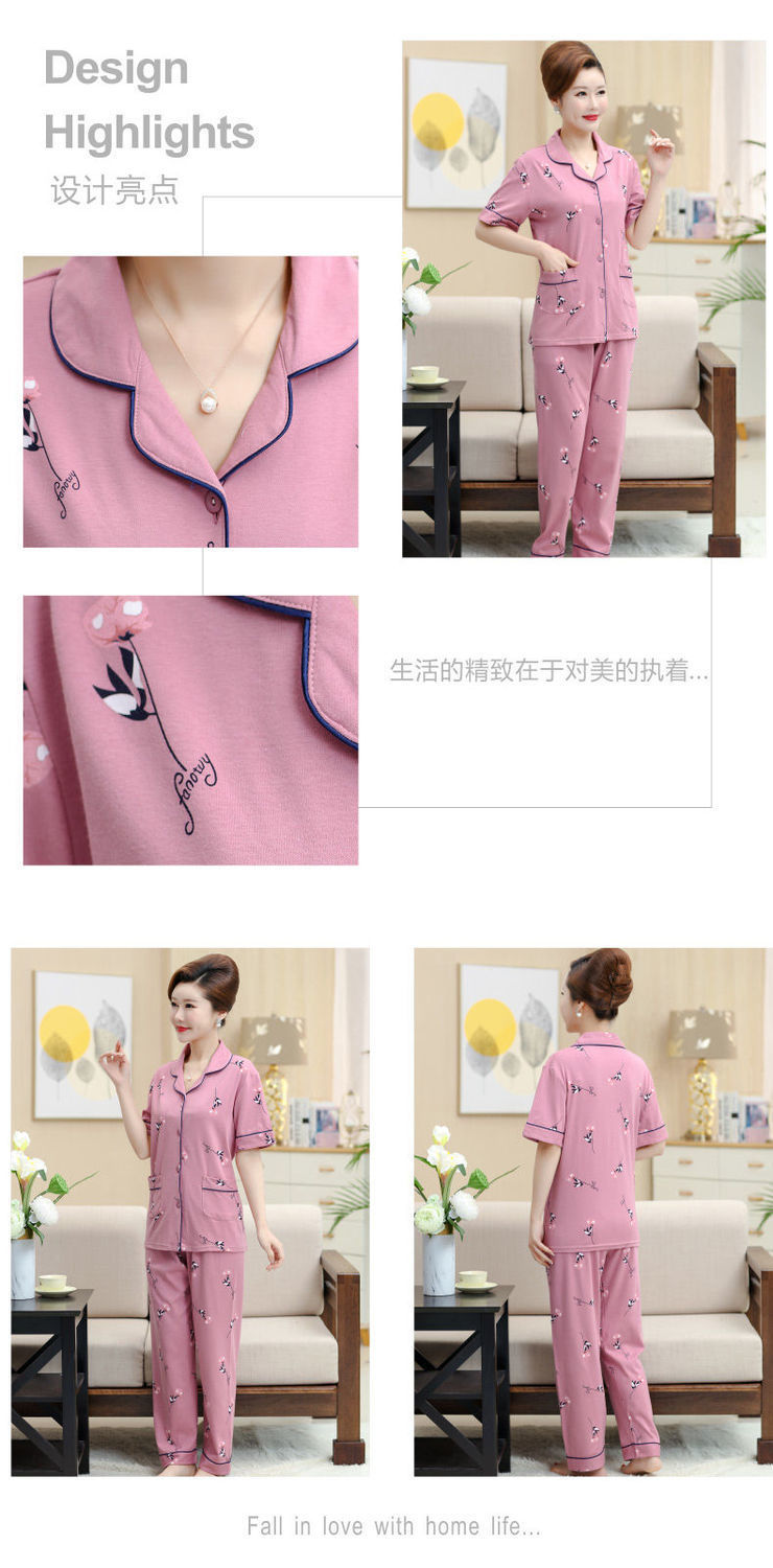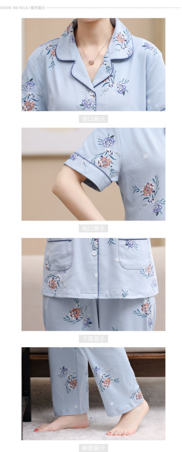 100%纯棉睡衣女夏季短袖长裤中年妈妈,大码开衫套装中老年人家居服LJX-878
