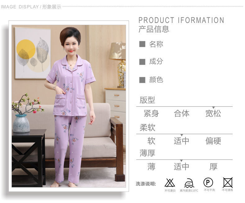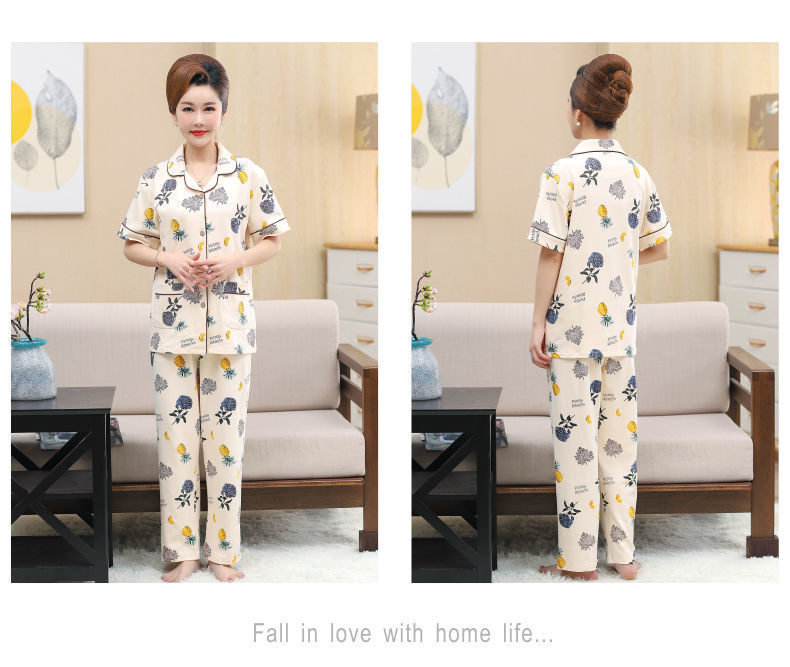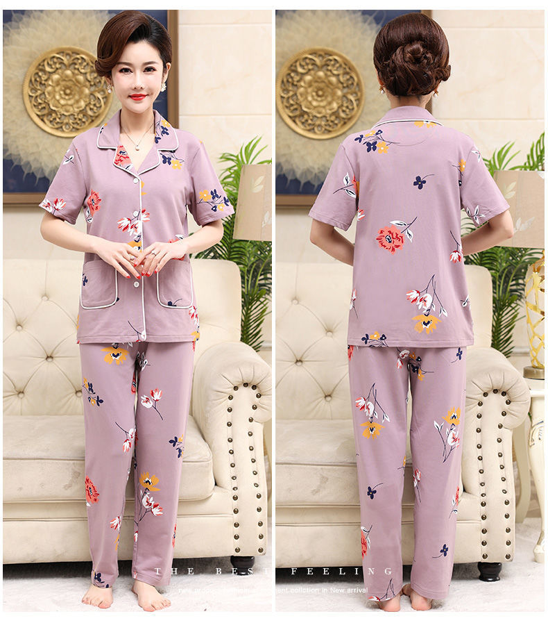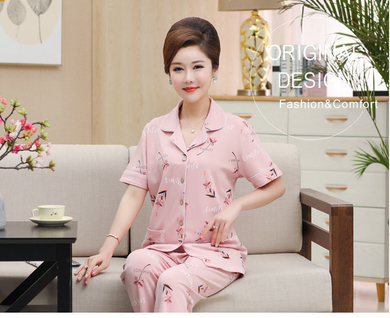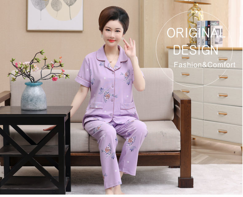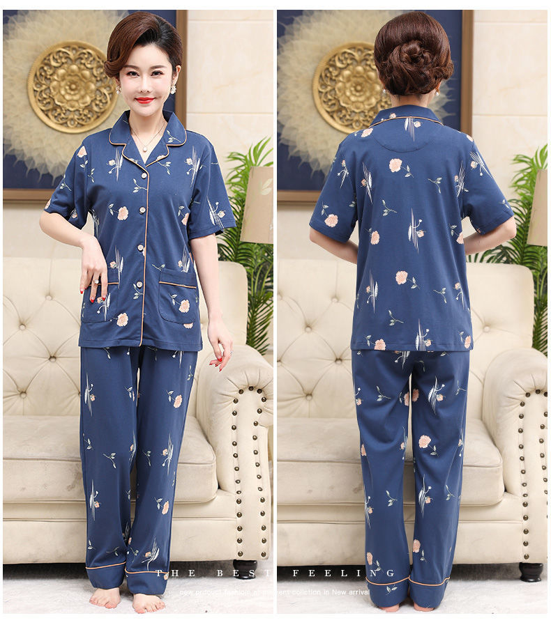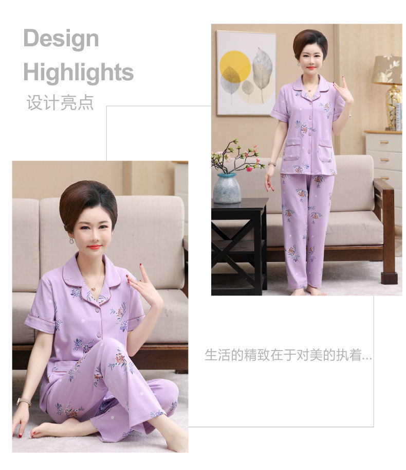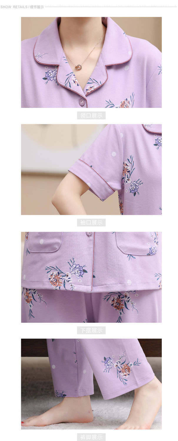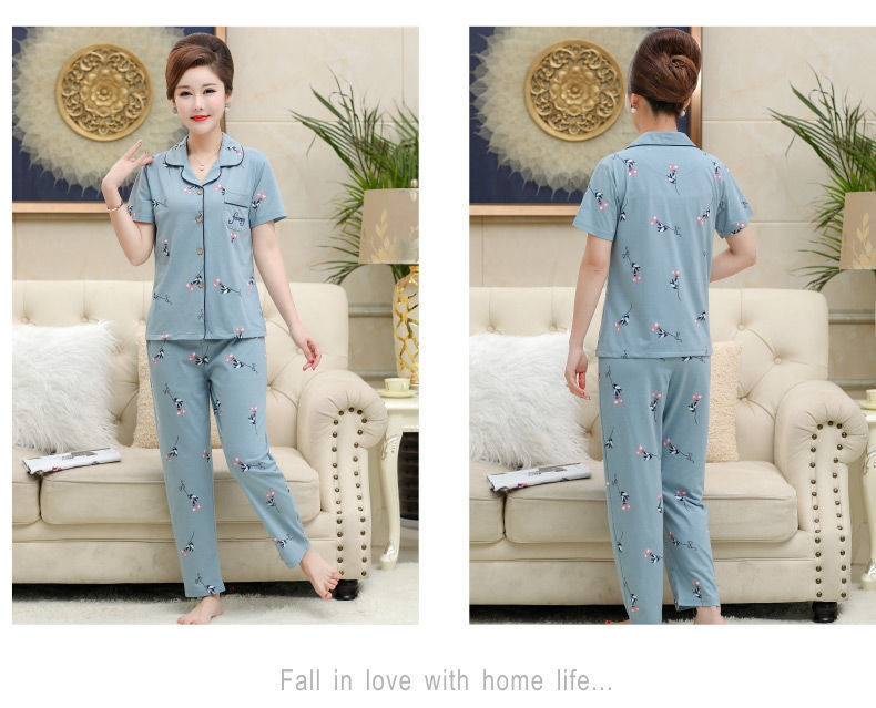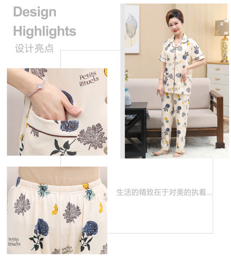 100%纯棉睡衣女夏季短袖长裤中年妈妈,大码开衫套装中老年人家居服LJX-878