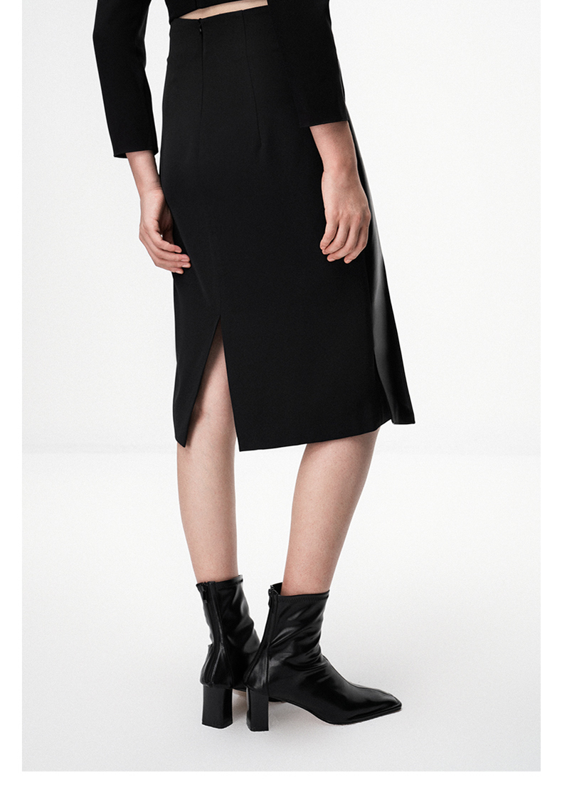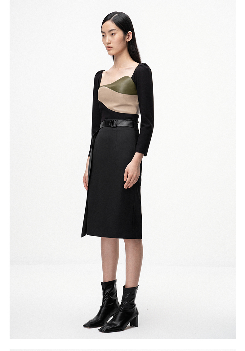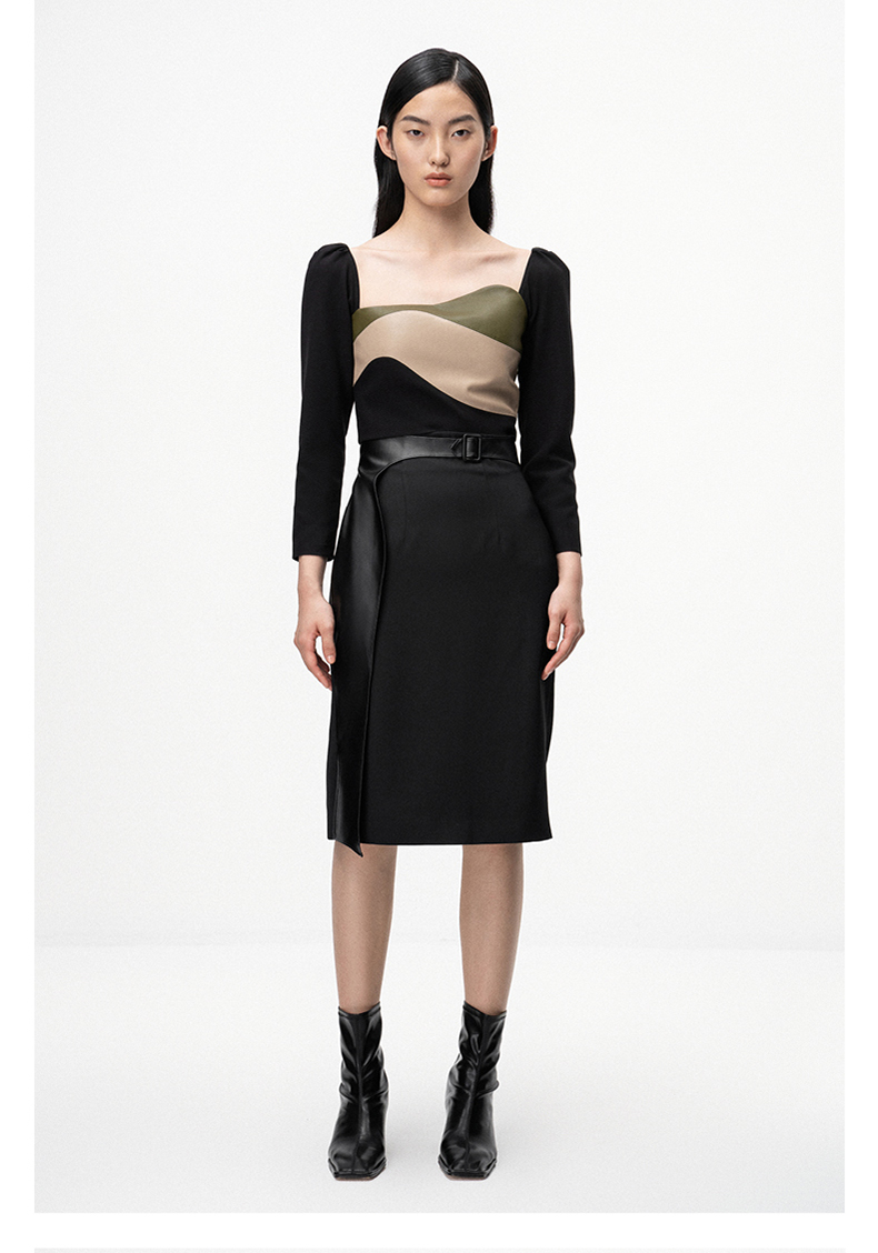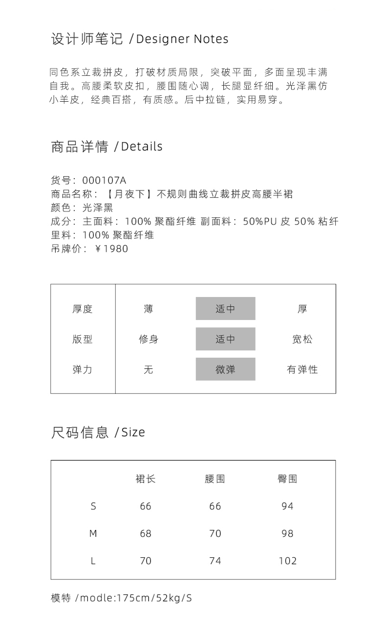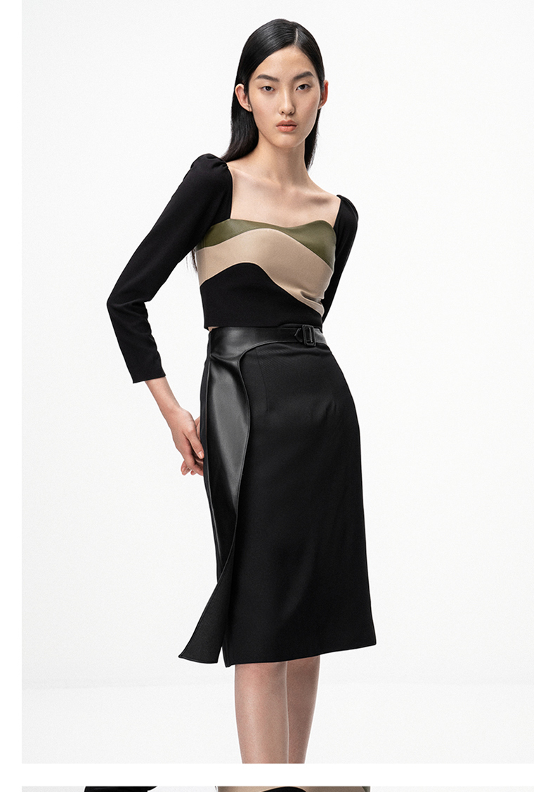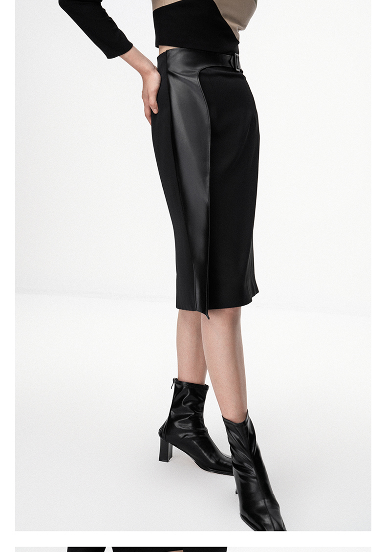 【月夜下】光泽黑不规则曲线立裁拼皮高腰半裙/000107A