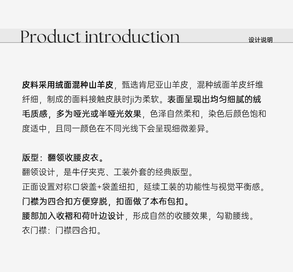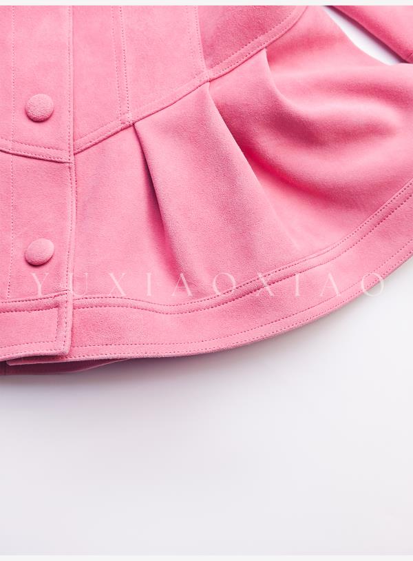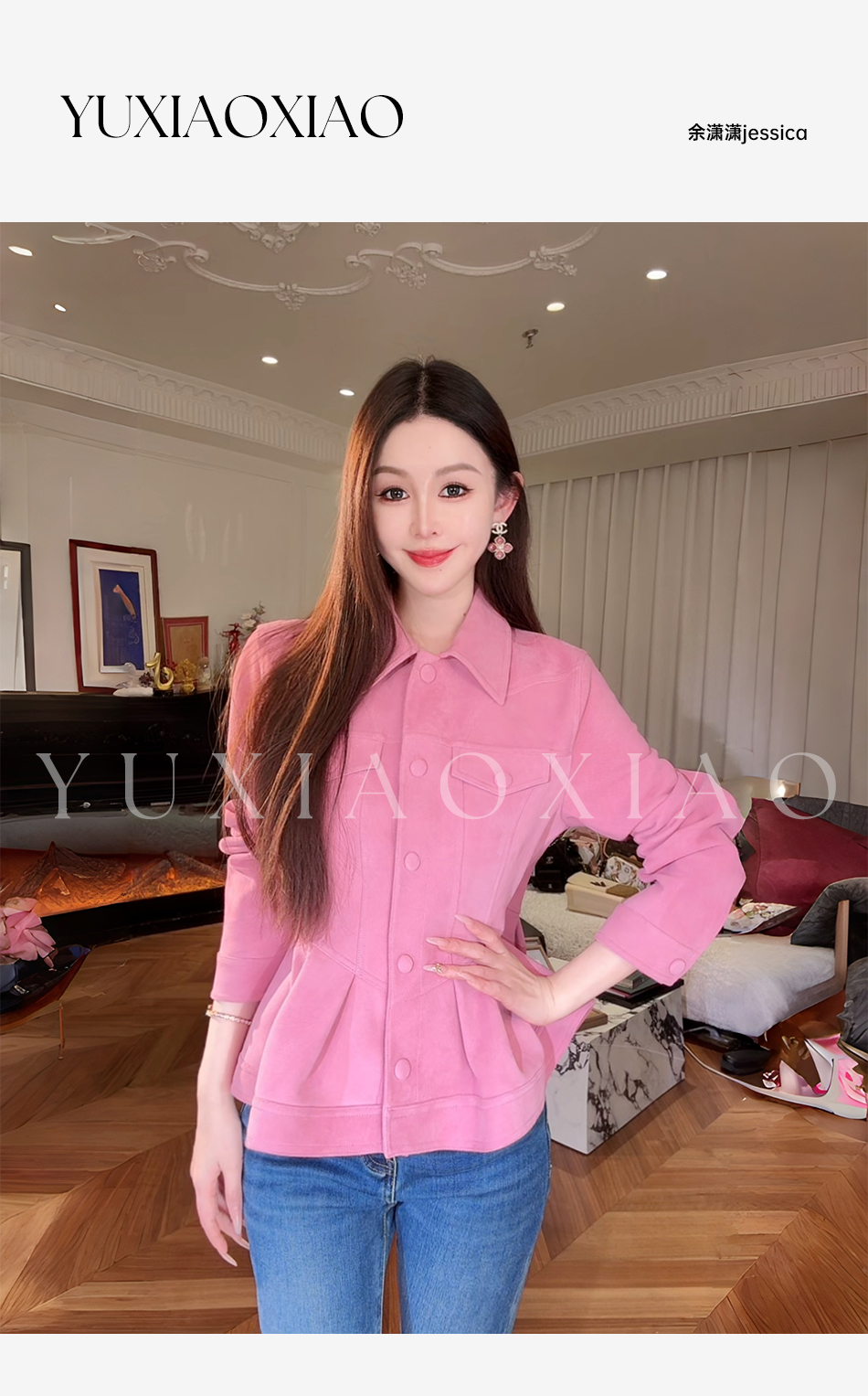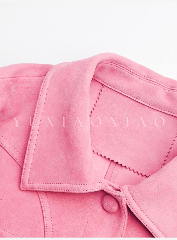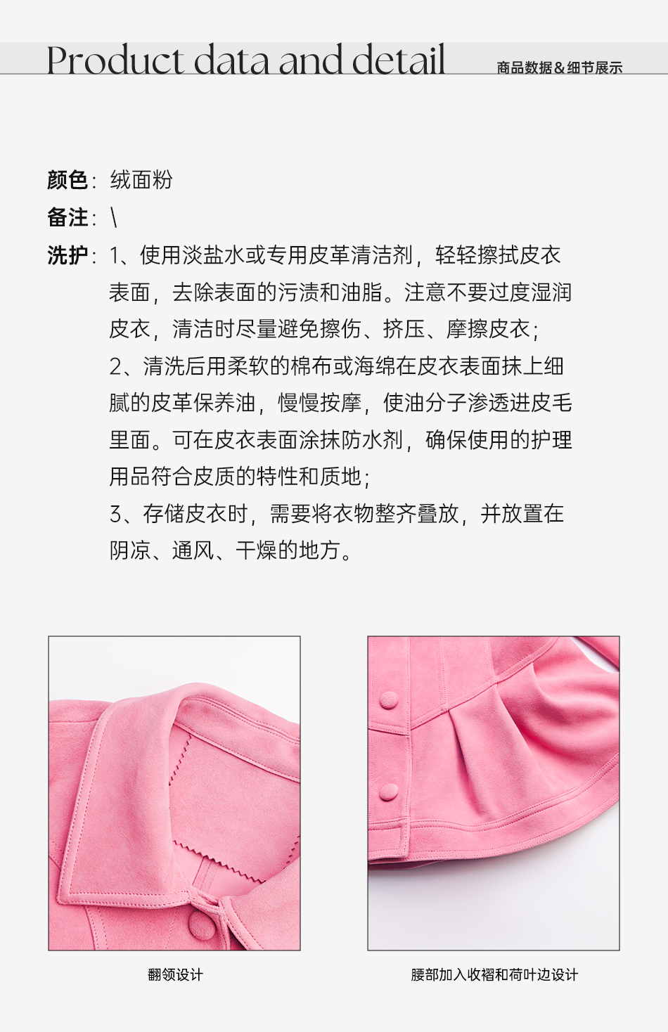 余潇潇【甜蜜冲锋】舒适柔软绒感山羊皮翻领荷叶边收腰皮衣外套女