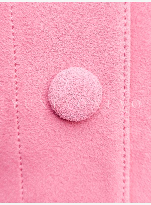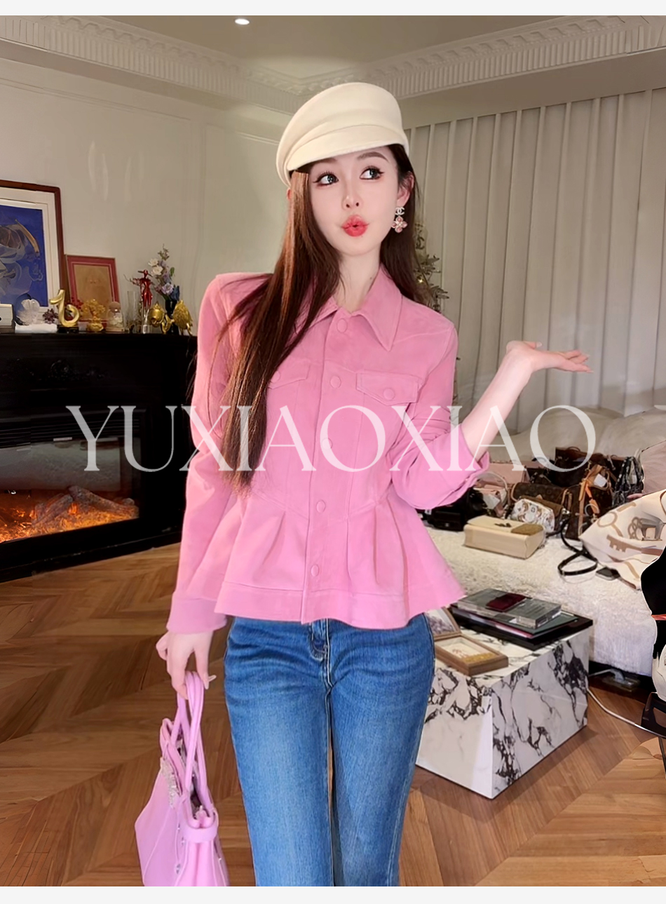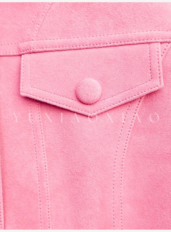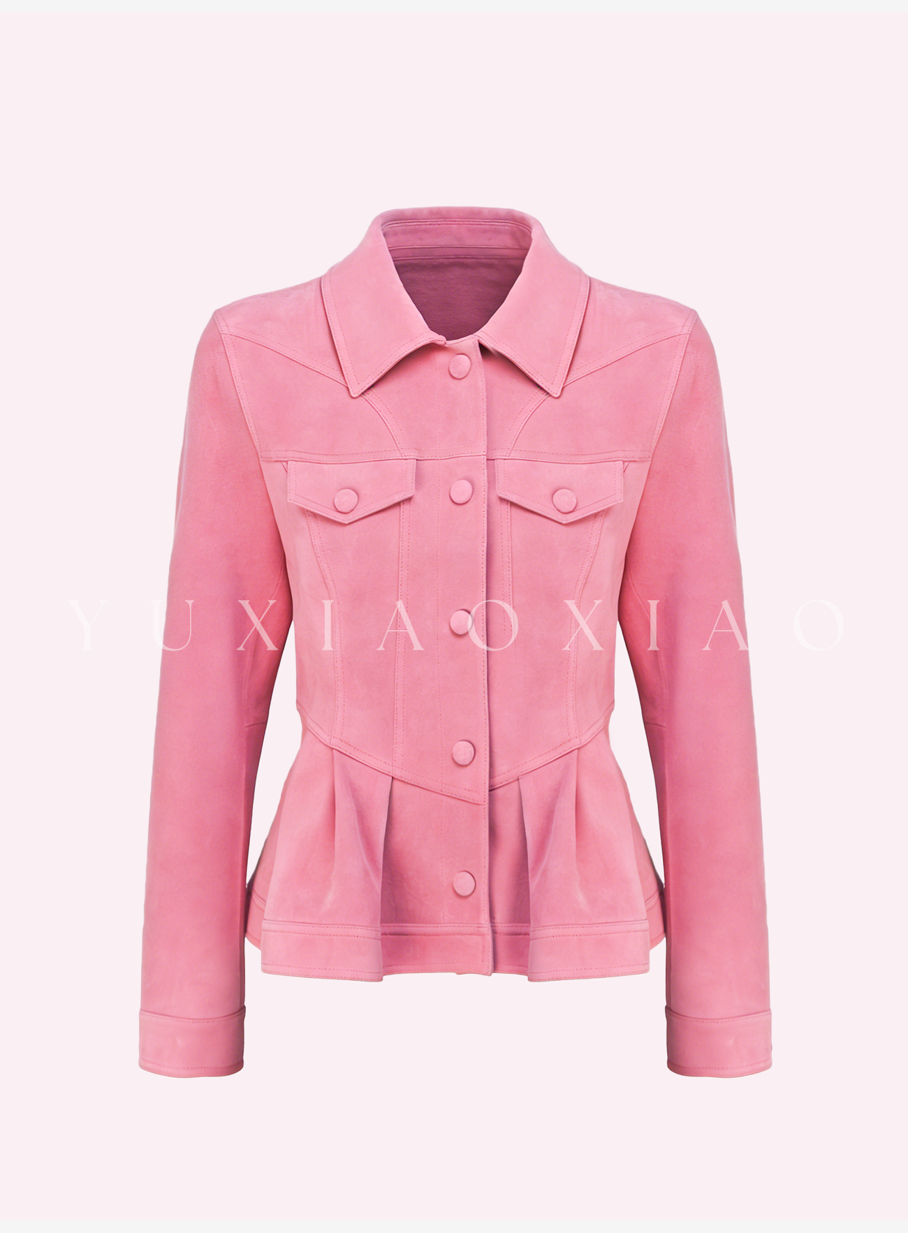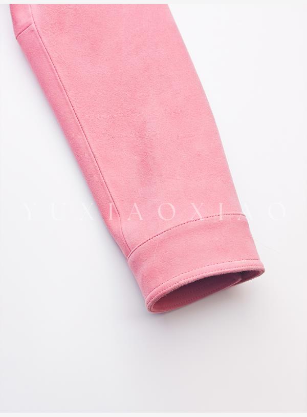 余潇潇【甜蜜冲锋】舒适柔软绒感山羊皮翻领荷叶边收腰皮衣外套女